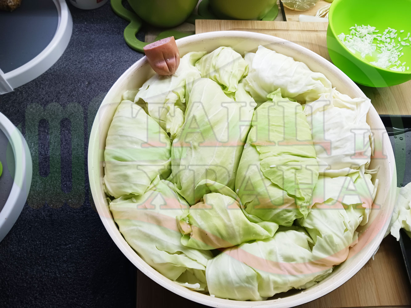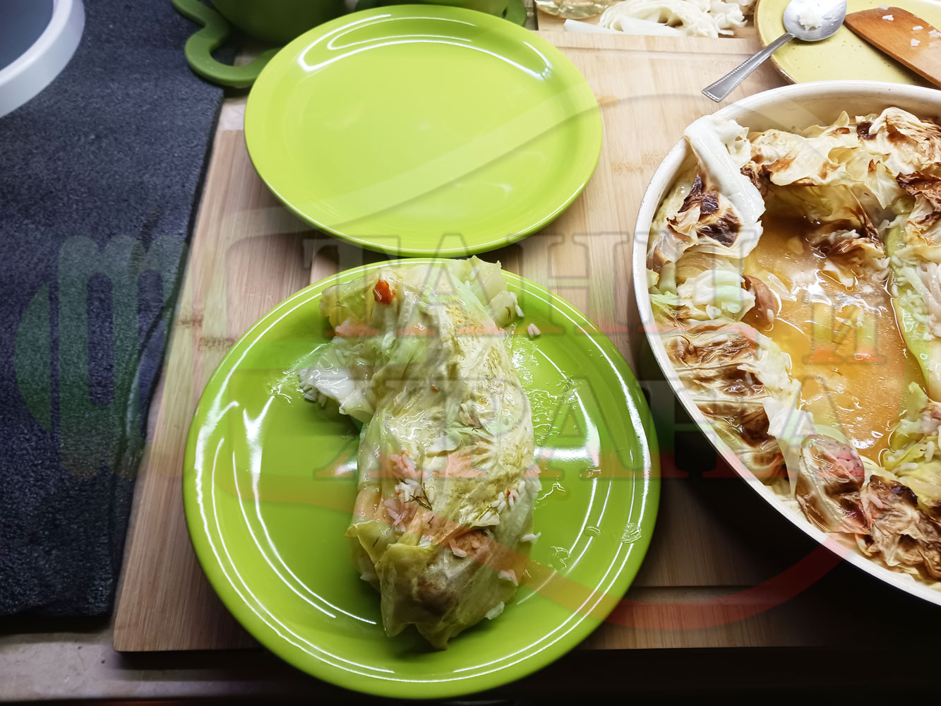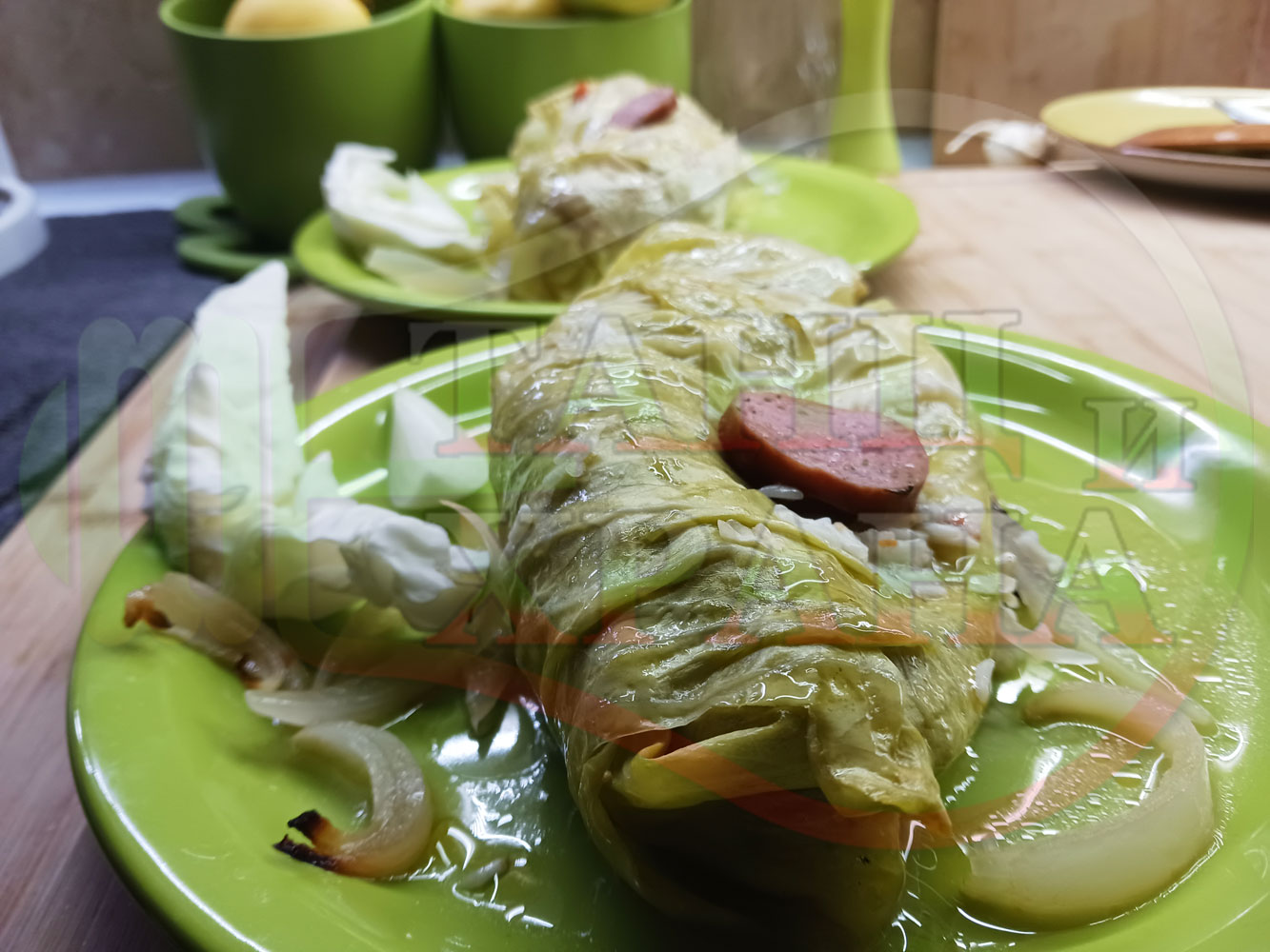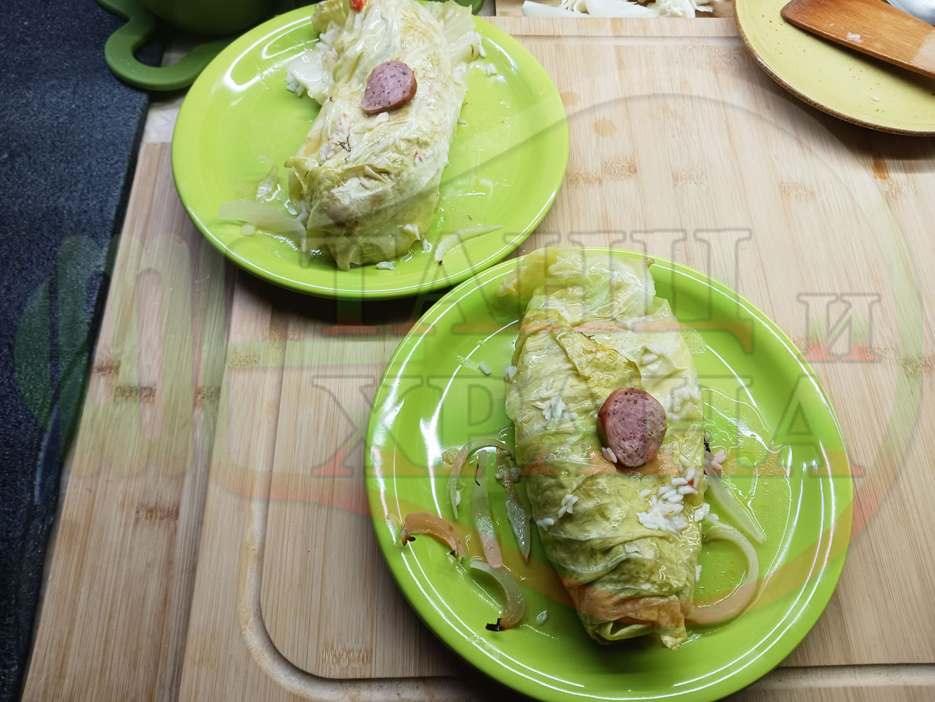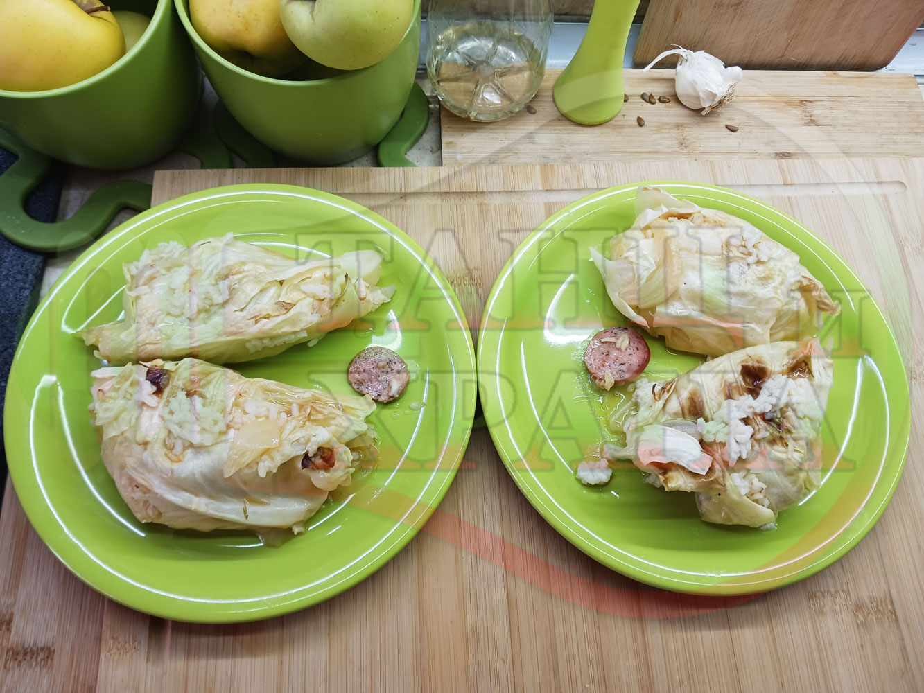 Зелеви големи сарми "Родопсконаденицови оризови кромидлучени" приготвени с прясно зеле и едросмляна лютеница, запечени на фурна с плънка от ориз, краве масло, кромид лук и цели и нарязани парчета от родопска наденица
