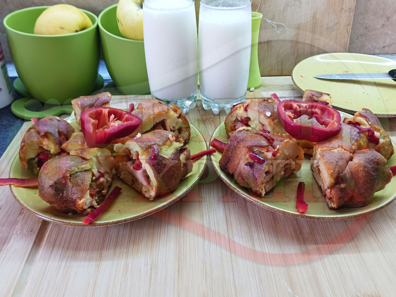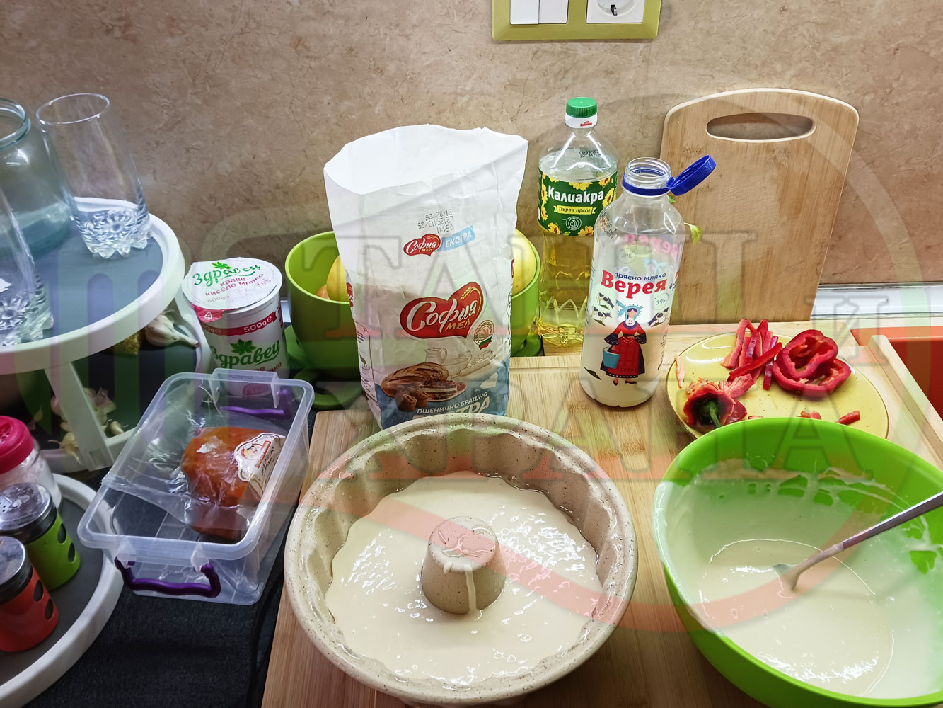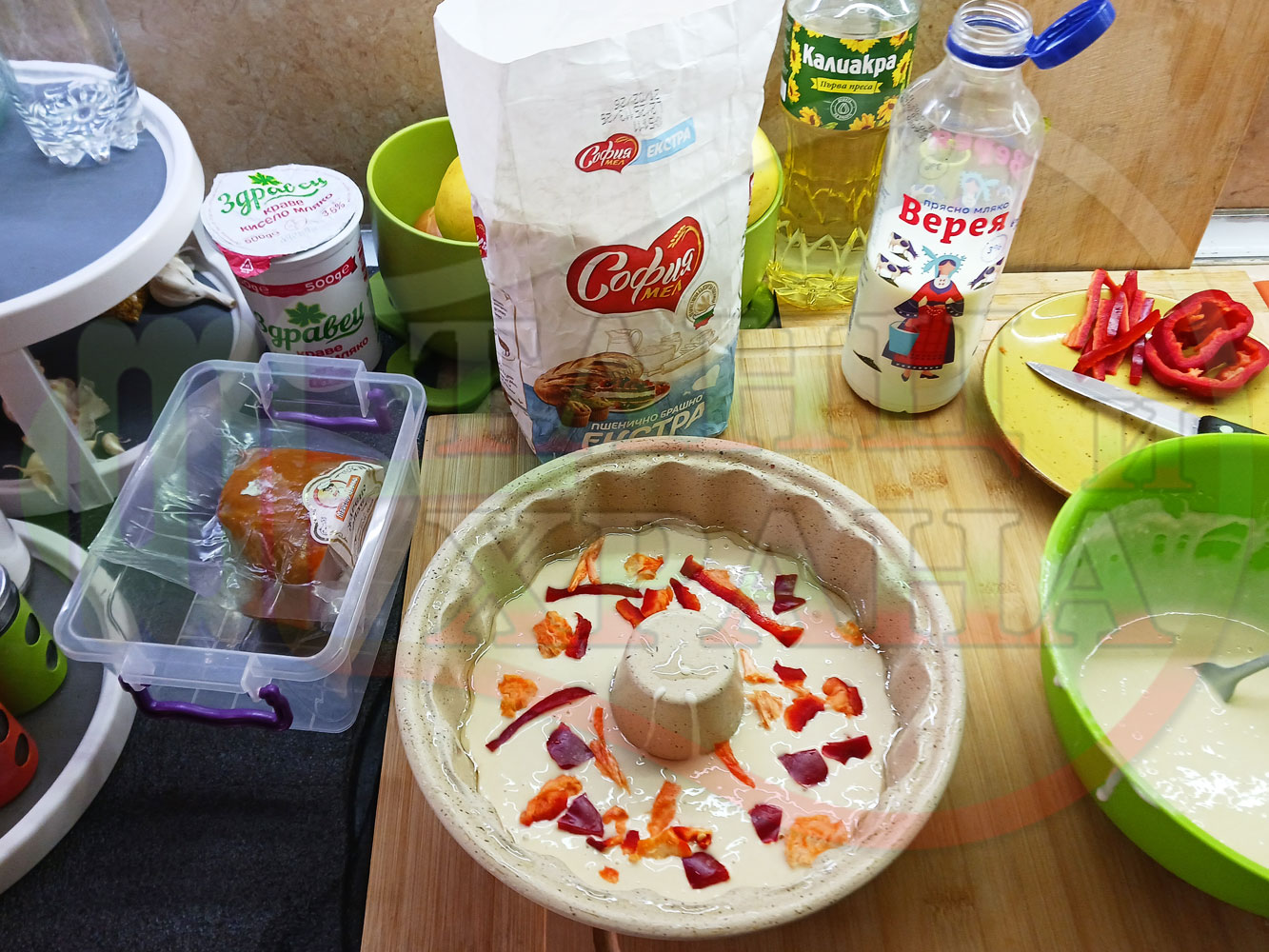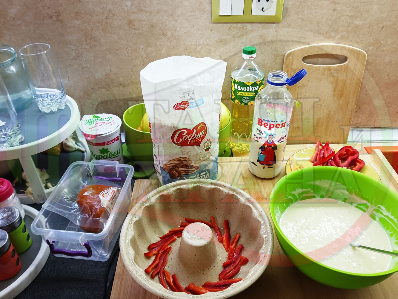 ПРОДУКТИ: Приблизителни количества за колбасов солен кекс "Филежарен червеночушковопиперен с БГсирене" изпечен на фурна с плънка от жарено филе, червени пресни чушки, червен сладък пипер и краве бяло сирене (българско, саламурено) омесен с прясно краве мляко и яйца