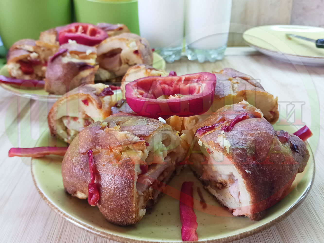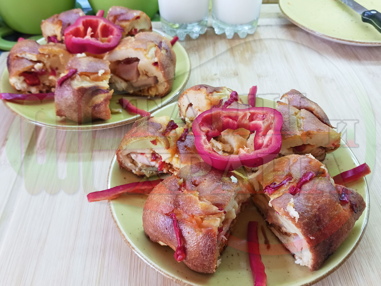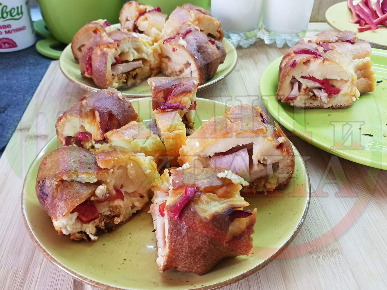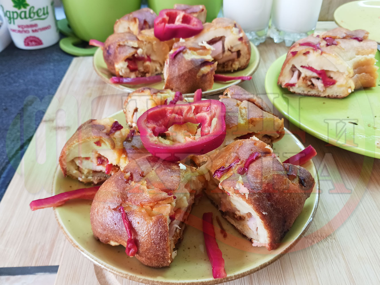 Колбасов солен кекс "Филежарен червеночушковопиперен с БГсирене" изпечен на фурна с плънка от жарено филе, червени пресни чушки, червен сладък пипер и краве бяло сирене (българско, саламурено) омесен с прясно краве мляко и яйца
