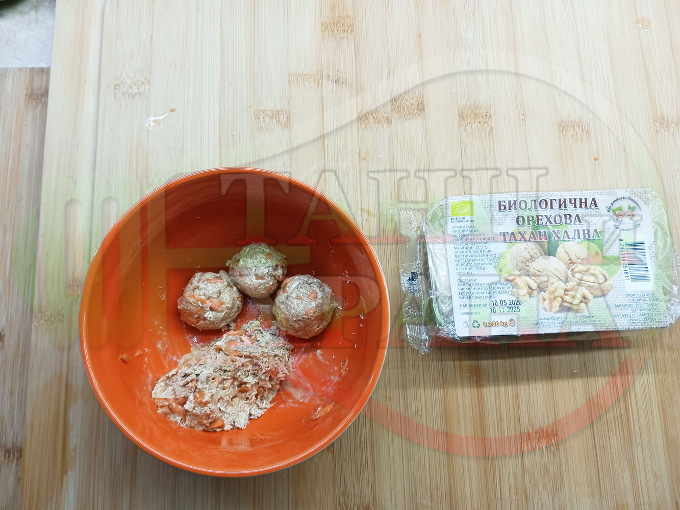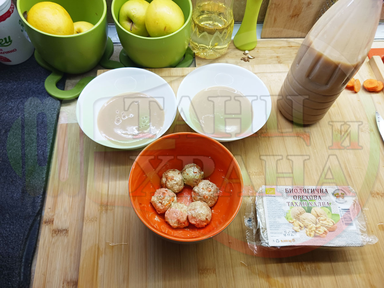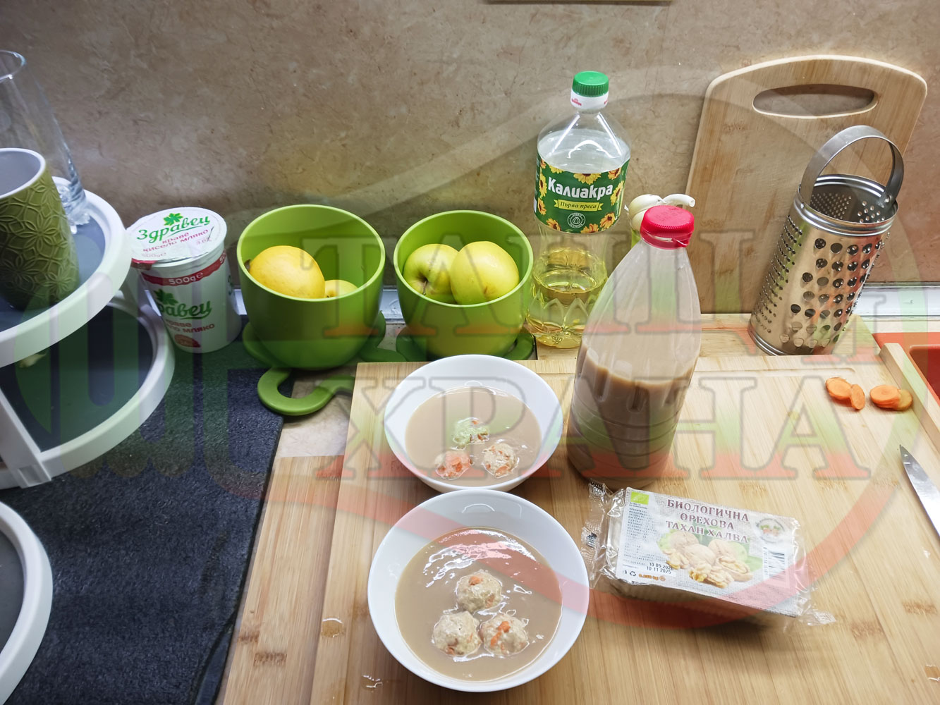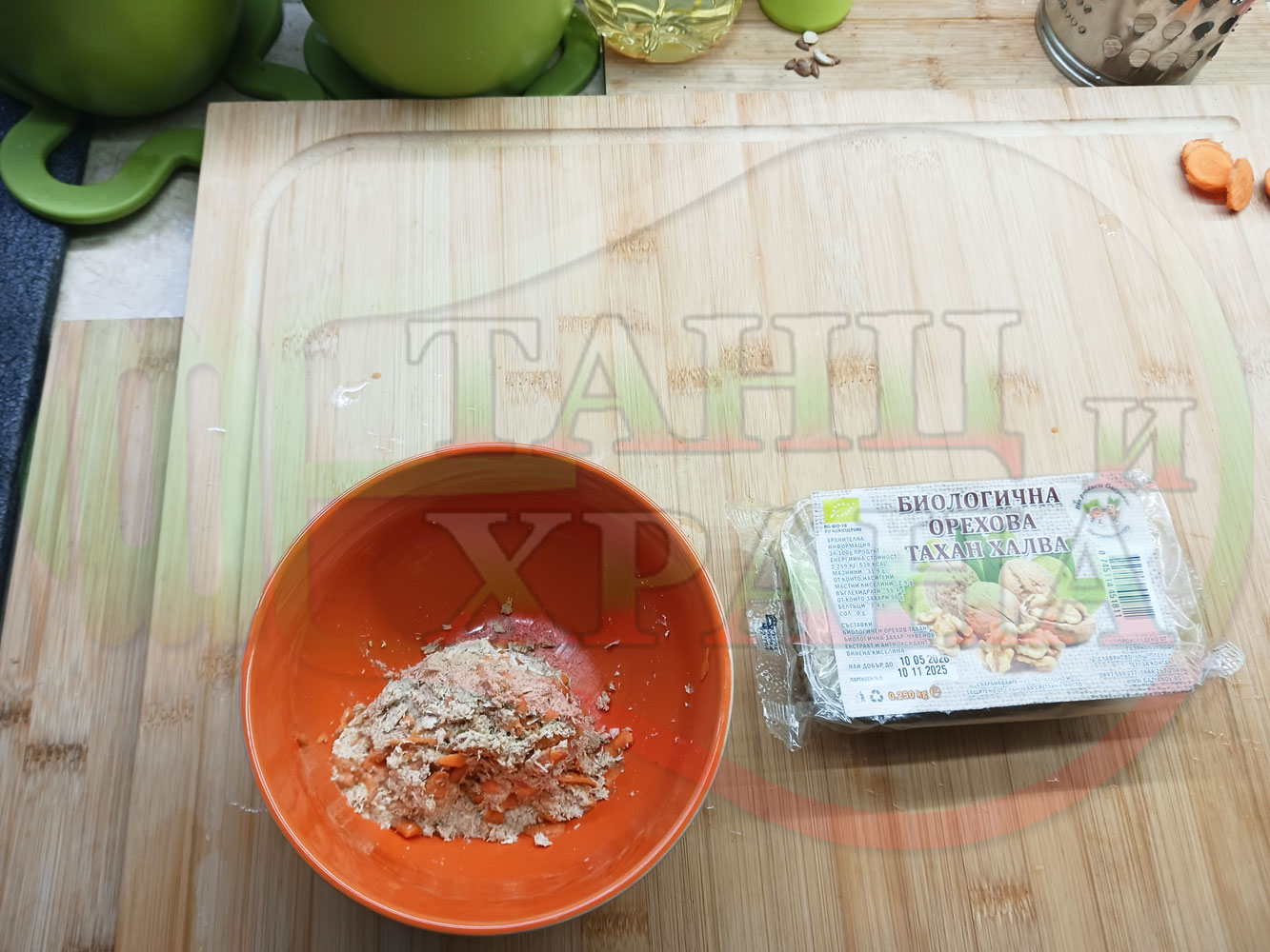 ПРОДУКТИ: Приблизителни количества за българска бозова сурова сладка супа "Бозаджийноморковена халвяноорехова" приготвена от боза гарнирана с топчета от халвяно морковен крем с пресни моркови и тахан халва с орехи подходяща за постещи хора - двукомпонентна