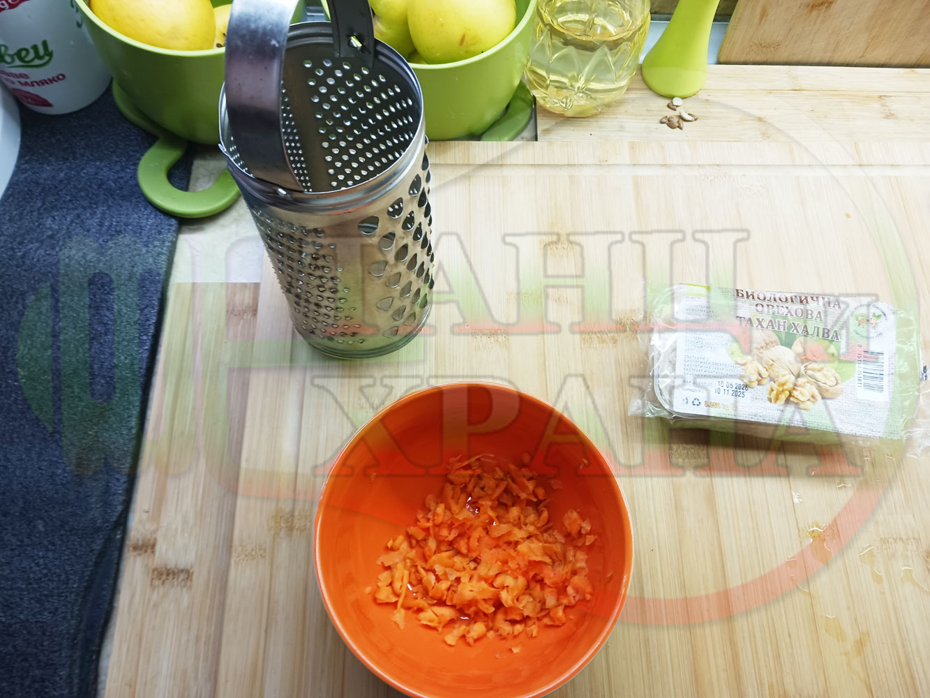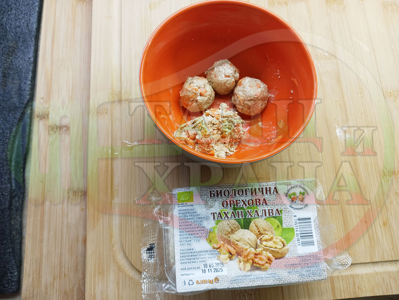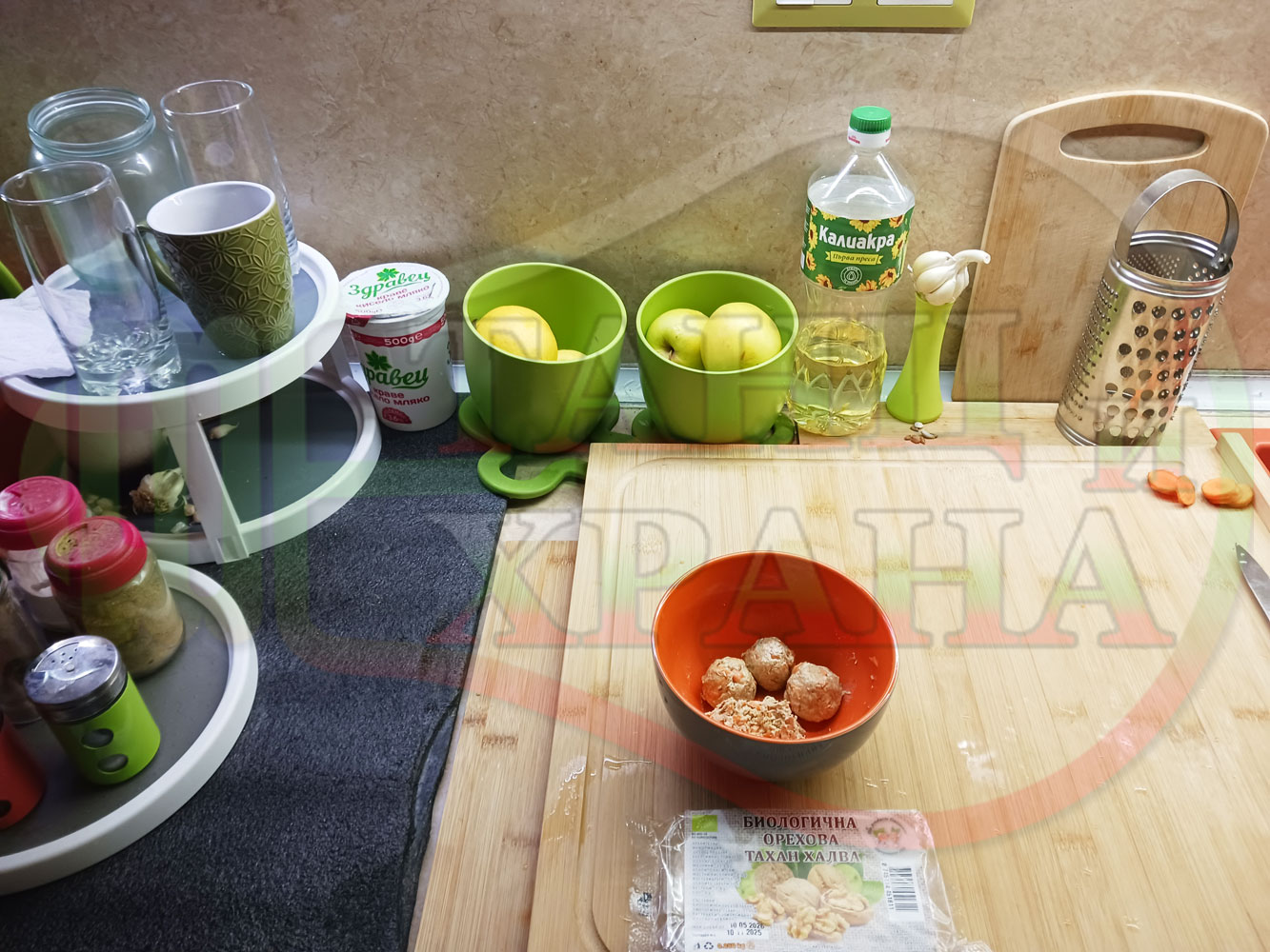 ПРОДУКТИ: Приблизителни количества за българска бозова сурова сладка супа "Бозаджийноморковена халвяноорехова" приготвена от боза гарнирана с топчета от халвяно морковен крем с пресни моркови и тахан халва с орехи подходяща за постещи хора - двукомпонентна