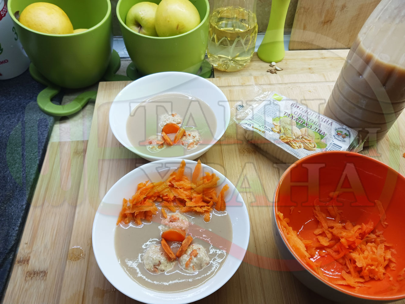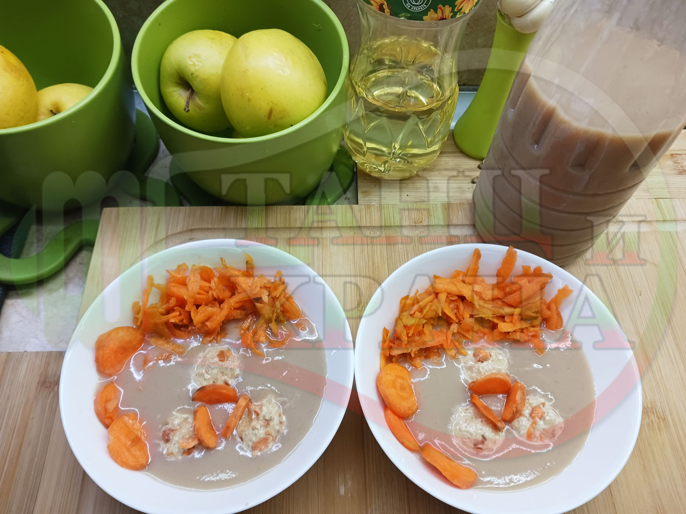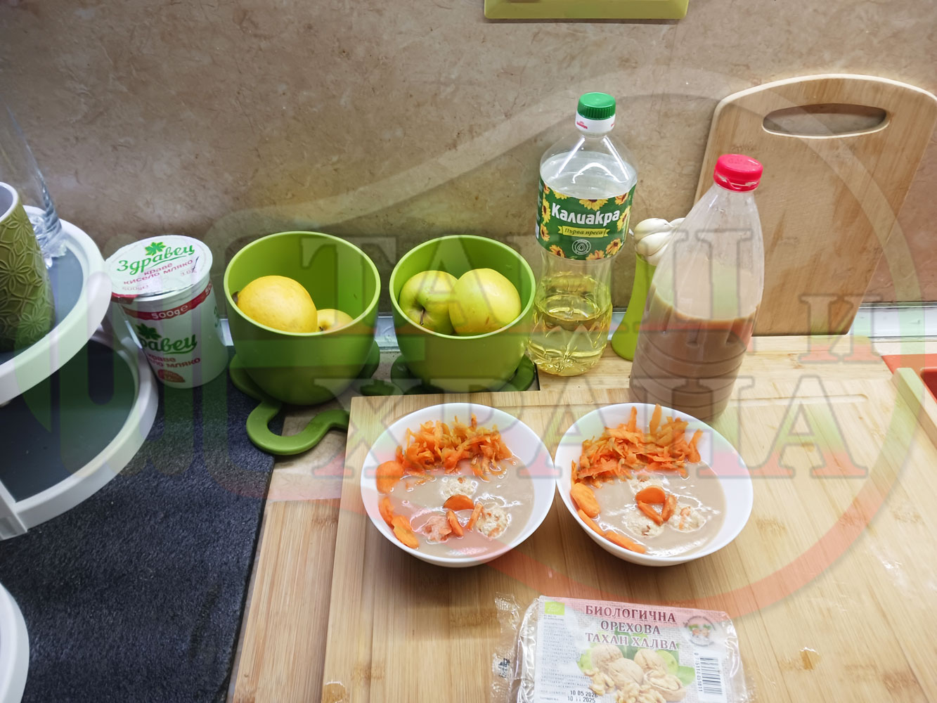 Българска бозова сурова сладка супа "Бозаджийноморковена халвяноорехова" приготвена от боза гарнирана с топчета от халвяно морковен крем с пресни моркови и тахан халва с орехи подходяща за постещи хора - двукомпонентна