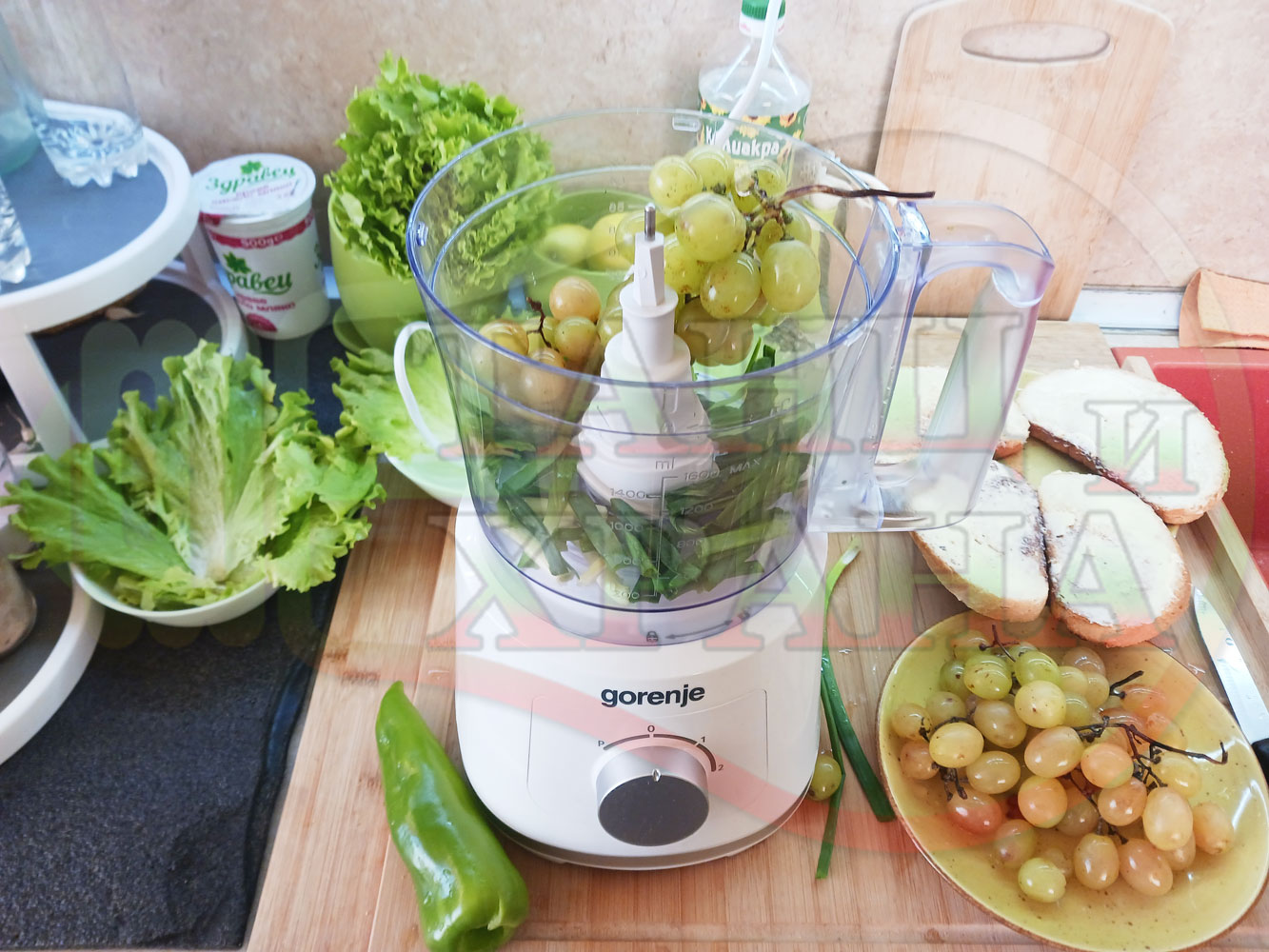 Измийте гроздето, почистете го от гроздовата чепка и семките и го сипете в чопър заедно с измития и нарязан на едро пресен лук (заделете част от перцата на лука и запазете по-хубави, големи и цели зърна от гроздето за гарниране и украса). Измийте чушката, почистете я от семките чрез т.нар. "изтърбушване", нарежете я на едро и я сипете в чопъра (нарежете част от чушката на "обръчи" и запазете връхчетата за украса). Разбийте с чопъра продуктите до образуване на средно гъста гроздова зеленочушковолучена, хомогенизирана супа с пресен лук и зелени пресни чушки (гроздова супа).