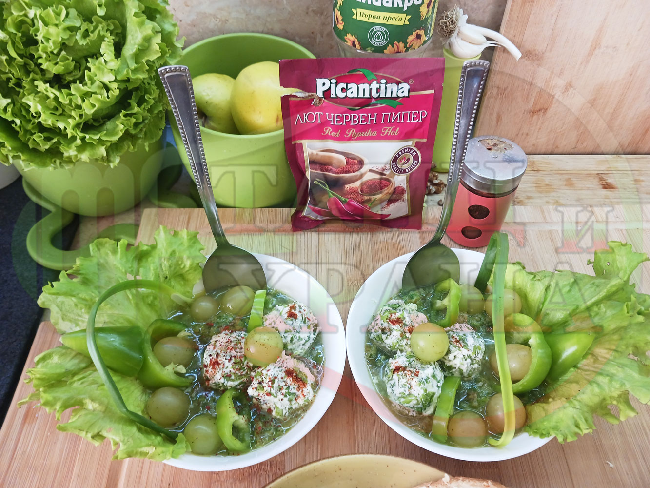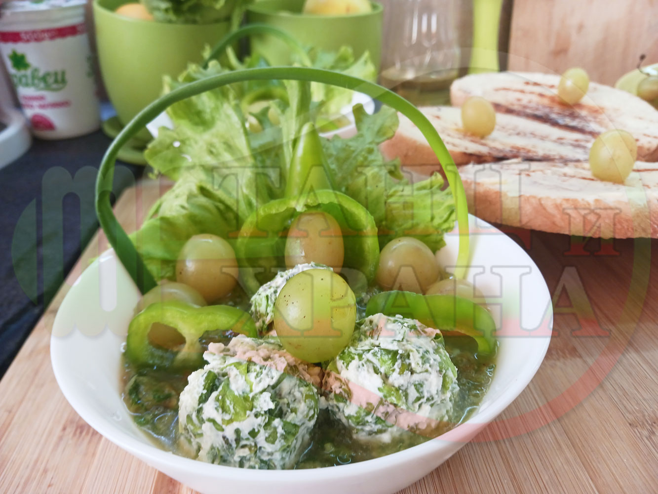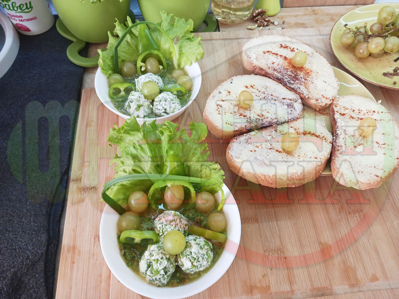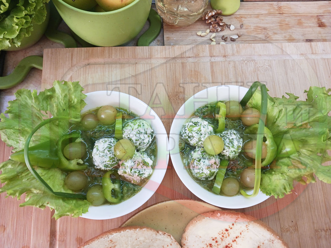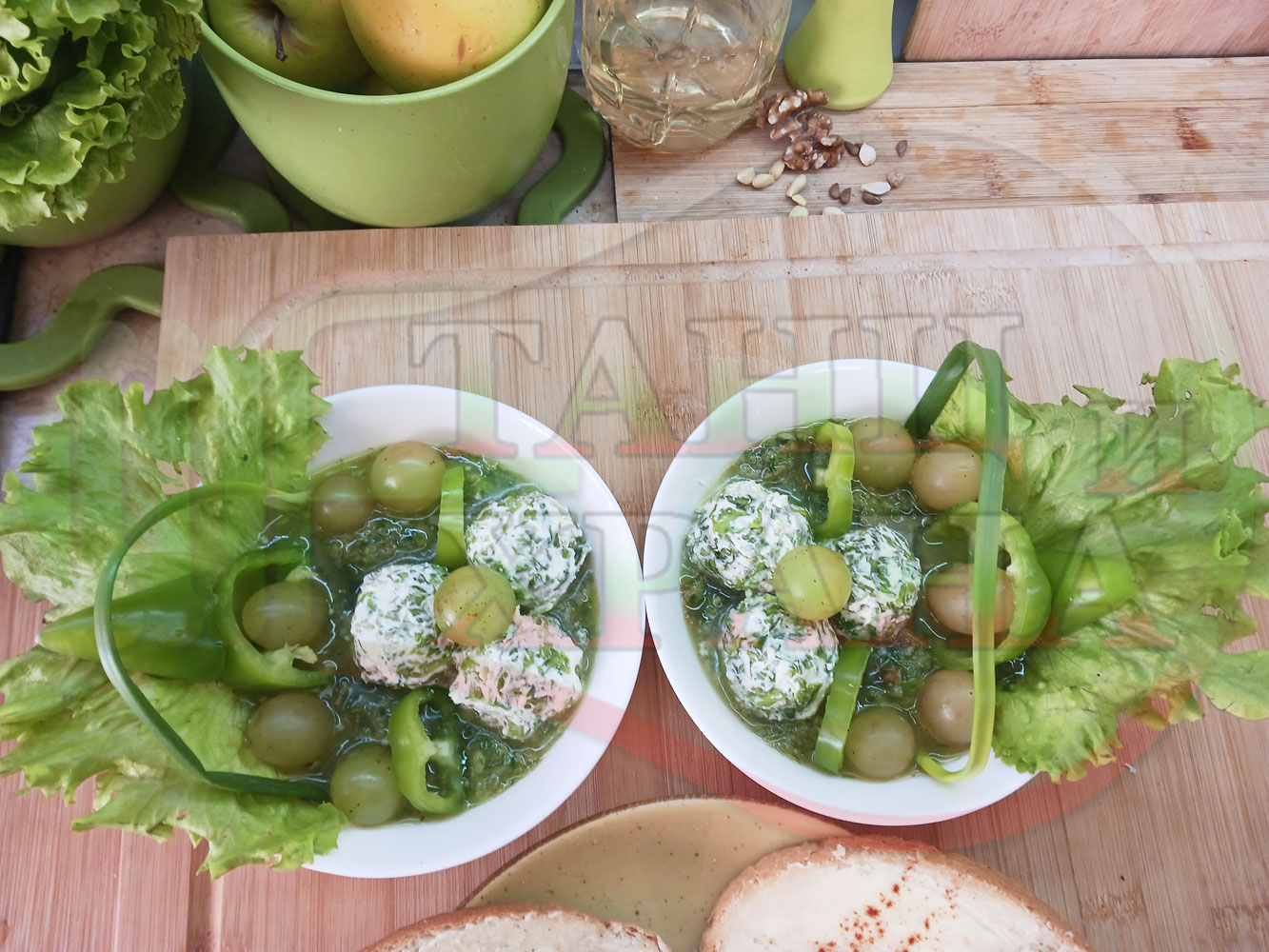 Българска студена сурова сладко солена супа "Гроздова зеленочушковолучена марулена с БГсирене" приготвена с прясно грозде, зелен лук и зелени пресни чушки гарнирана с топчета от сиреново марулен крем от маруля и краве бяло сирене - двукомпонентна