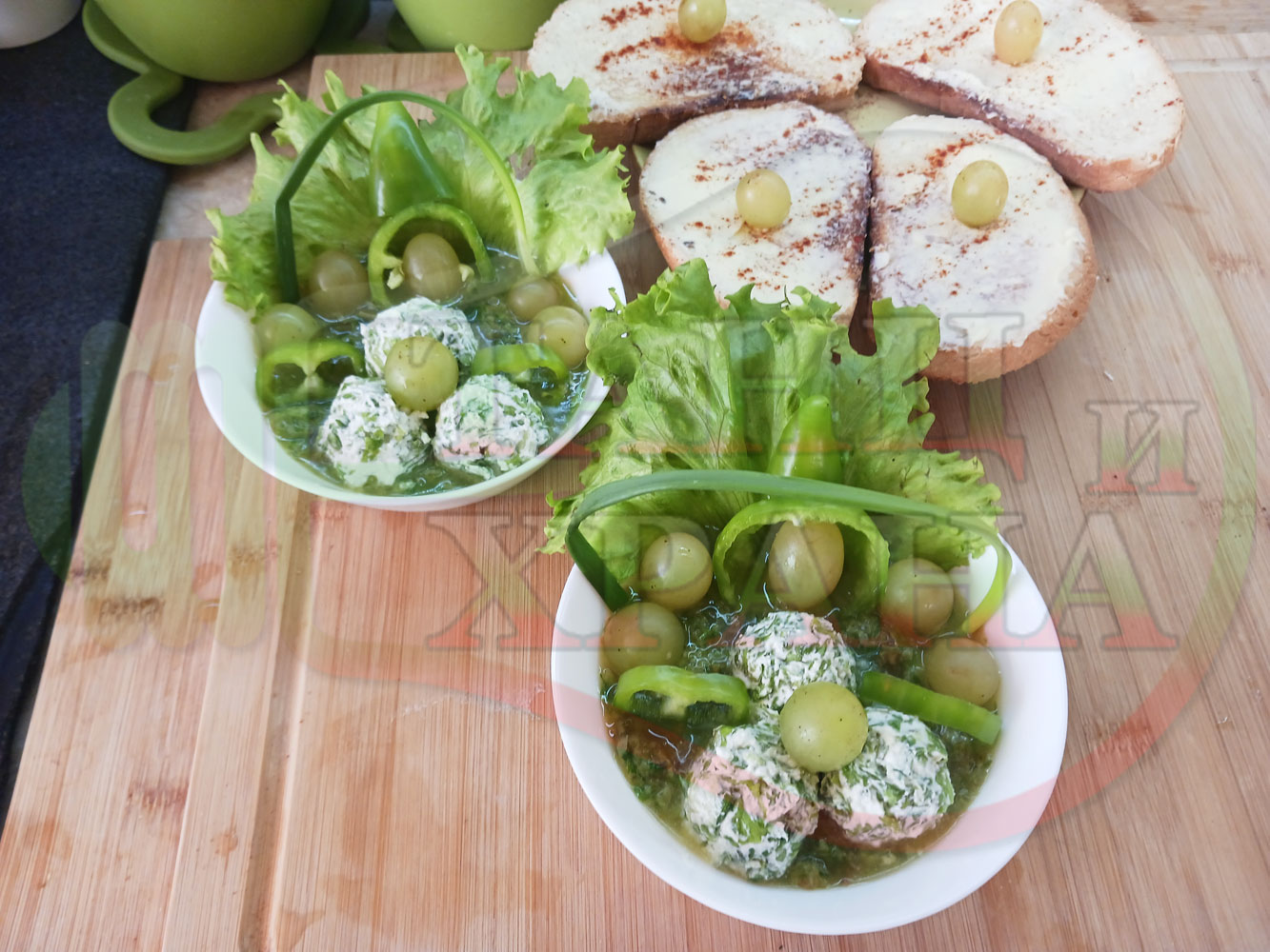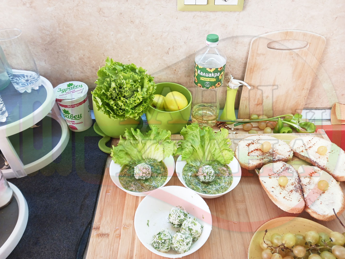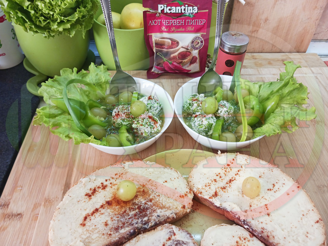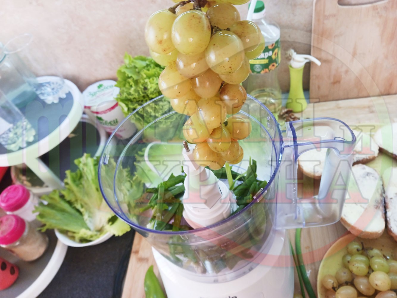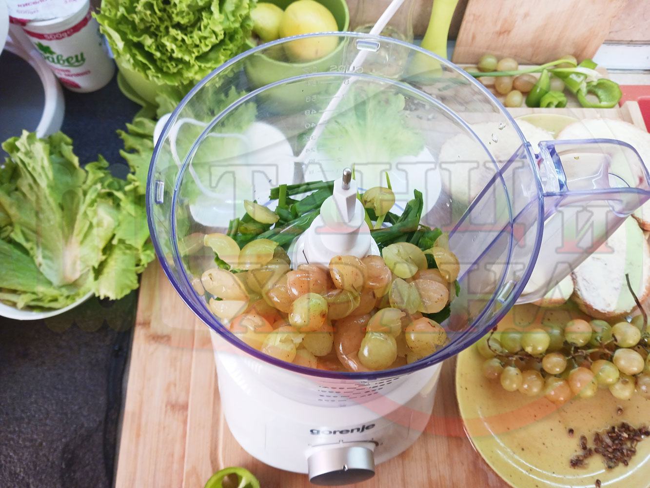 Българска студена сурова сладко солена супа "Гроздова зеленочушковолучена марулена с БГсирене" приготвена с прясно грозде, зелен лук и зелени пресни чушки гарнирана с топчета от сиреново марулен крем от маруля и краве бяло сирене - двукомпонентна