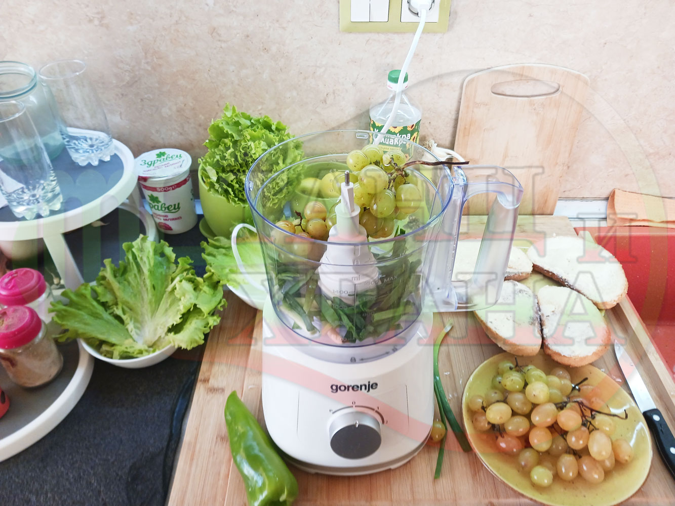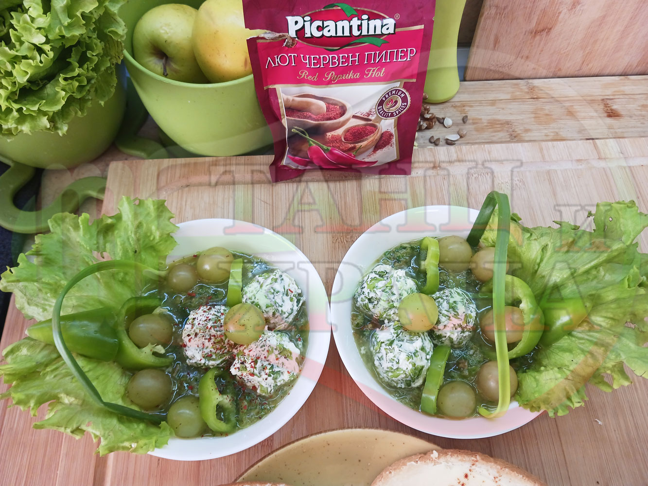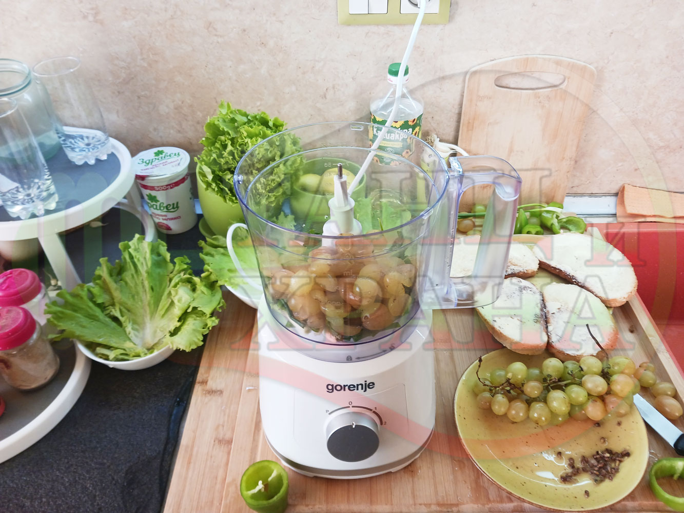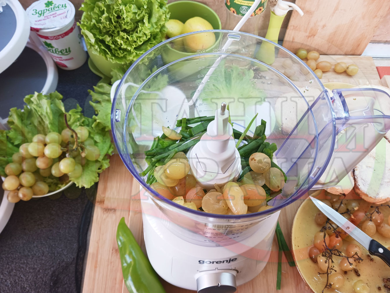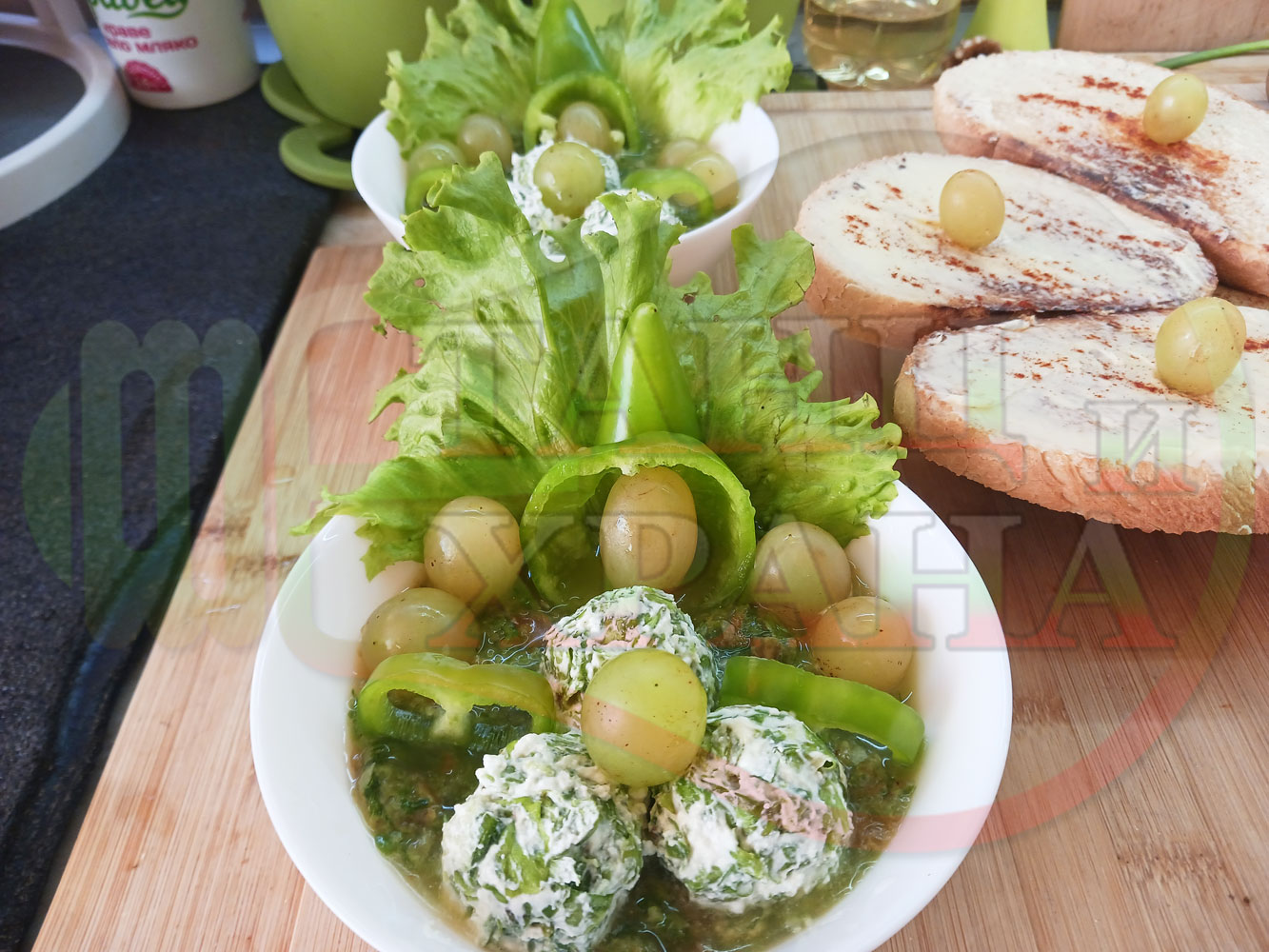 Българска студена сурова сладко солена супа "Гроздова зеленочушковолучена марулена с БГсирене" приготвена с прясно грозде, зелен лук и зелени пресни чушки гарнирана с топчета от сиреново марулен крем от маруля и краве бяло сирене - двукомпонентна