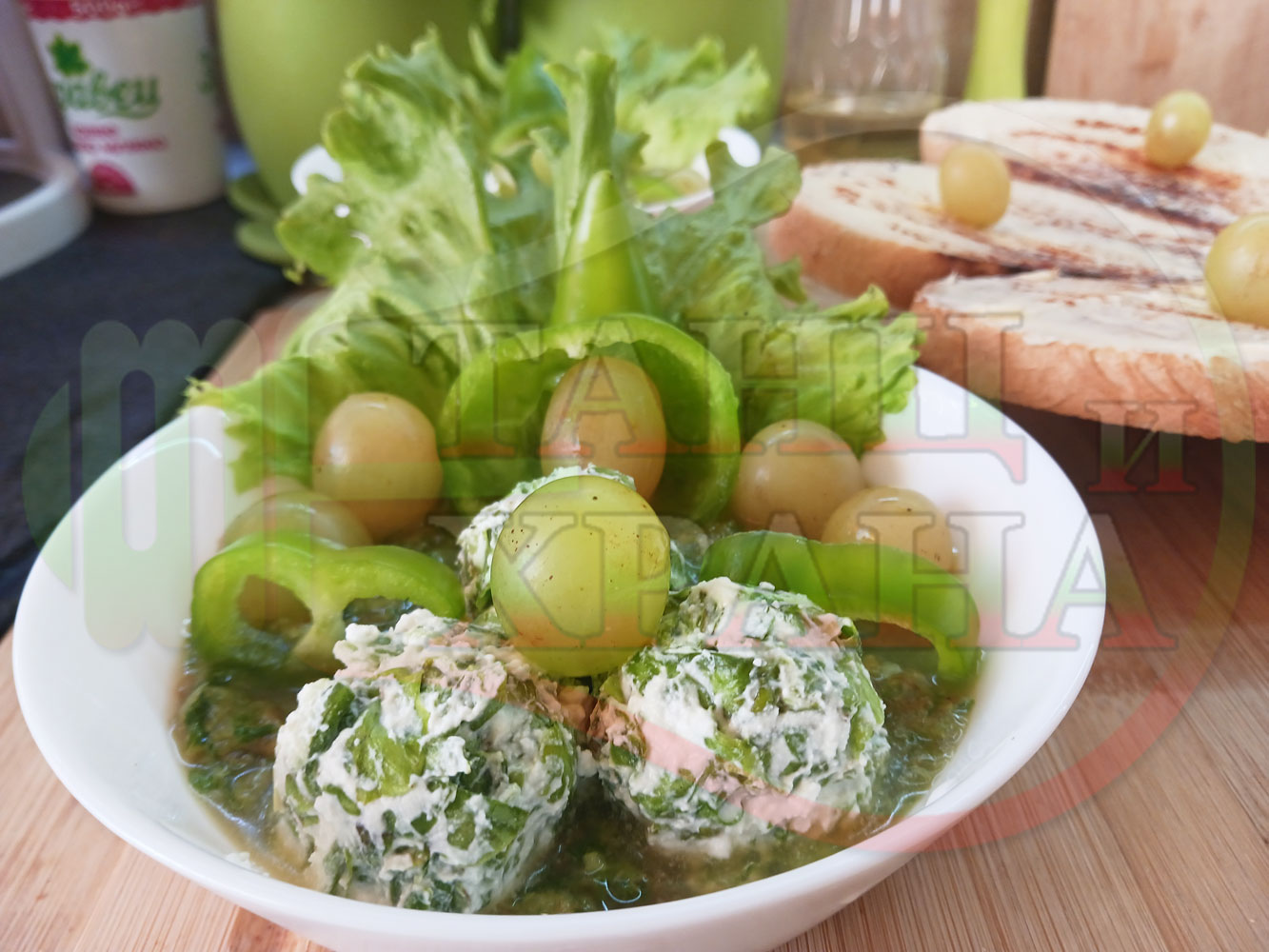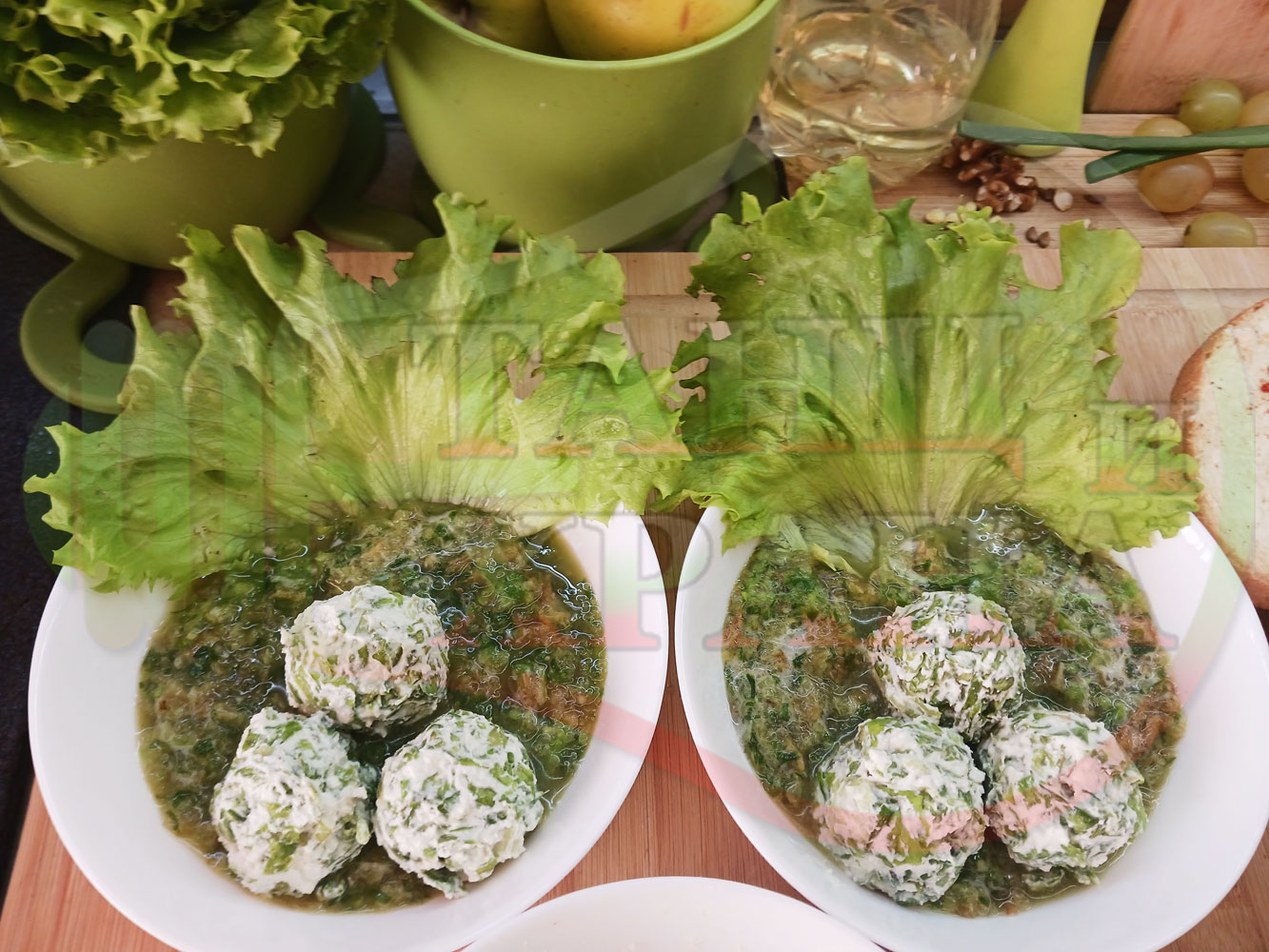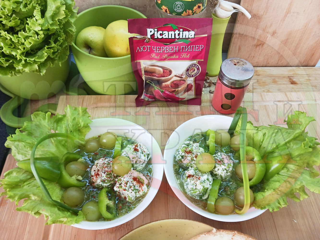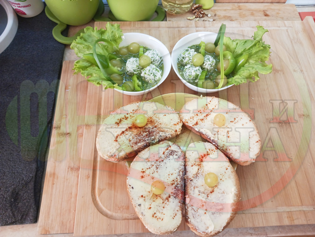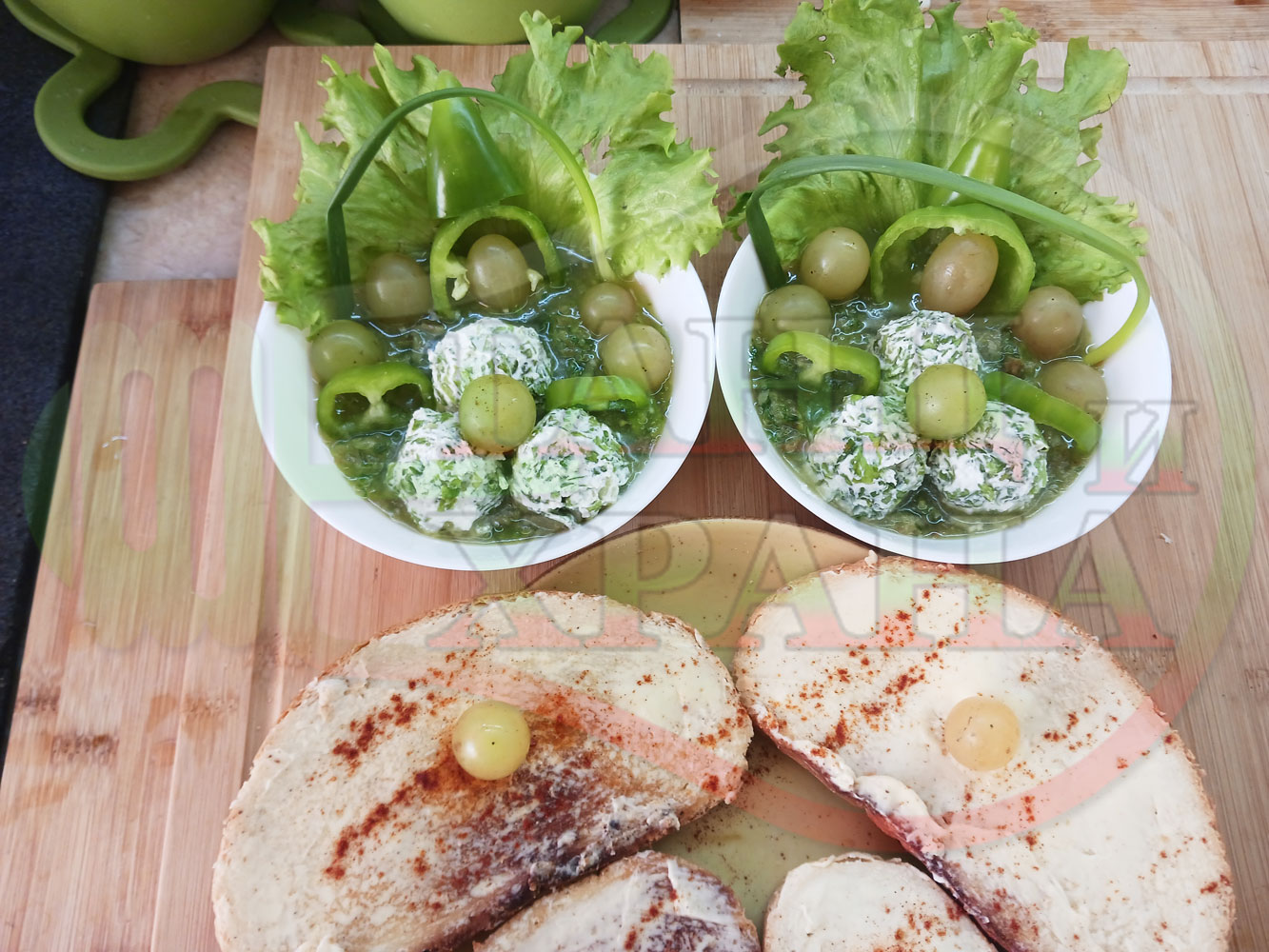 Българска студена сурова сладко солена супа "Гроздова зеленочушковолучена марулена с БГсирене" приготвена с прясно грозде, зелен лук и зелени пресни чушки гарнирана с топчета от сиреново марулен крем от маруля и краве бяло сирене - двукомпонентна