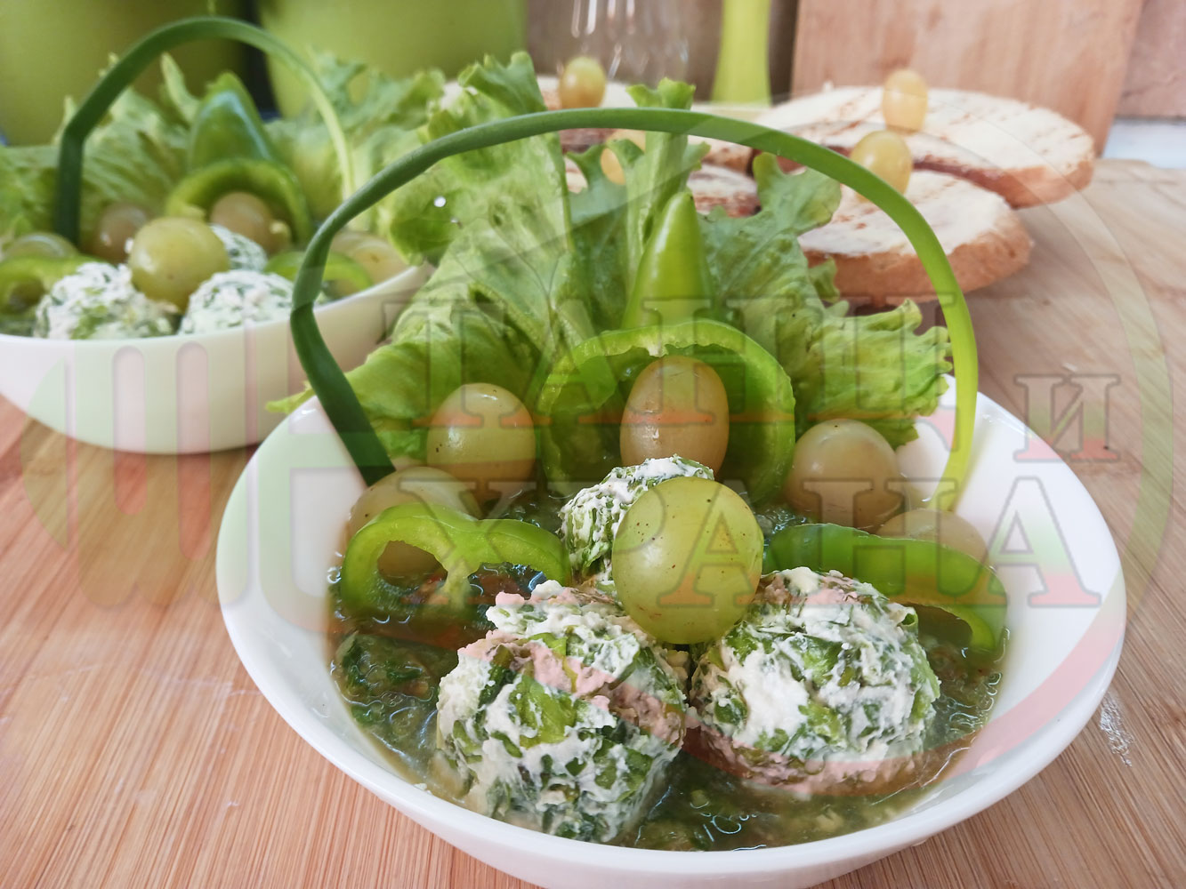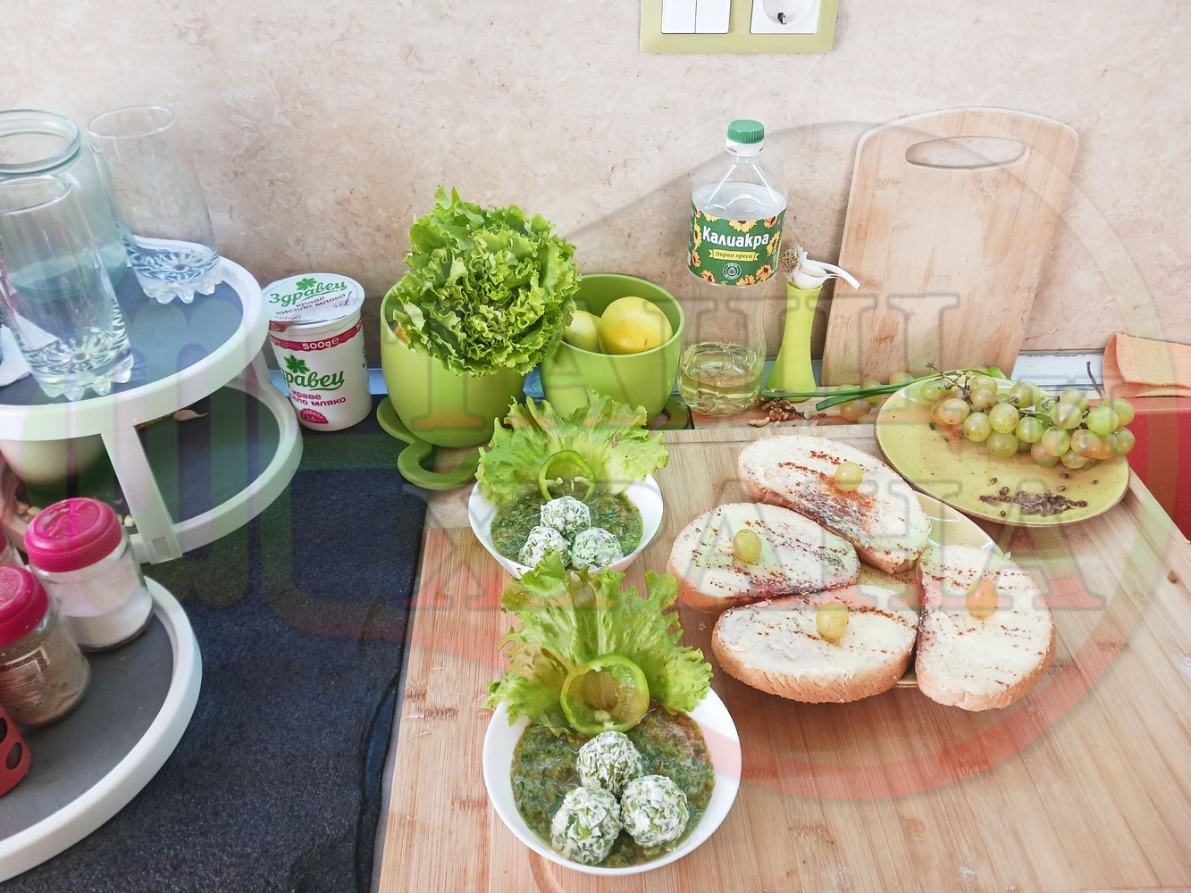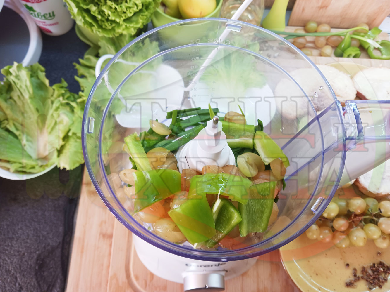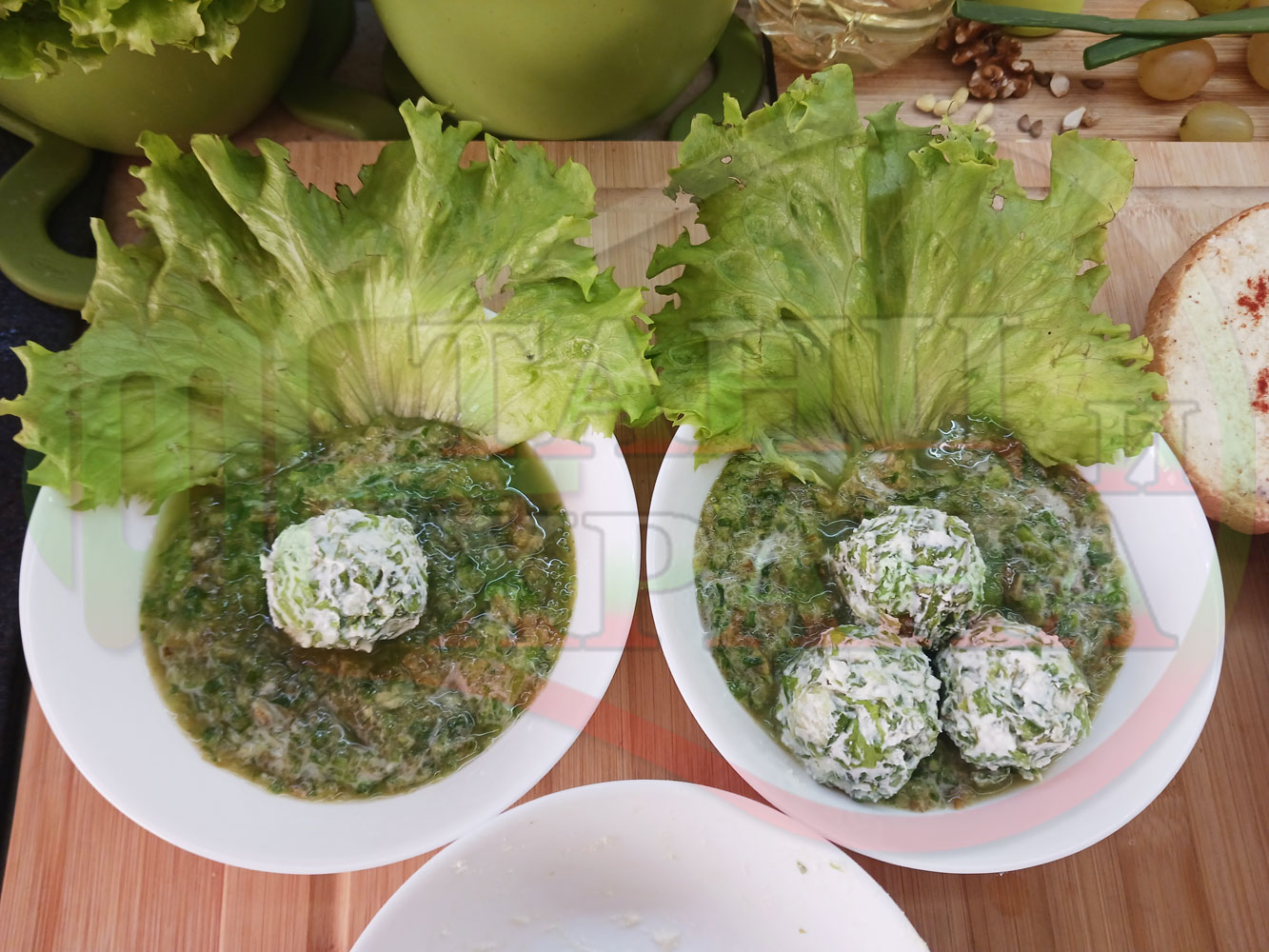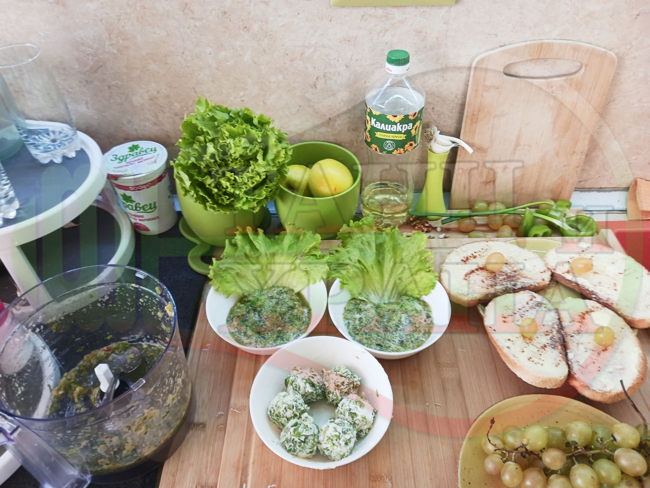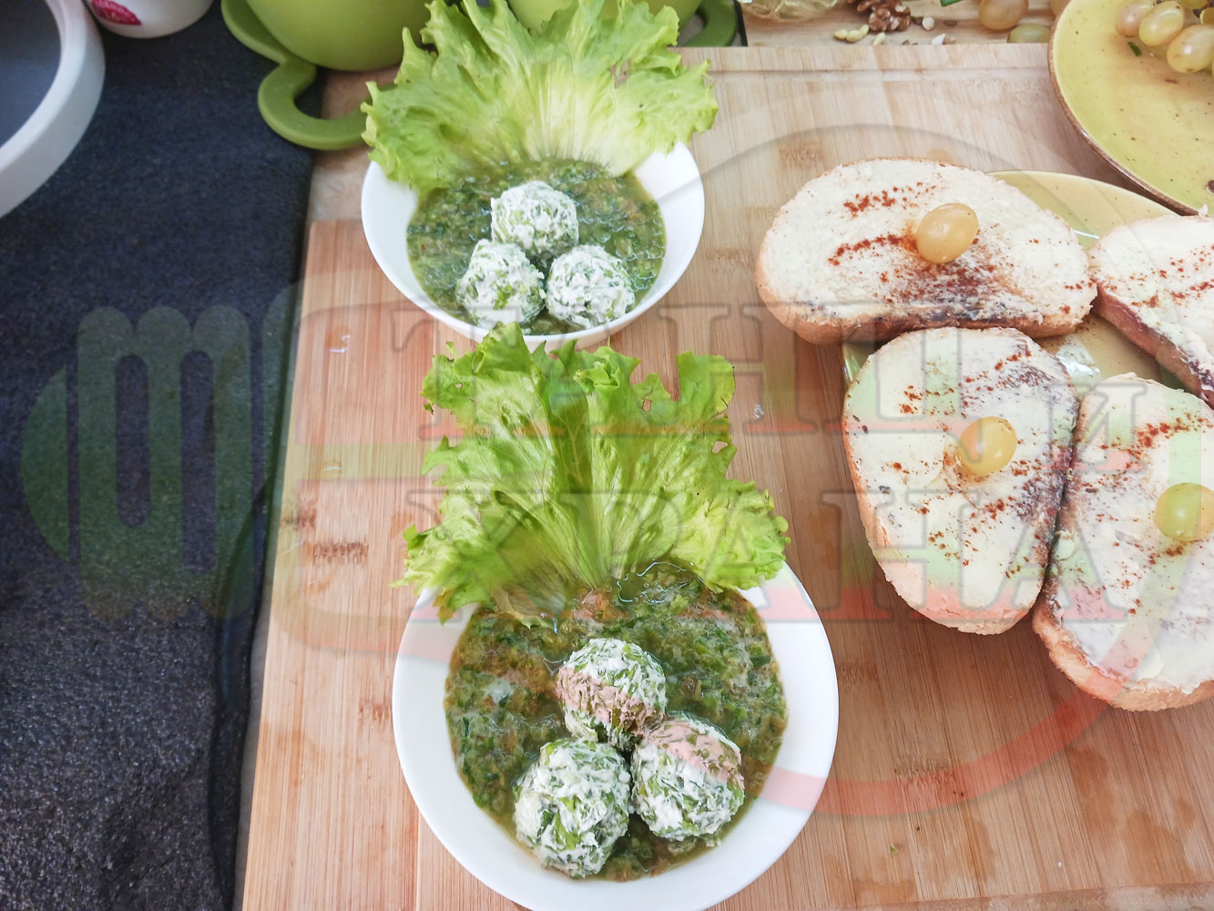 Българска студена сурова сладко солена супа "Гроздова зеленочушковолучена марулена с БГсирене" приготвена с прясно грозде, зелен лук и зелени пресни чушки гарнирана с топчета от сиреново марулен крем от маруля и краве бяло сирене - двукомпонентна