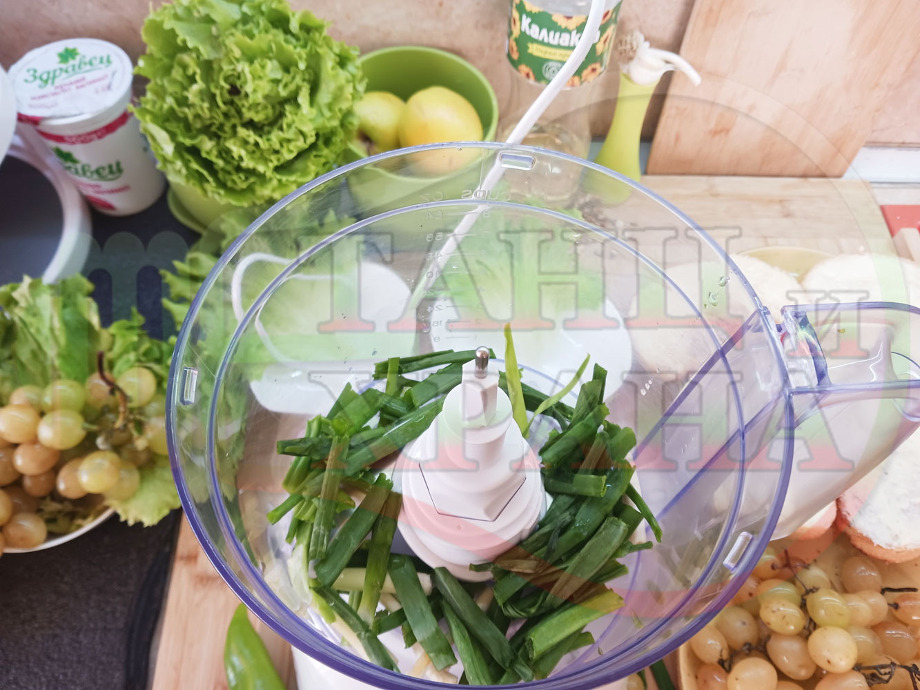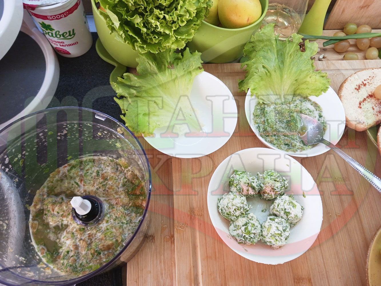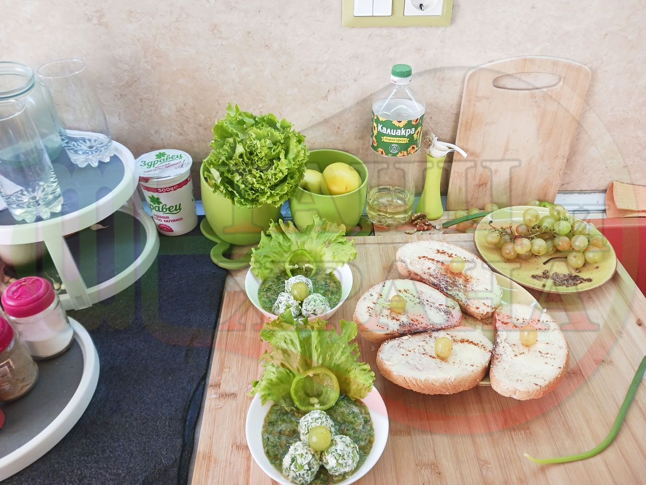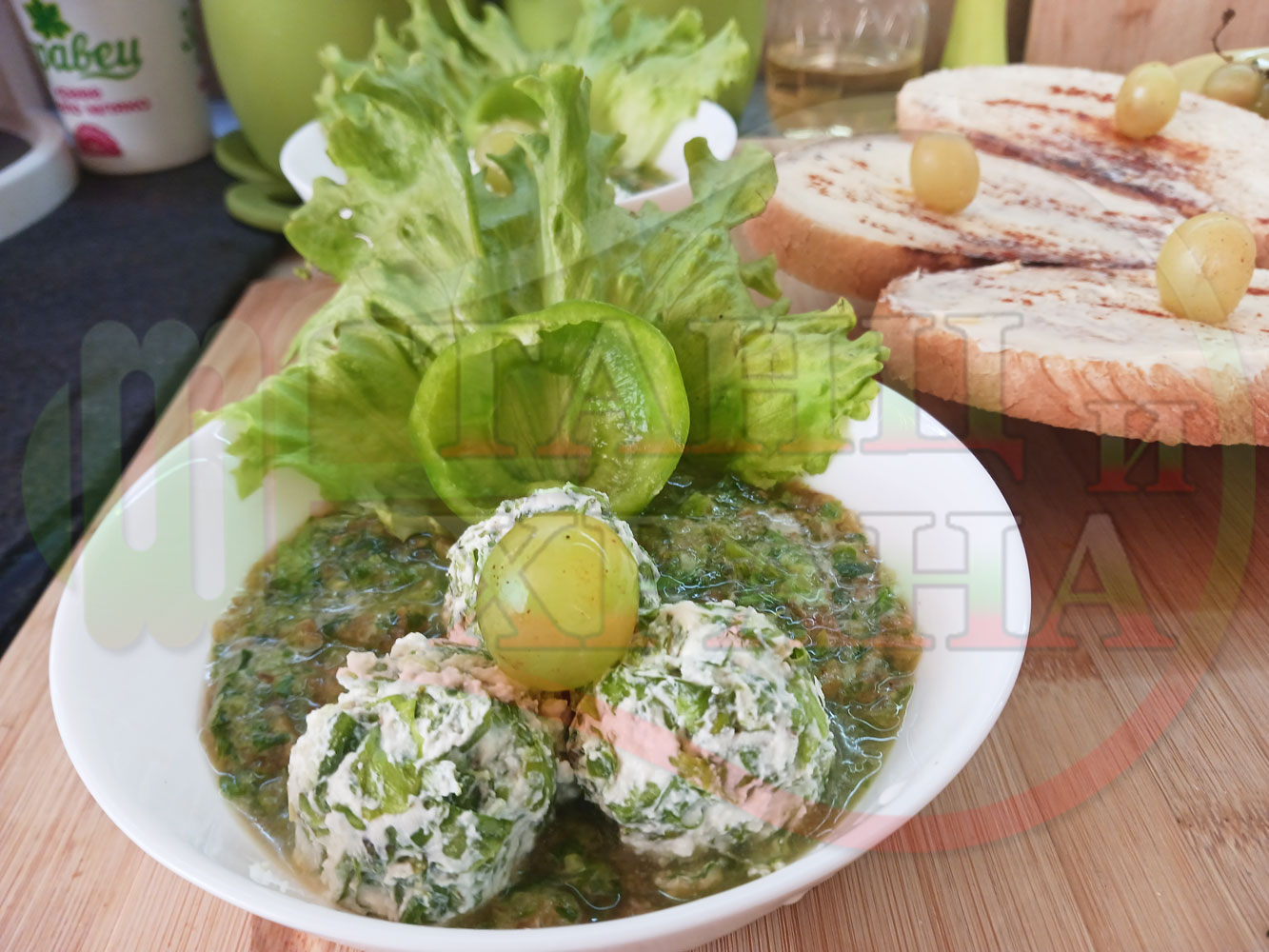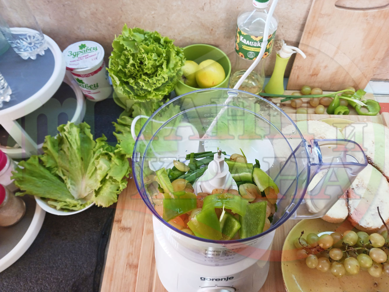 Българска студена сурова сладко солена супа "Гроздова зеленочушковолучена марулена с БГсирене" приготвена с прясно грозде, зелен лук и зелени пресни чушки гарнирана с топчета от сиреново марулен крем от маруля и краве бяло сирене - двукомпонентна