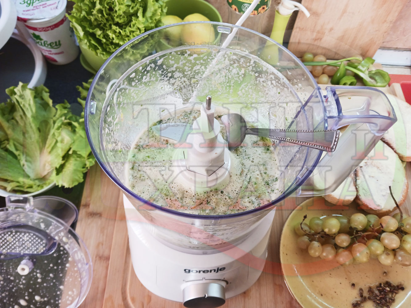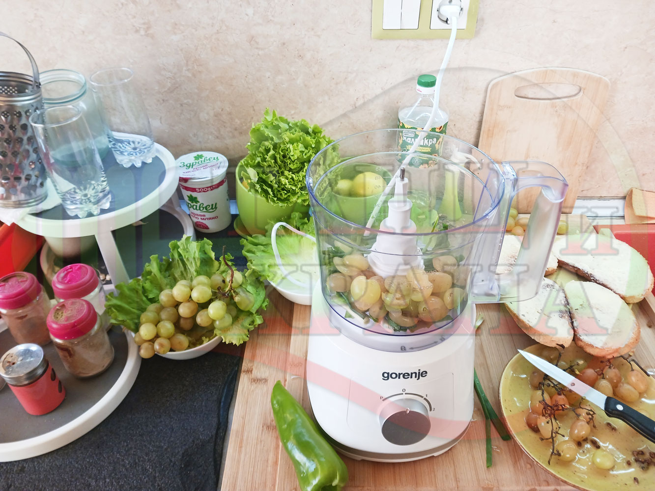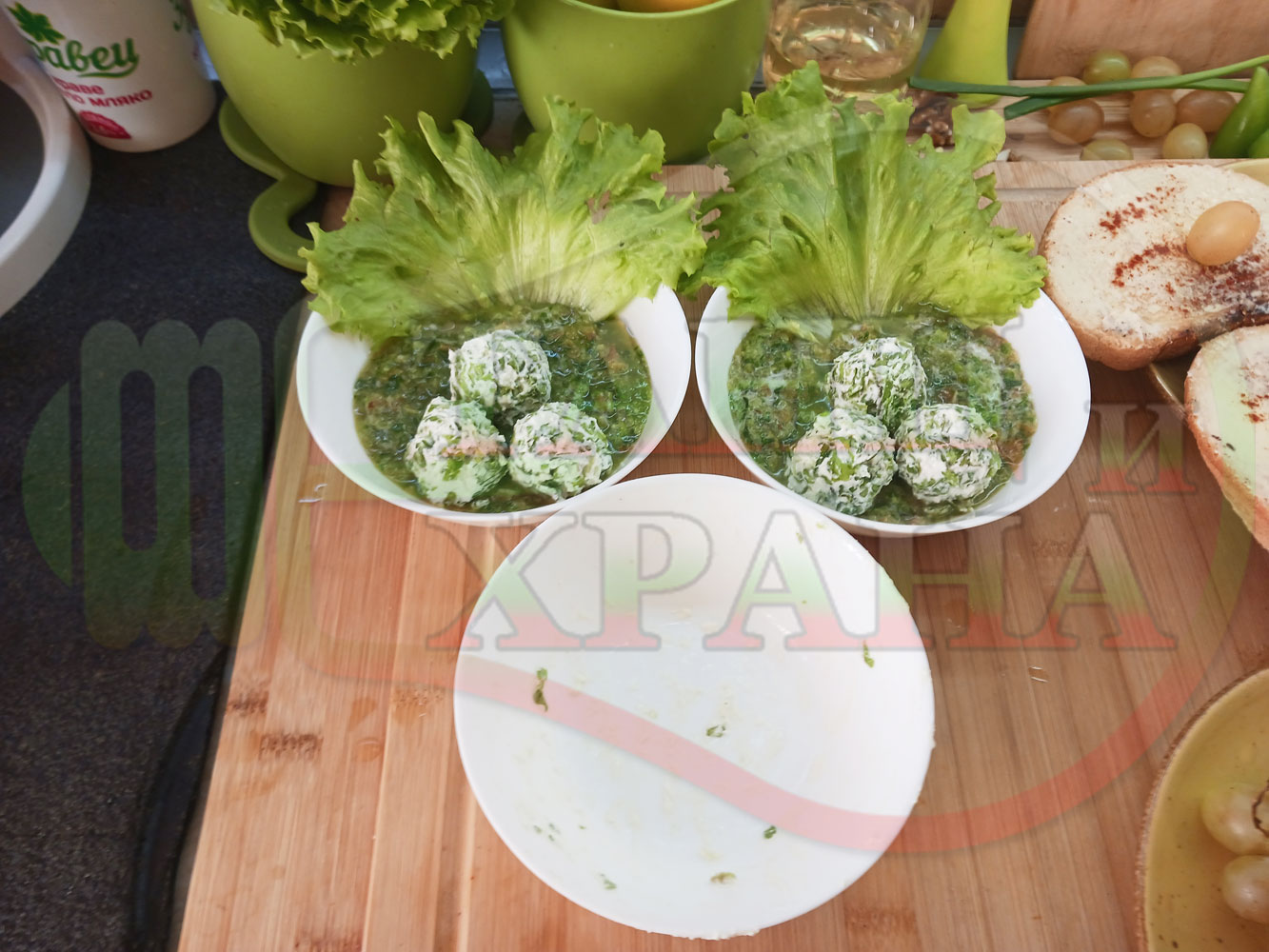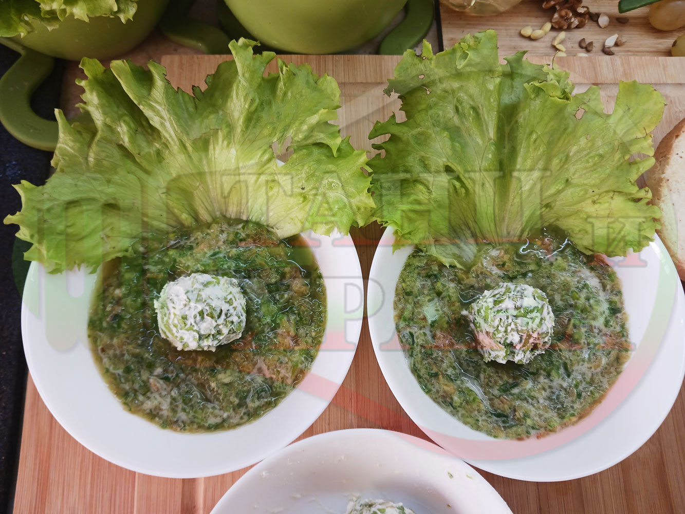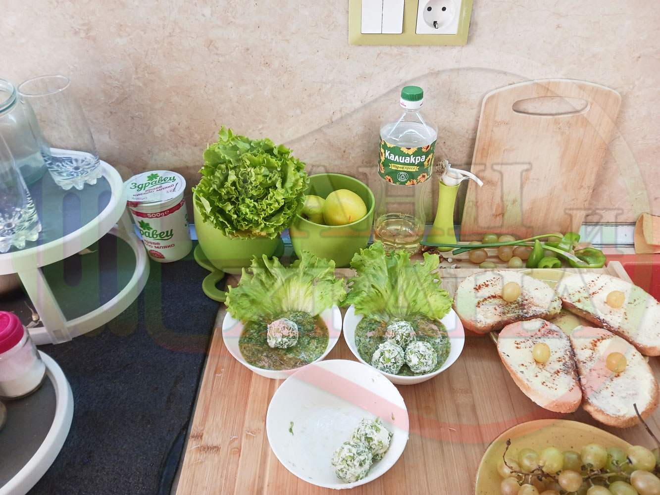 Българска студена сурова сладко солена супа "Гроздова зеленочушковолучена марулена с БГсирене" приготвена с прясно грозде, зелен лук и зелени пресни чушки гарнирана с топчета от сиреново марулен крем от маруля и краве бяло сирене - двукомпонентна