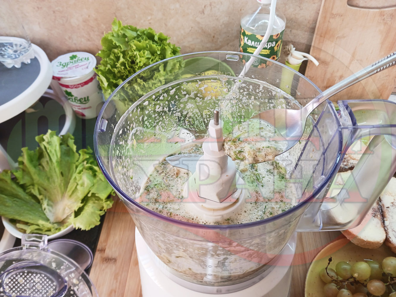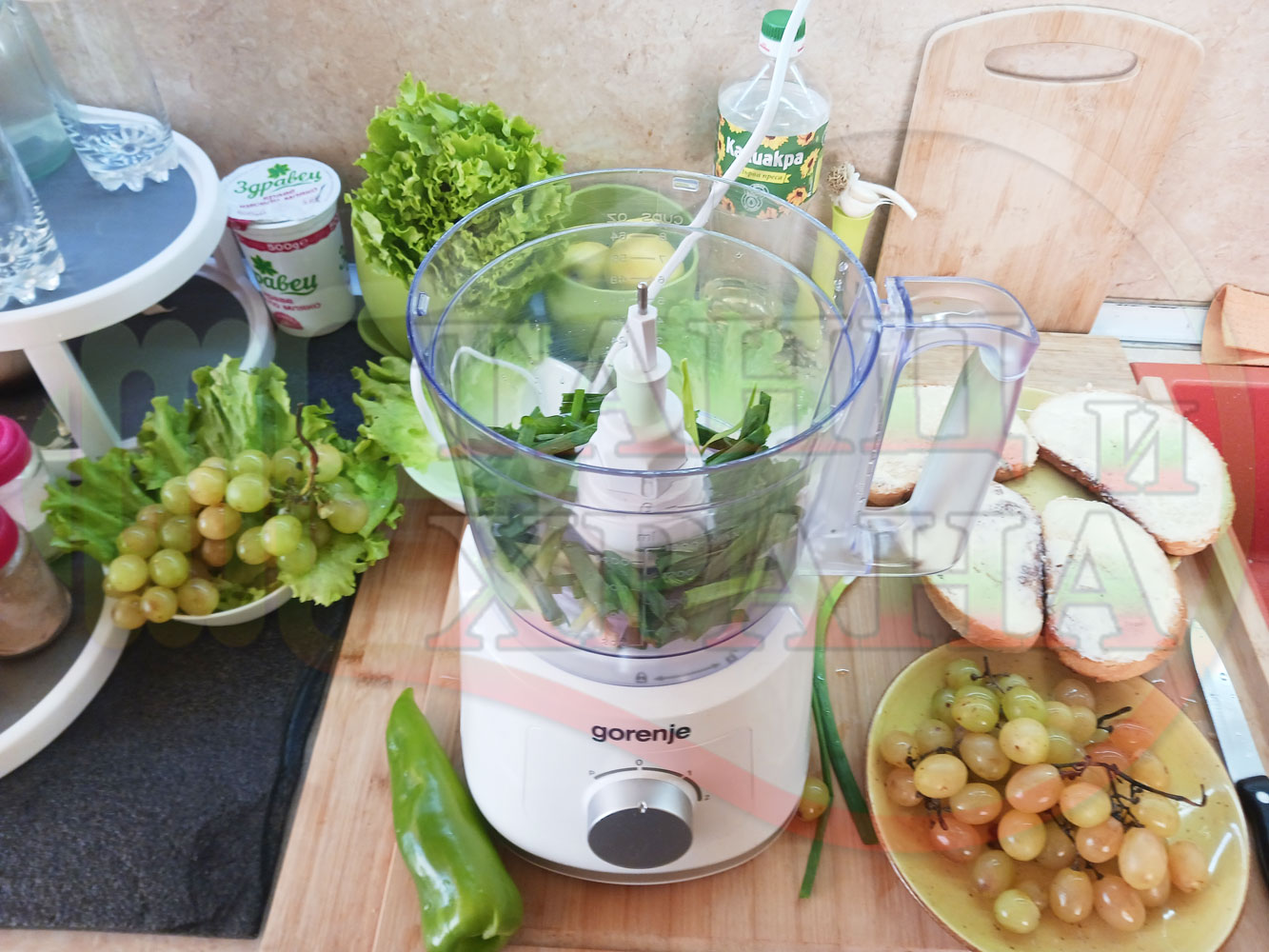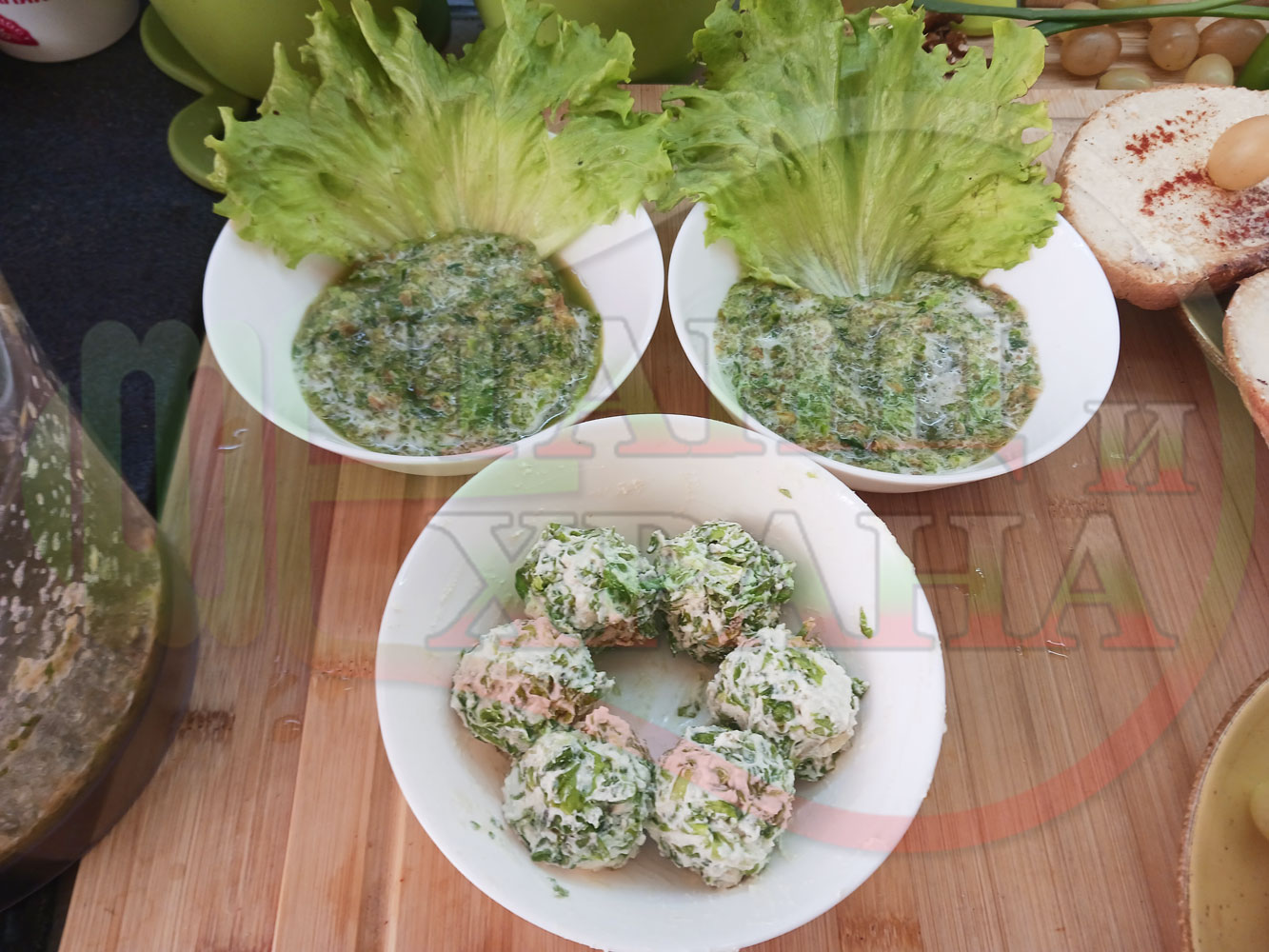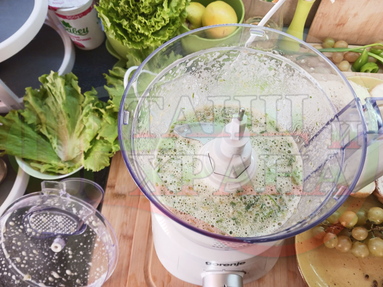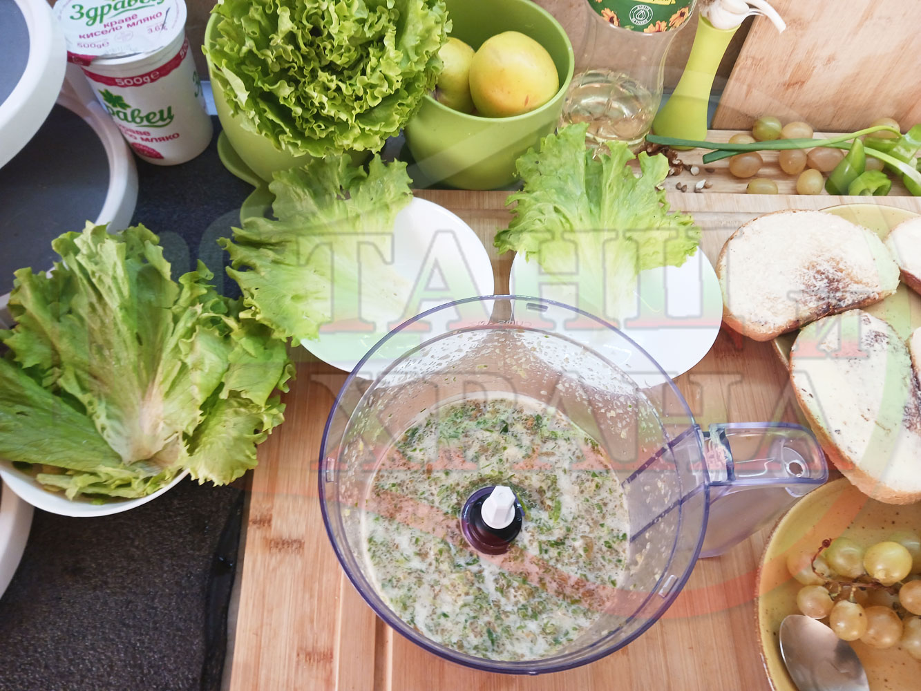 Българска студена сурова сладко солена супа "Гроздова зеленочушковолучена марулена с БГсирене" приготвена с прясно грозде, зелен лук и зелени пресни чушки гарнирана с топчета от сиреново марулен крем от маруля и краве бяло сирене - двукомпонентна
