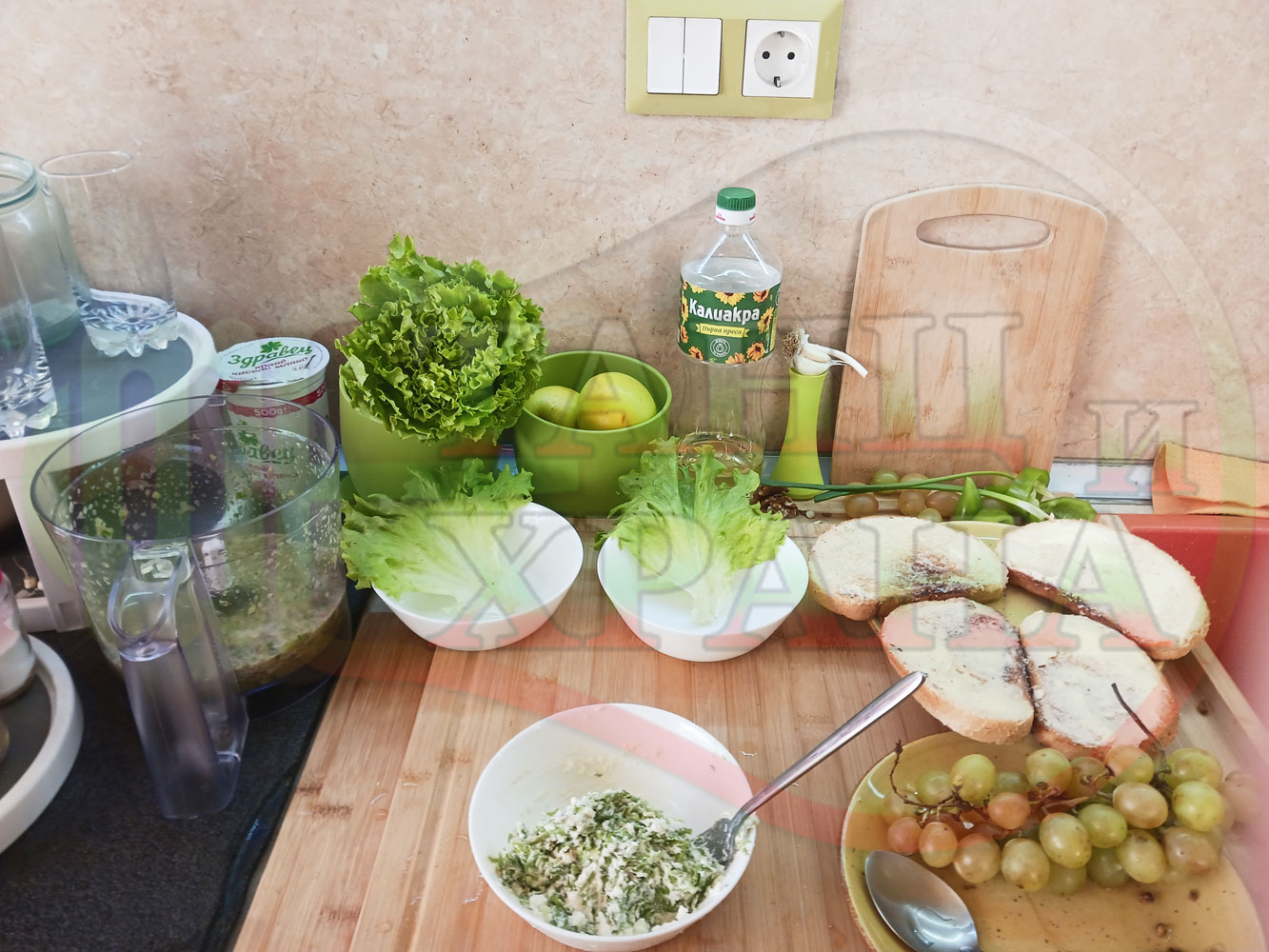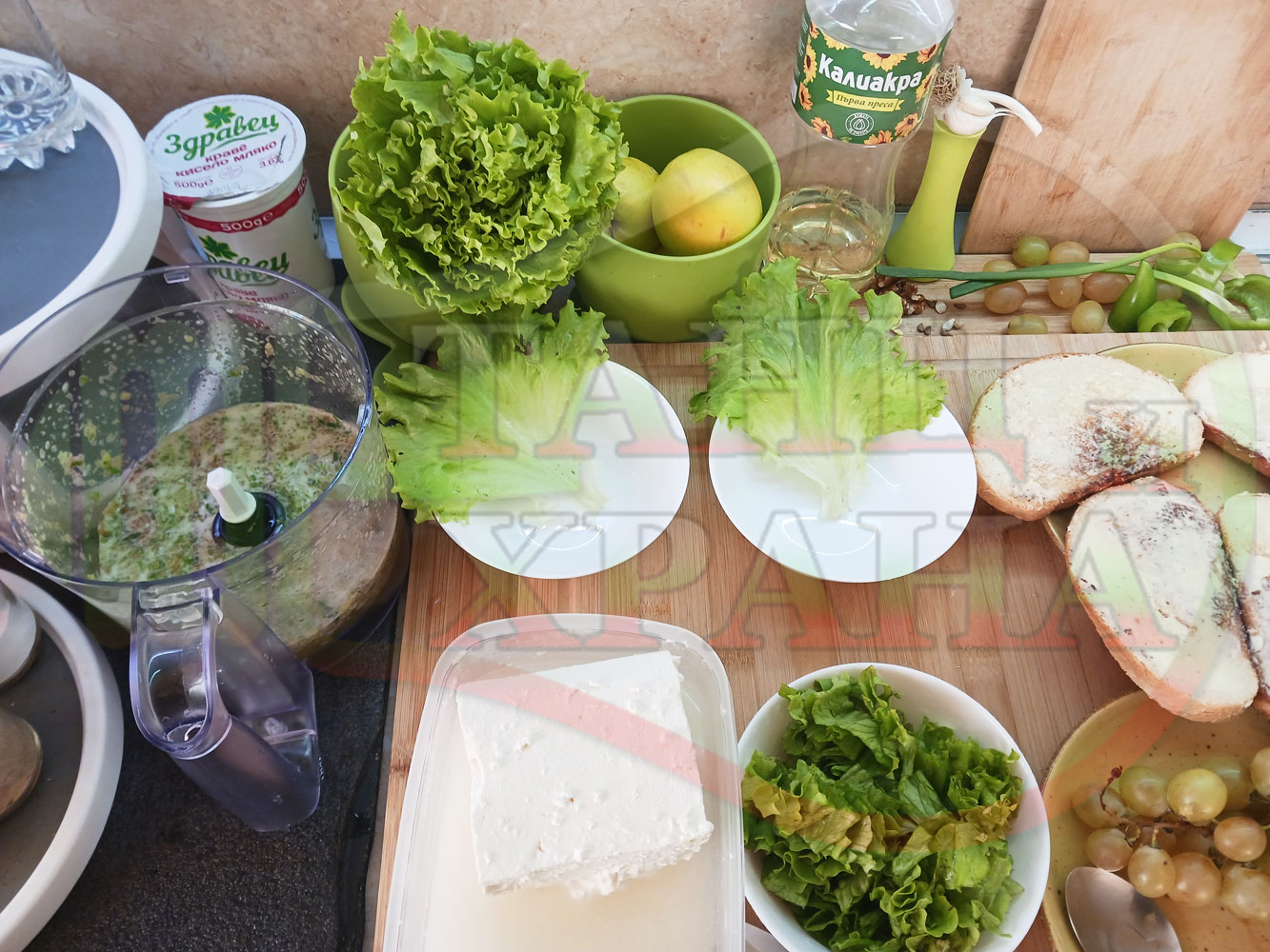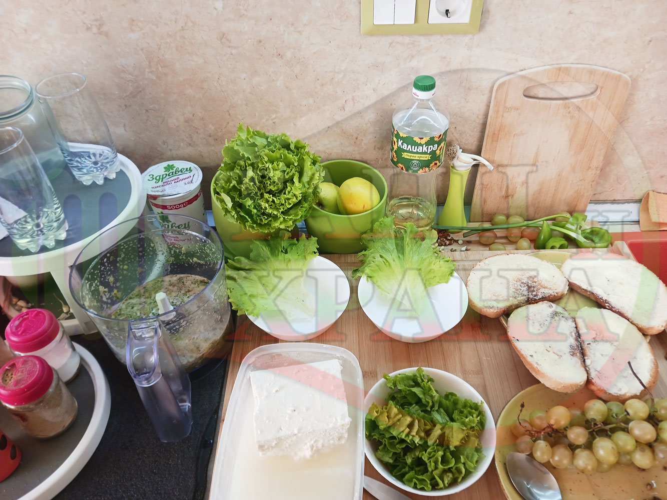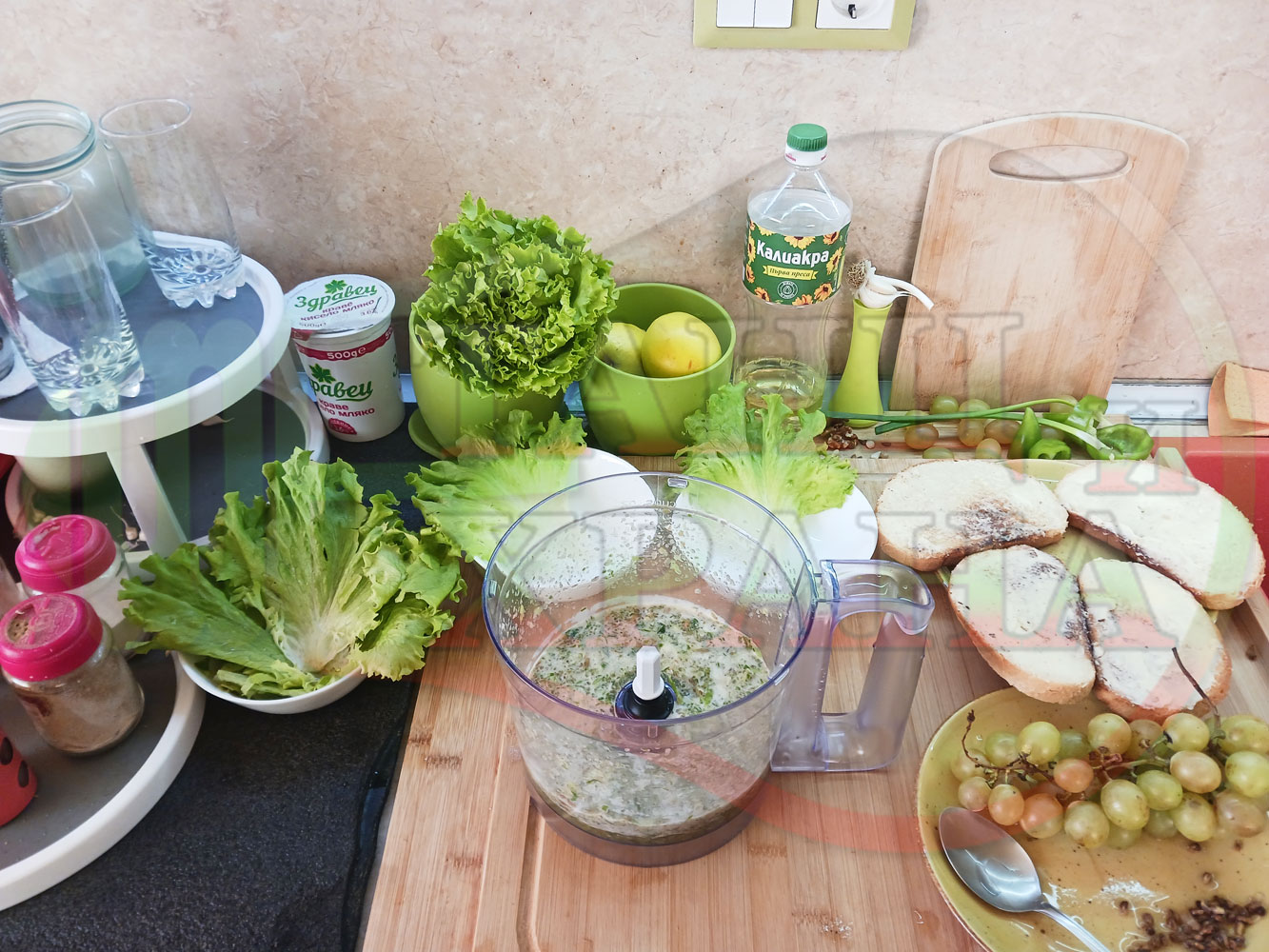 ПРОДУКТИ: Приблизителни количества за българска студена сурова сладко солена супа "Гроздова зеленочушковолучена марулена с БГсирене" приготвена с прясно грозде, зелен лук и зелени пресни чушки гарнирана с топчета от сиреново марулен крем от маруля и краве бяло сирене - двукомпонентна
