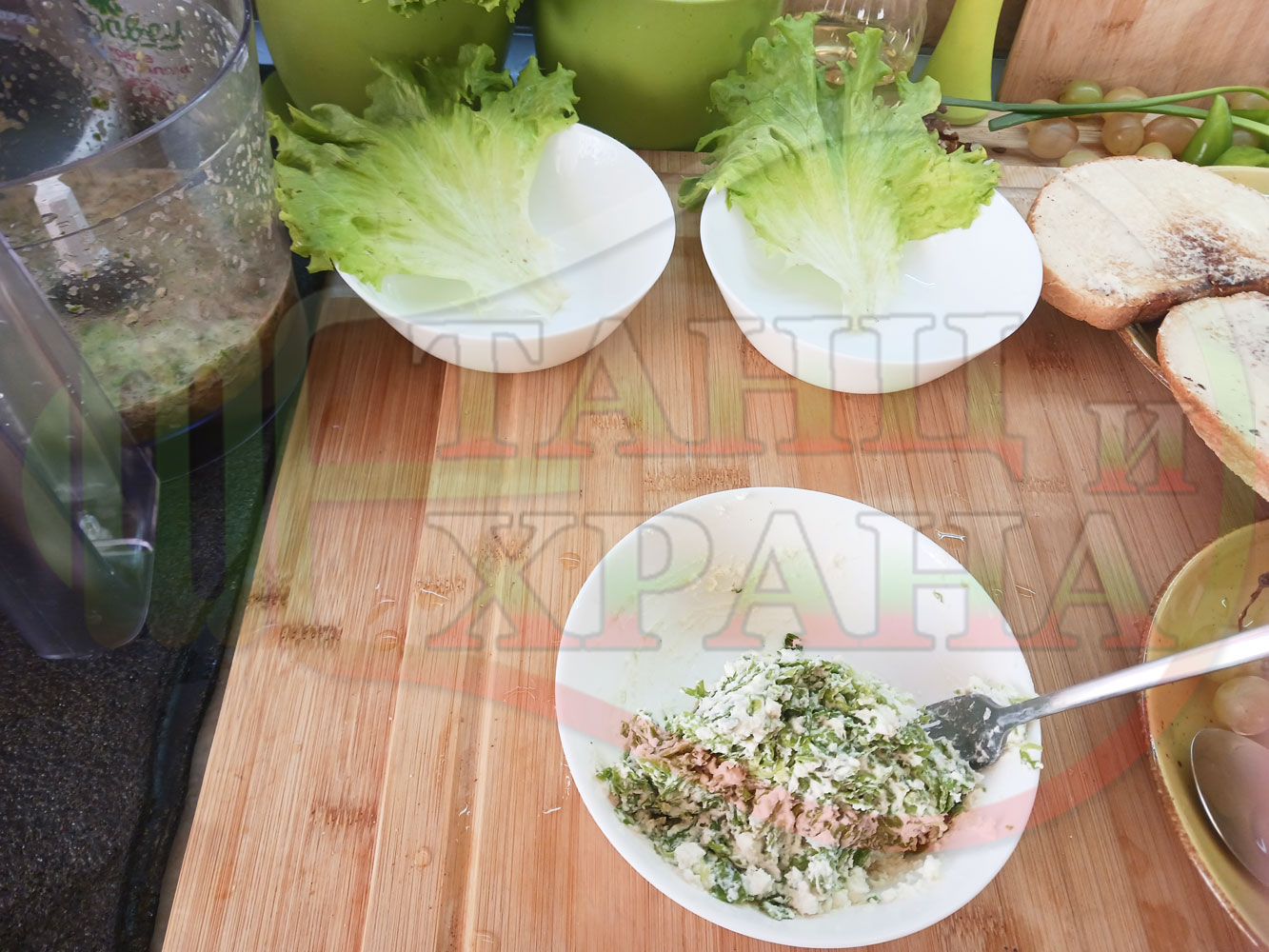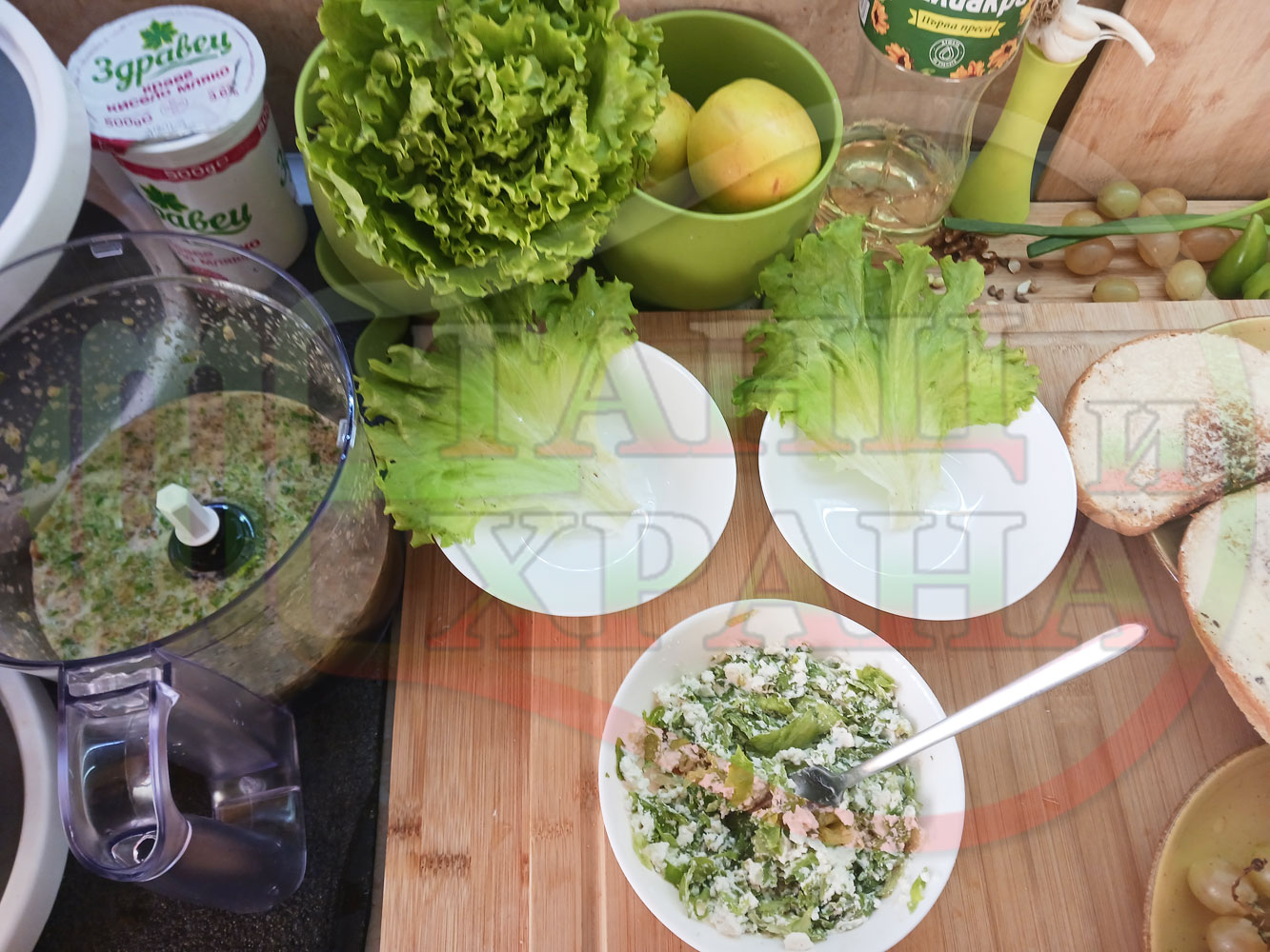 Измийте марулените листа под течаща вода, отцедете ги с притискане между пръстите и ги нарежете на едро в купа (запазете по-хубави и цели марулени листа за украса). Добавете кравето бяло сирене и разбъркайте и намачкайте с вилица за да се овкусят продуктите до образуване на сравнително гъст сиреново марулен, хомогенизиран крем (сиренов крем). Оформете 6 средно големи топчета от крема за гарниране на гроздовата супа.