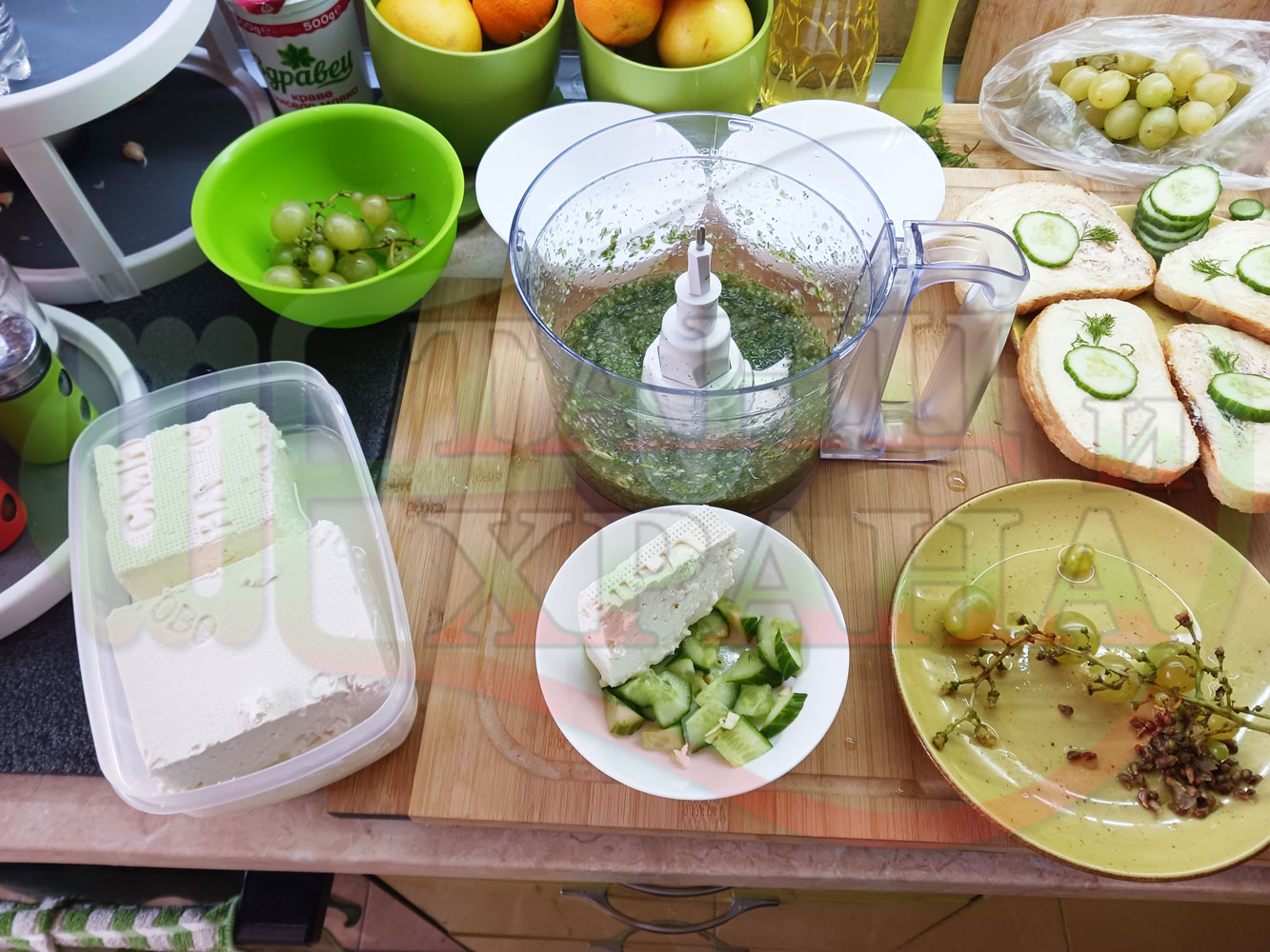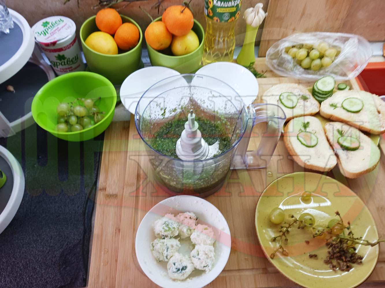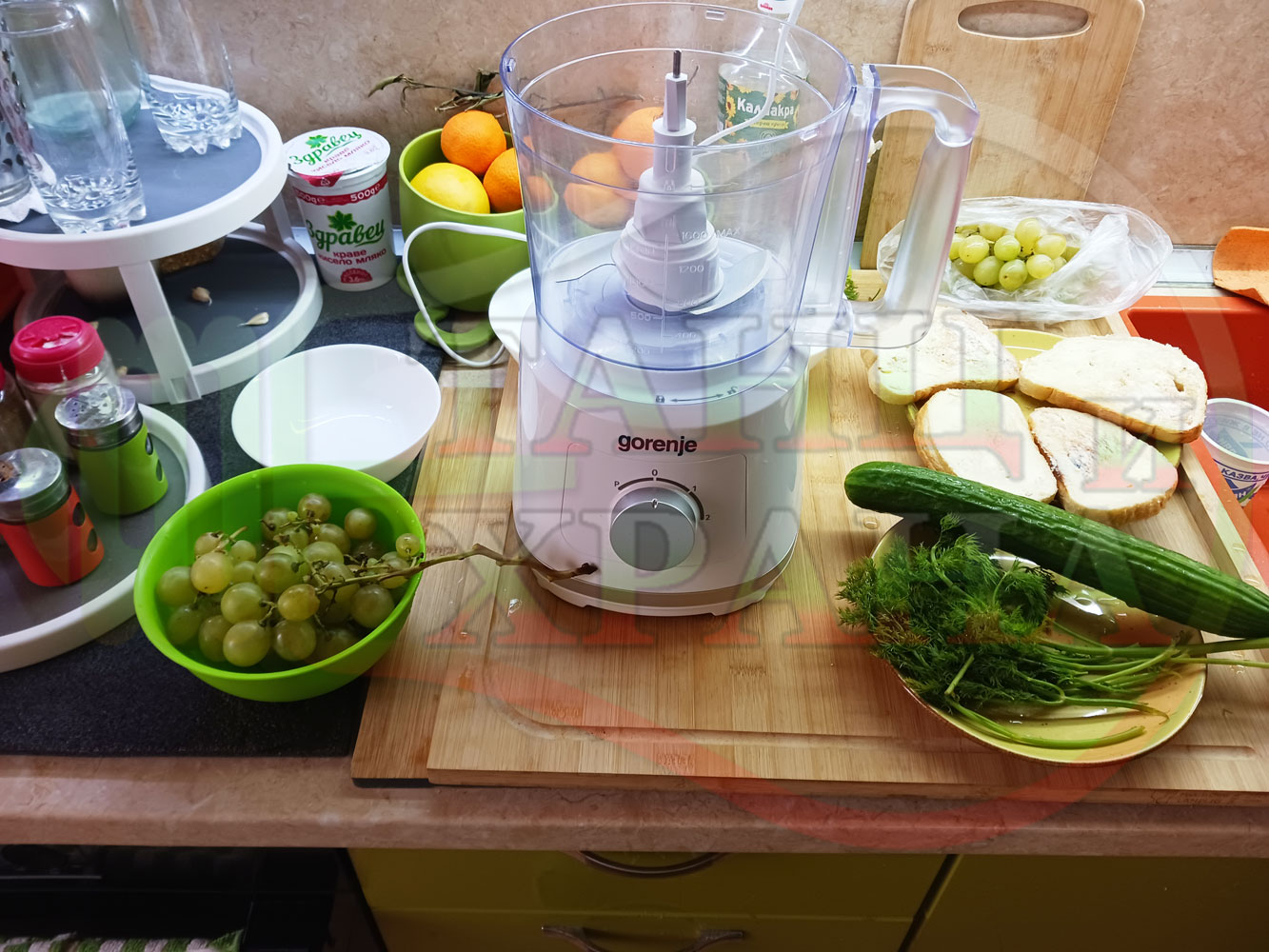 ПРОДУКТИ: Приблизителни количества за българска сурова сладко солена супа "Гроздовокопърова сиреновокраставична с БГсирене" приготвена с прясно грозде, краставици и свеж копър гарнирана с топчета от сиреново краставичен крем с краве бяло сирене (българско, саламурено) - двукомпонентна