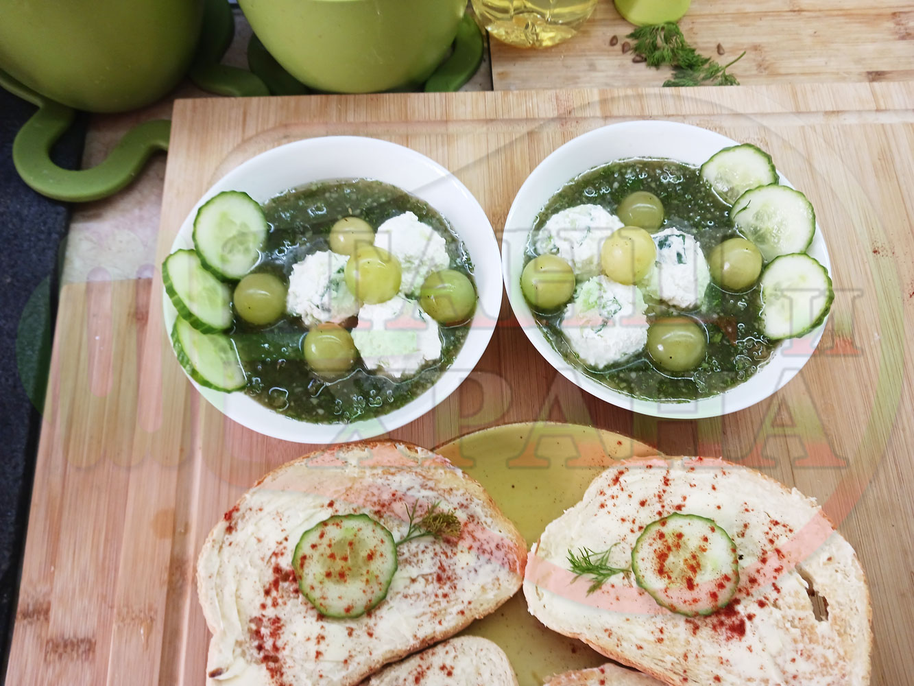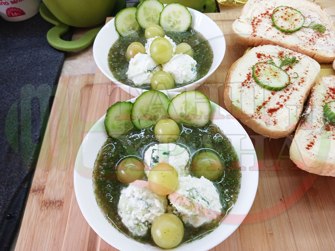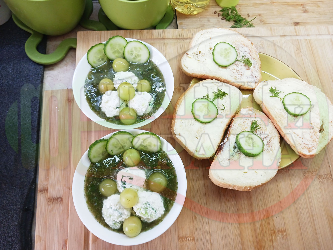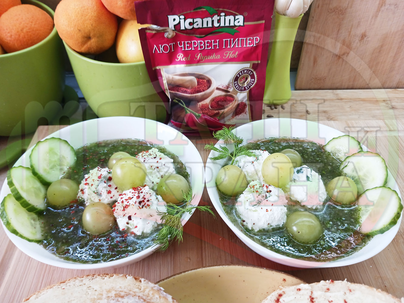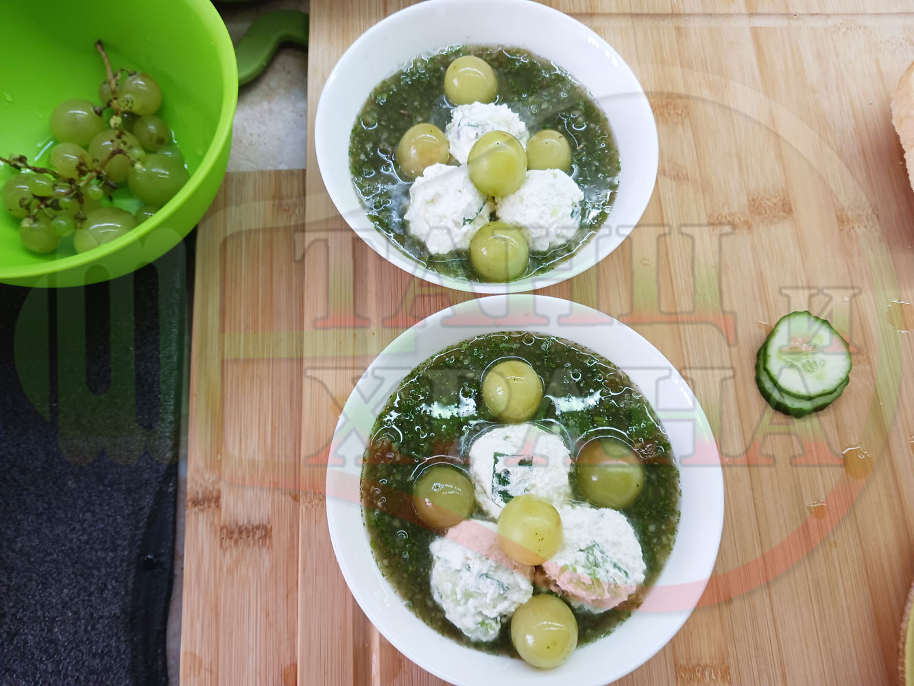 Българска сурова сладко солена супа "Гроздовокопърова сиреновокраставична с БГсирене" приготвена с прясно грозде, краставици и свеж копър гарнирана с топчета от сиреново краставичен крем с краве бяло сирене (българско, саламурено) - двукомпонентна