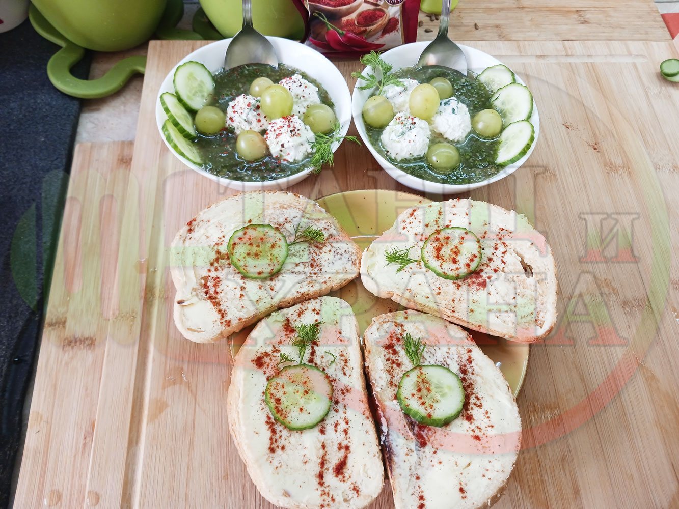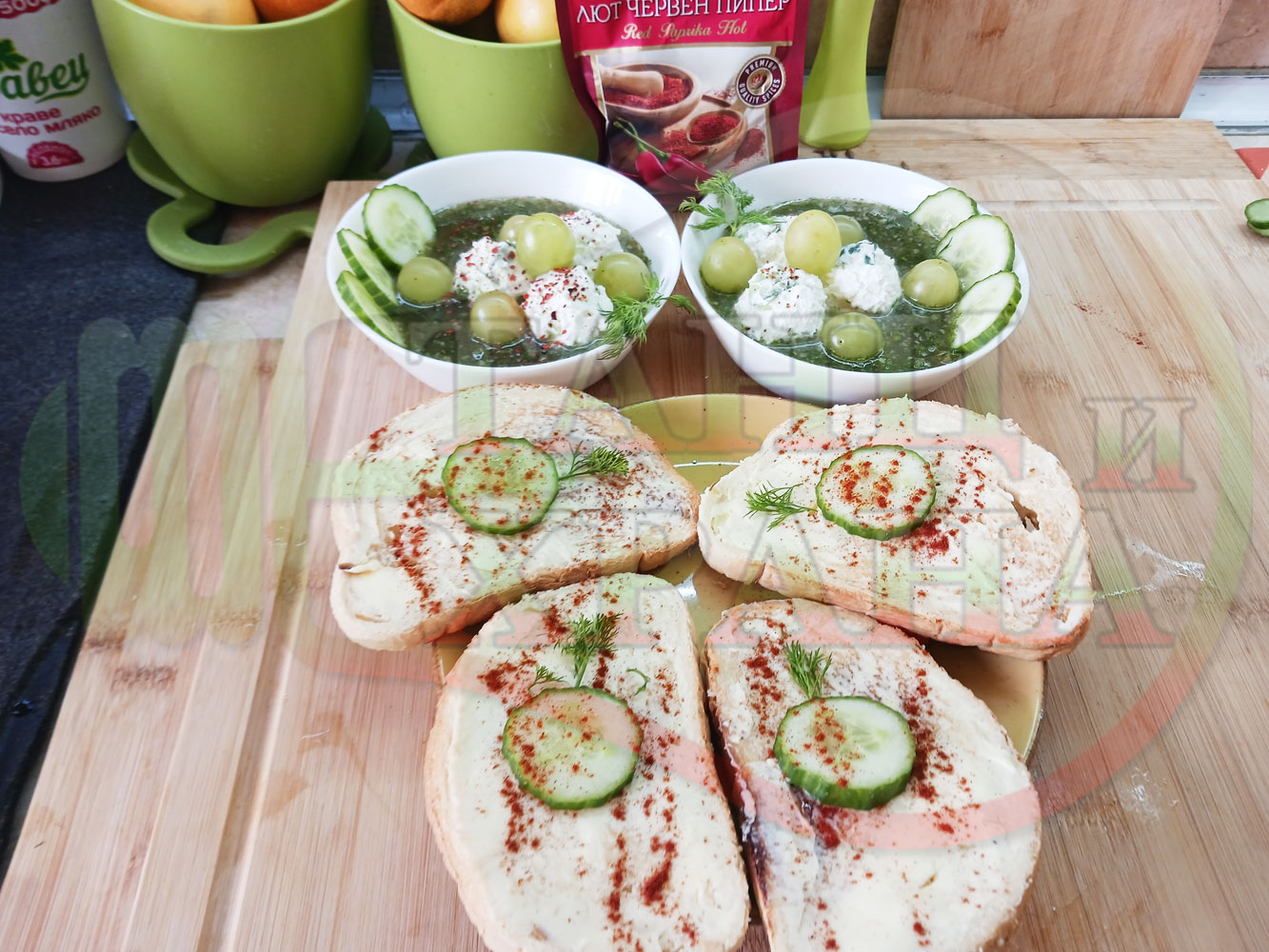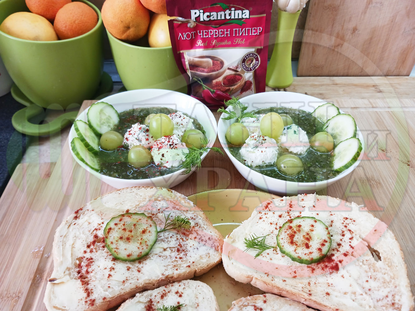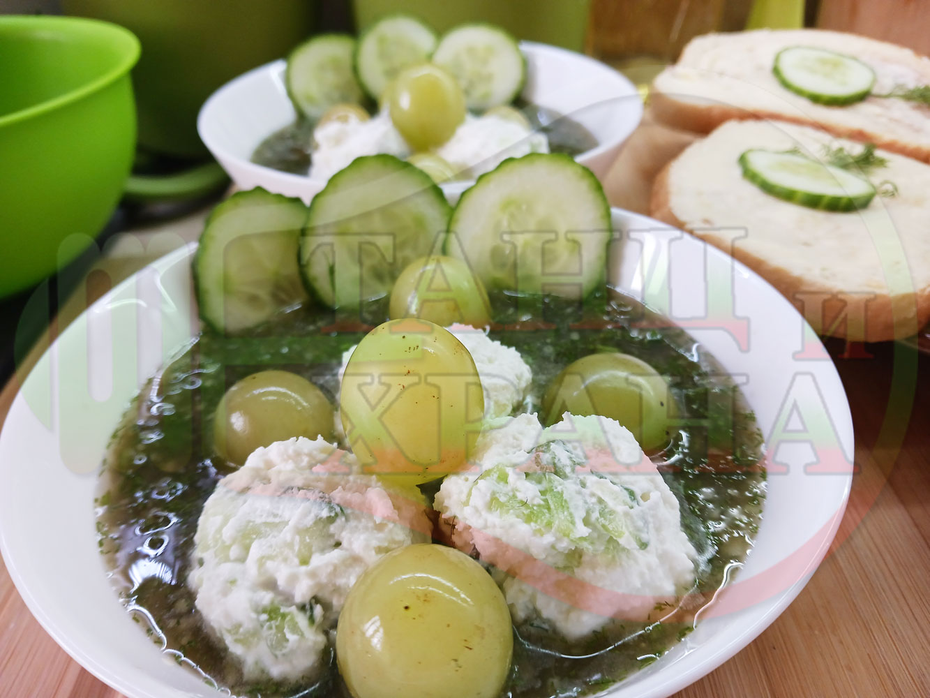 Българска сурова сладко солена супа "Гроздовокопърова сиреновокраставична с БГсирене" приготвена с прясно грозде, краставици и свеж копър гарнирана с топчета от сиреново краставичен крем с краве бяло сирене (българско, саламурено) - двукомпонентна