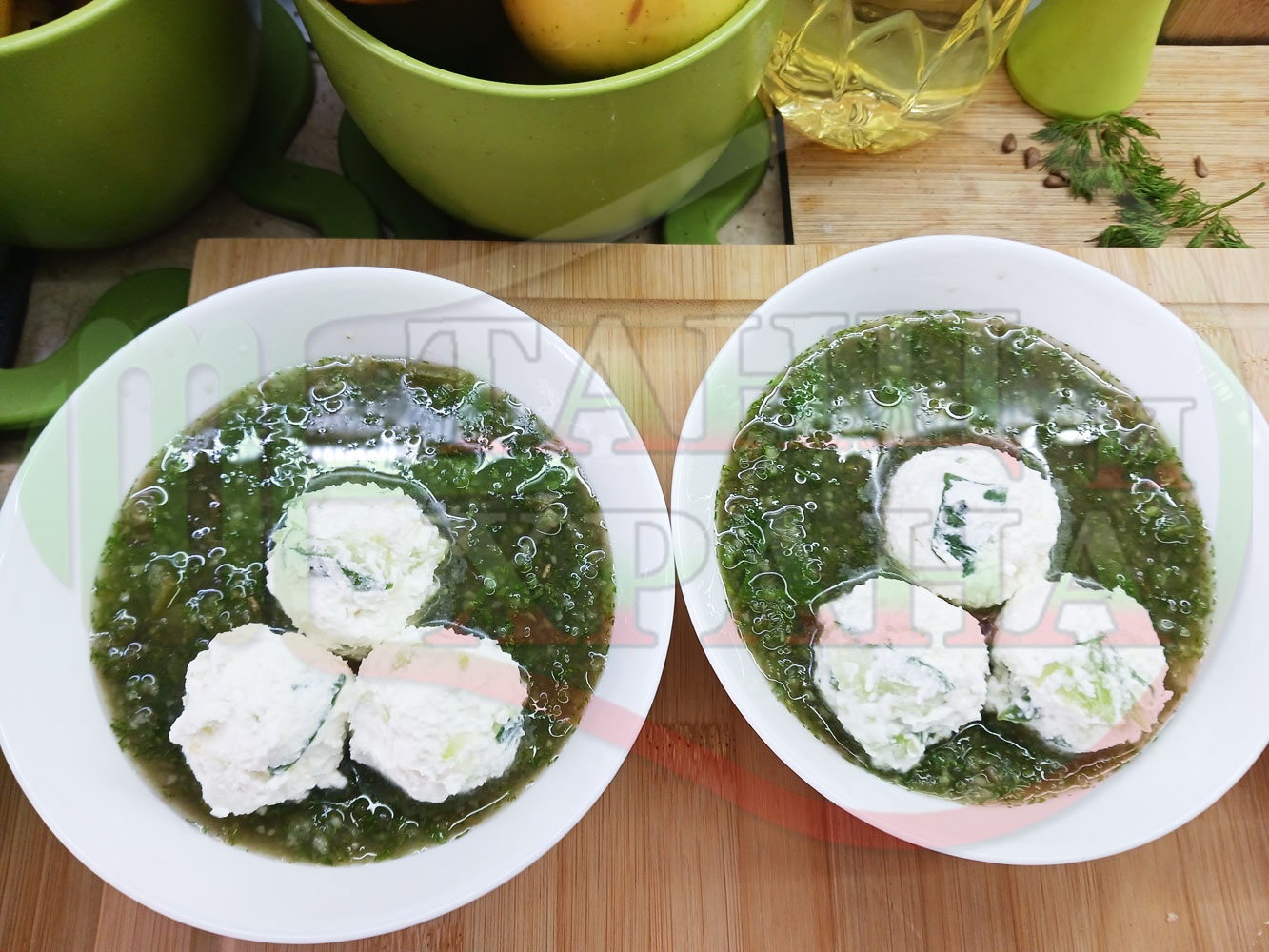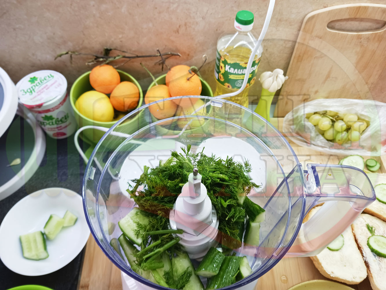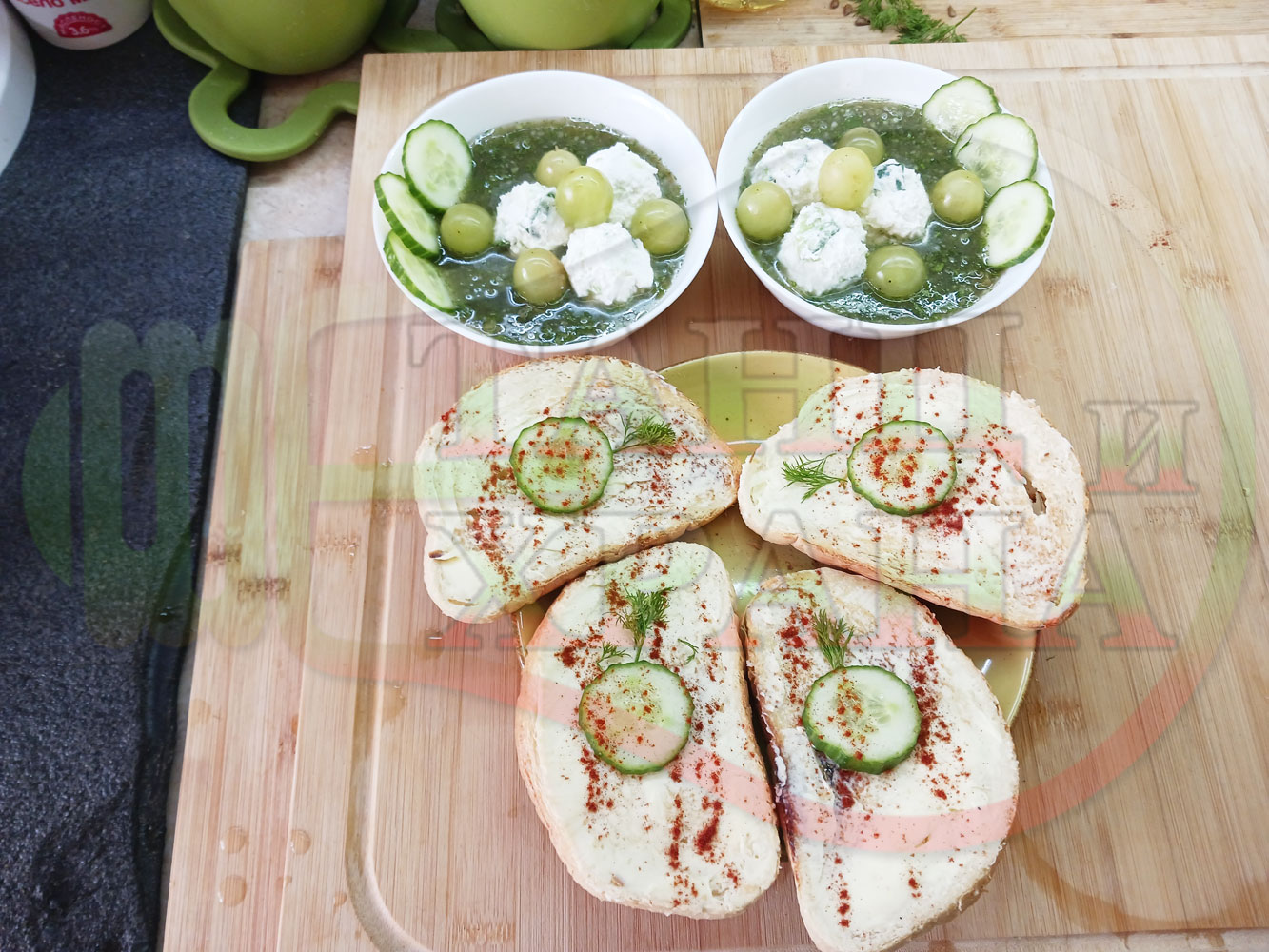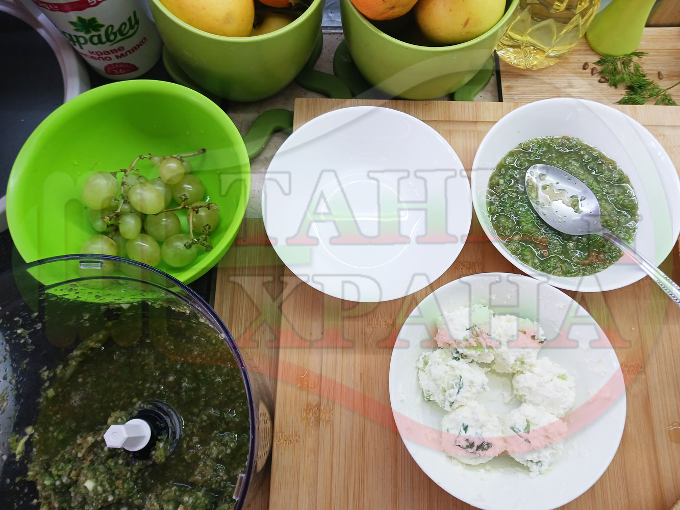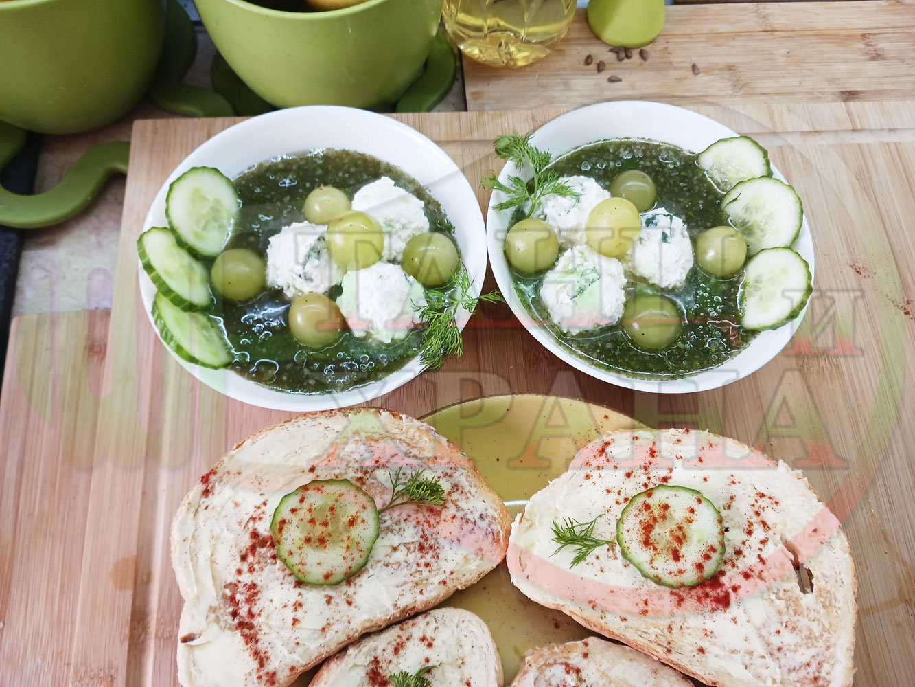 Българска сурова сладко солена супа "Гроздовокопърова сиреновокраставична с БГсирене" приготвена с прясно грозде, краставици и свеж копър гарнирана с топчета от сиреново краставичен крем с краве бяло сирене (българско, саламурено) - двукомпонентна