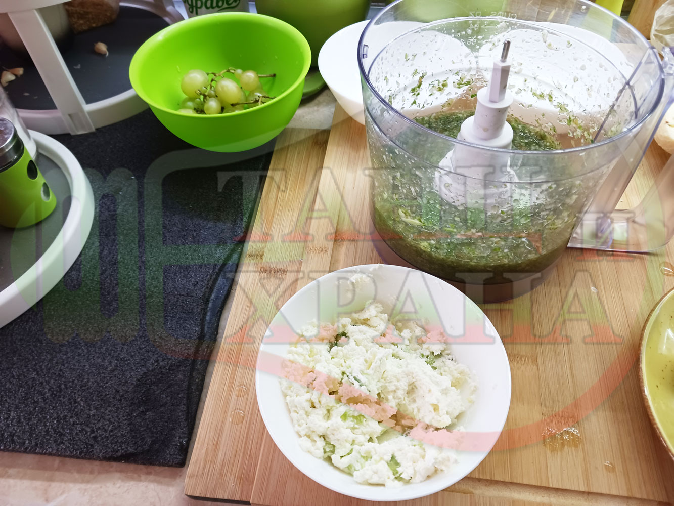 Измийте краставицата, нарежете я на малки парченца в купа и добавете българското краве бяло сирене и обеления и нарязан на едро чесън (нарежете част от краставицата на кръгчета за украса). Разбъркайте и намачкайте с вилица за да се овкусят продуктите до образуване на сравнително гъст сиреново краставичен, хомогенизиран крем (сиренов крем). Оформете 6 средно големи топчета от крема за гарниране на гроздовата супа.