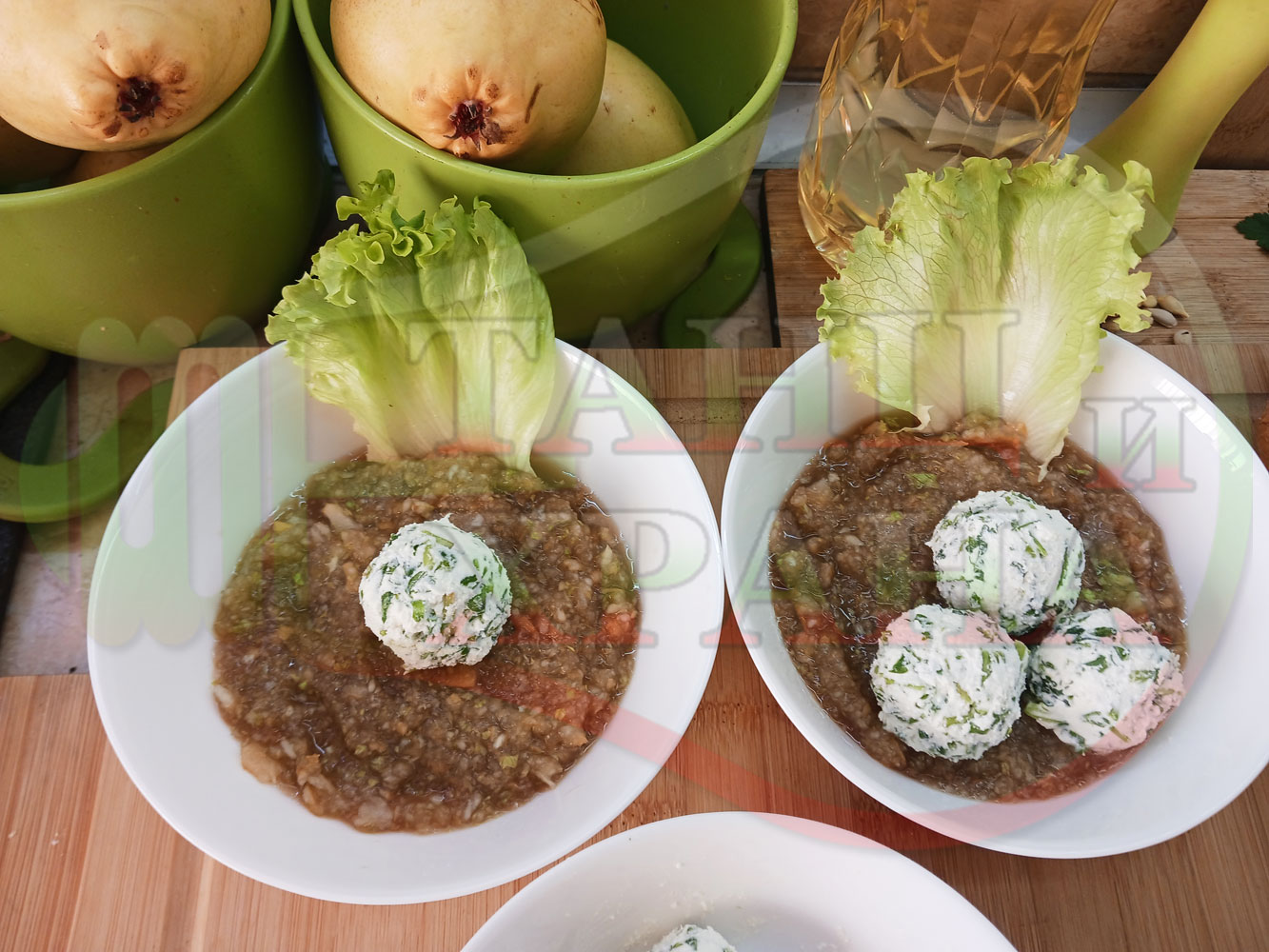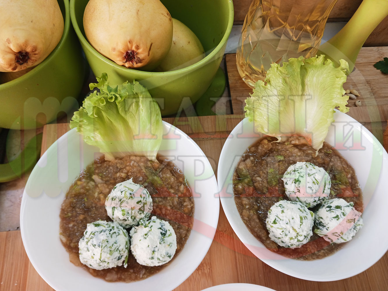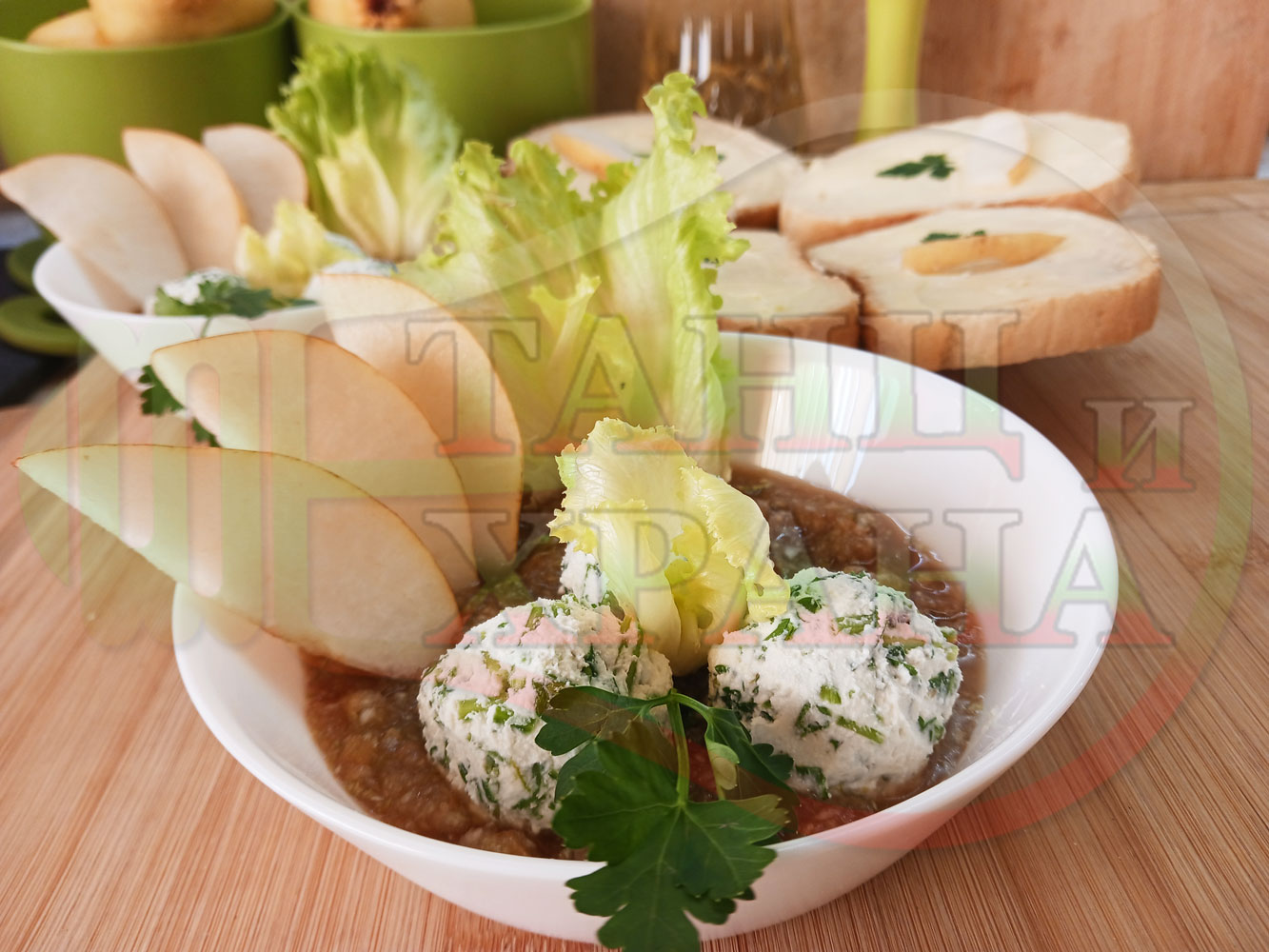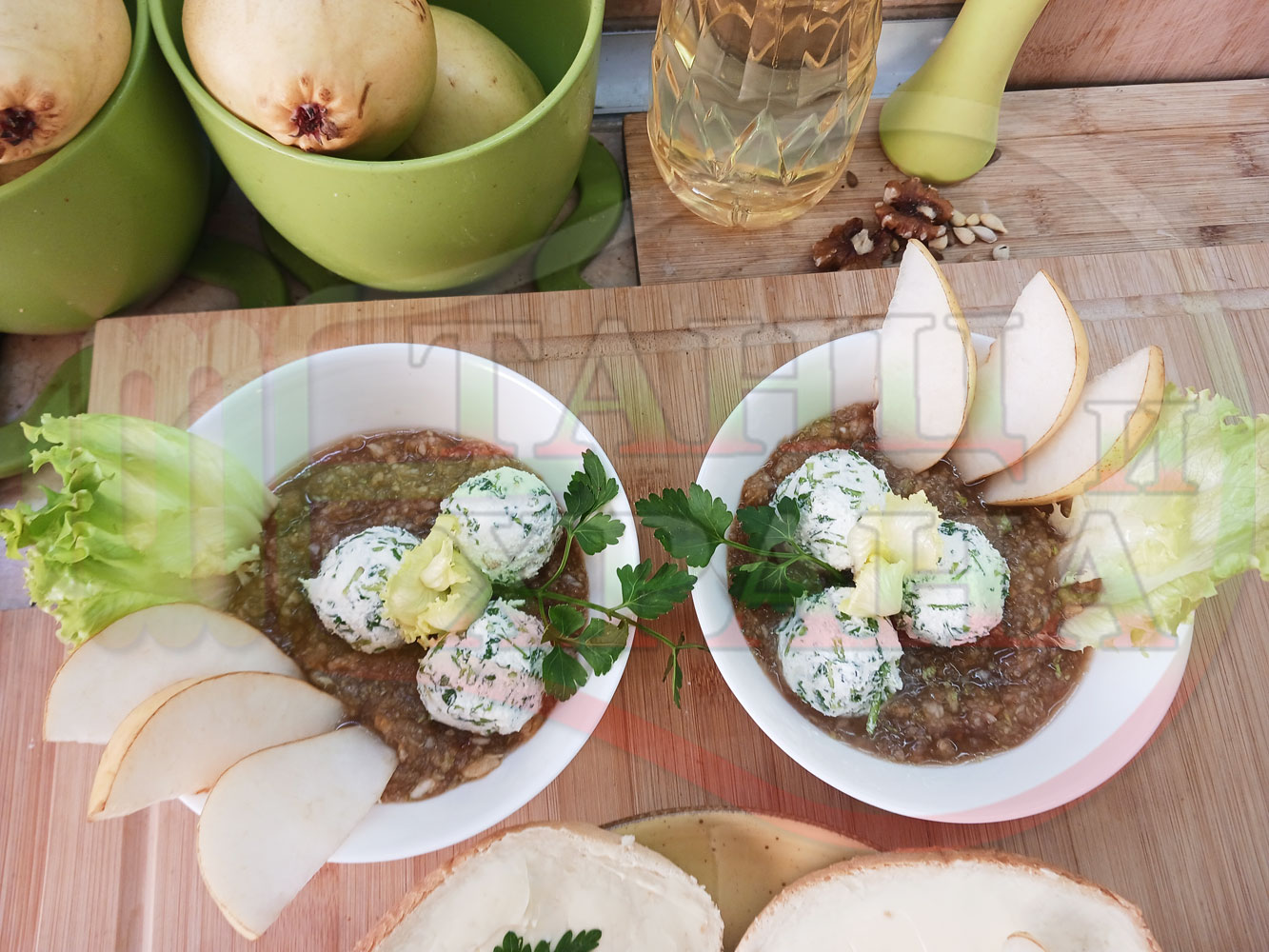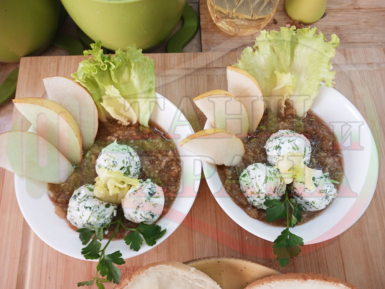 Българска плодова сурова супа "Крушова марулена с БГсирене" приготвена от пресни круши и свежа маруля гарнирана с топчета от сиренов крем с магданоз и краве бяло сирене (българско, саламурено) - двукомпонентна