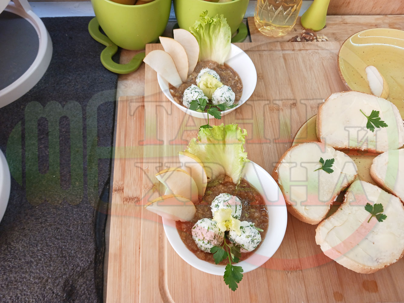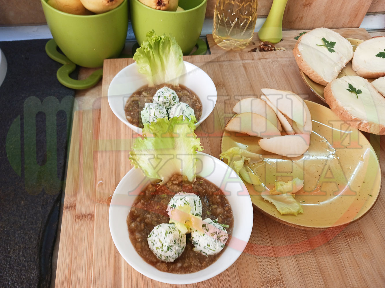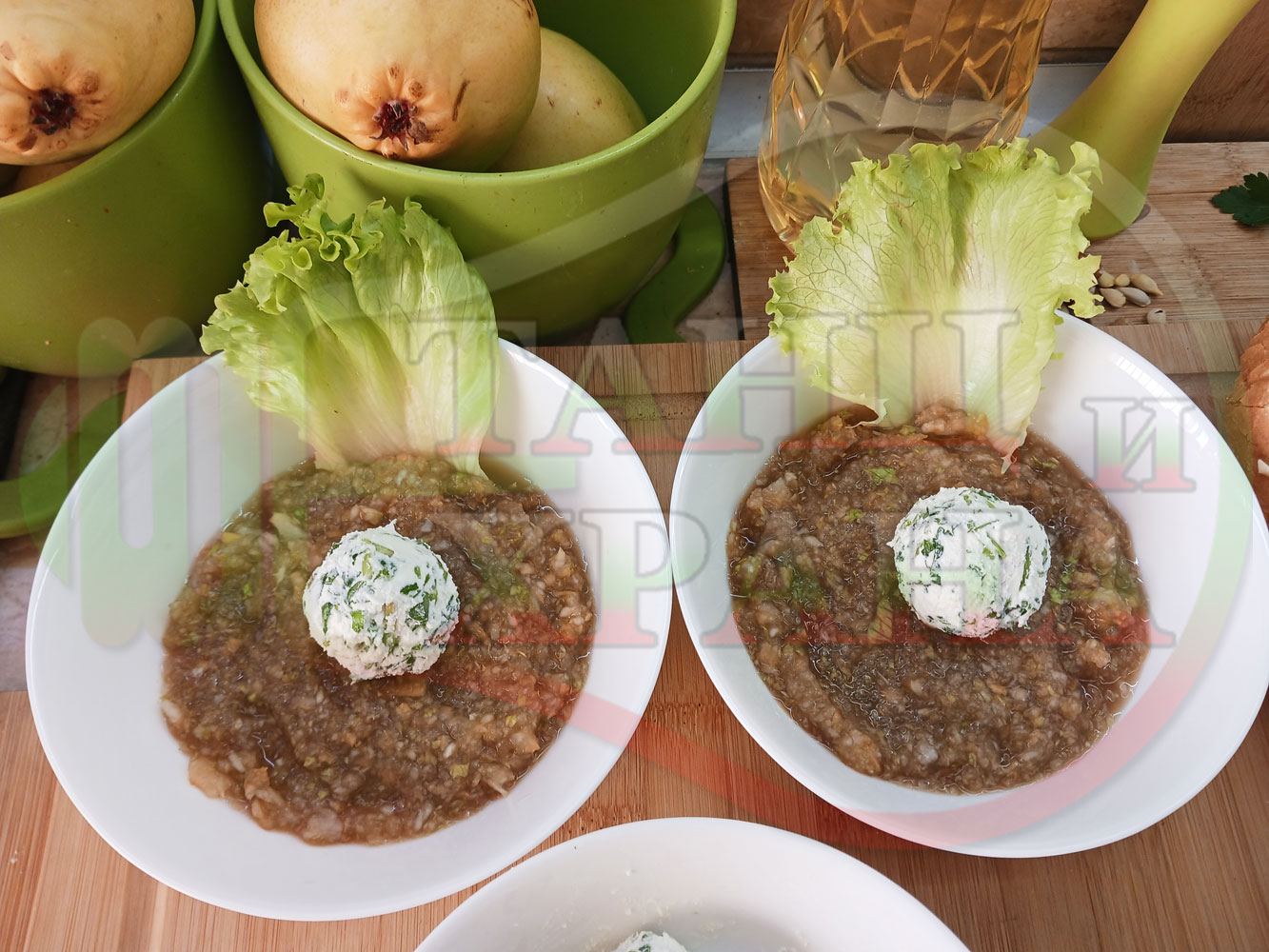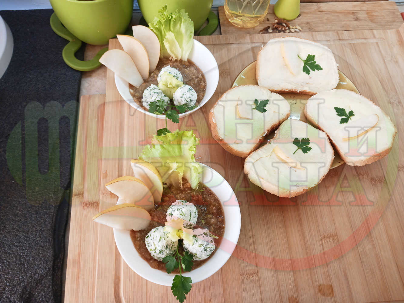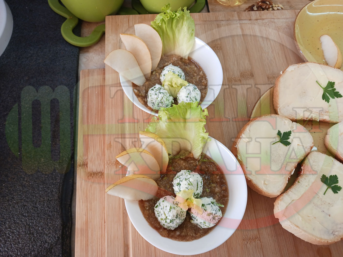 Българска плодова сурова супа "Крушова марулена с БГсирене" приготвена от пресни круши и свежа маруля гарнирана с топчета от сиренов крем с магданоз и краве бяло сирене (българско, саламурено) - двукомпонентна