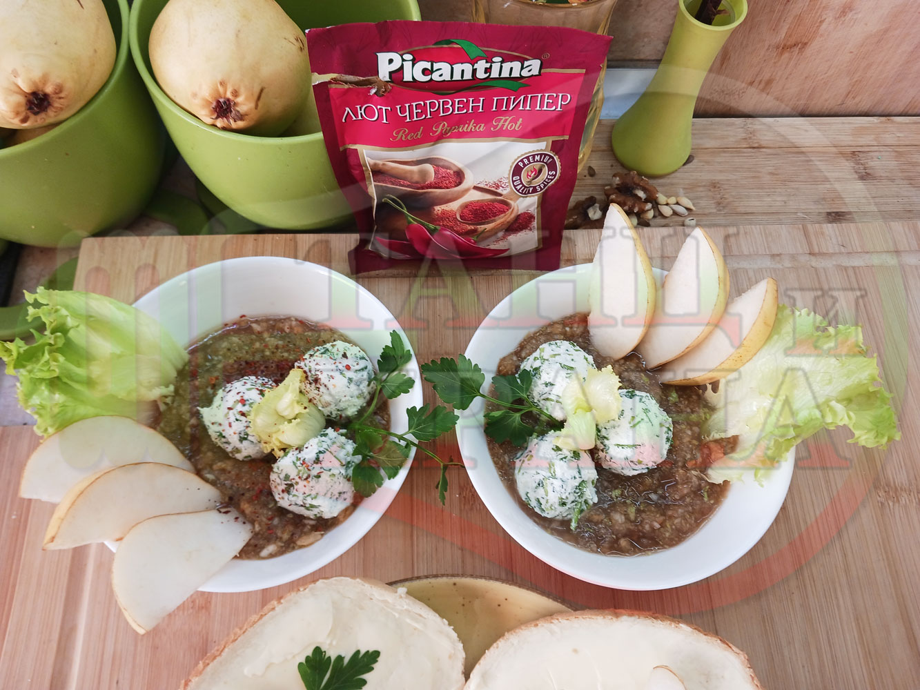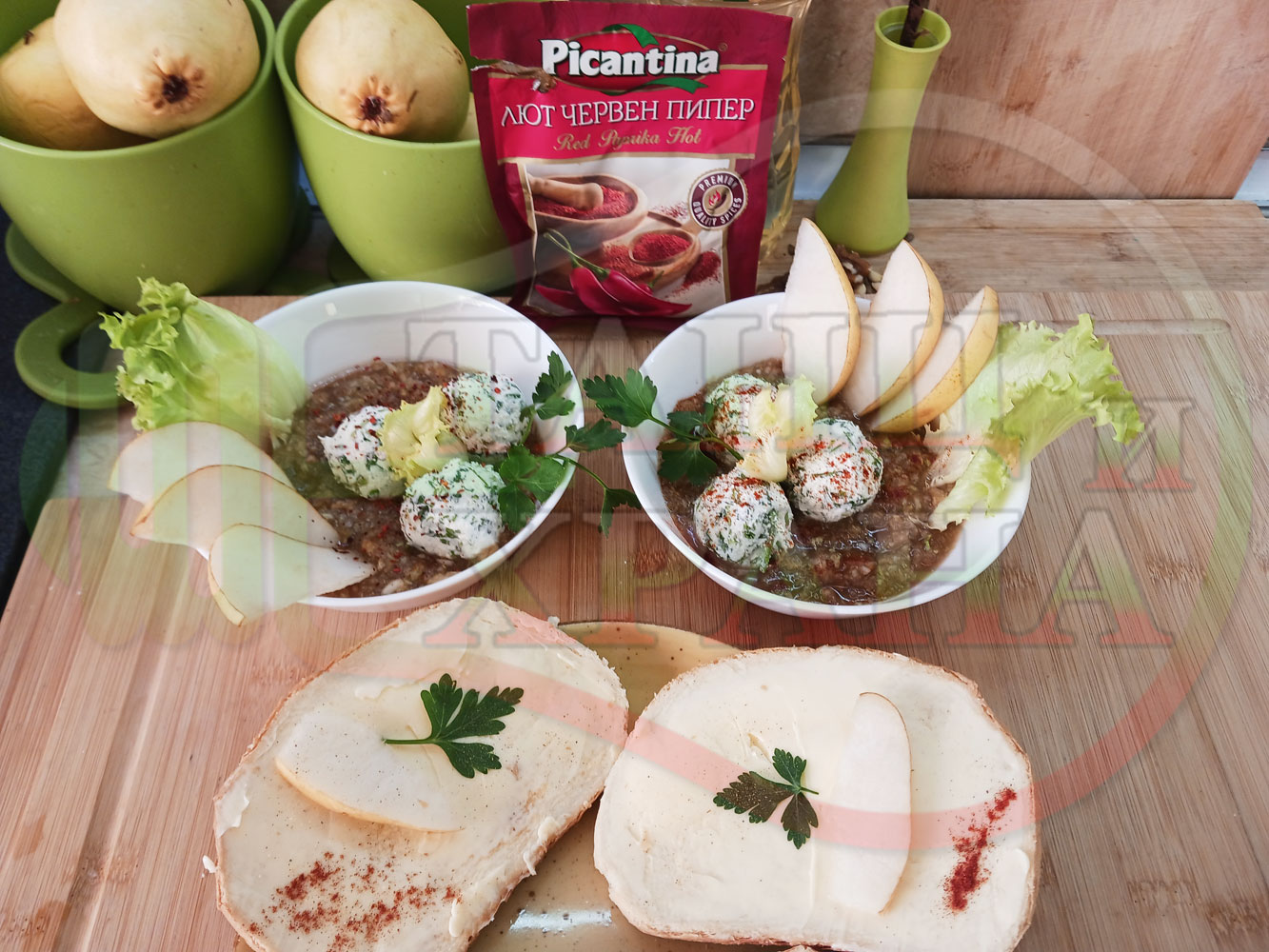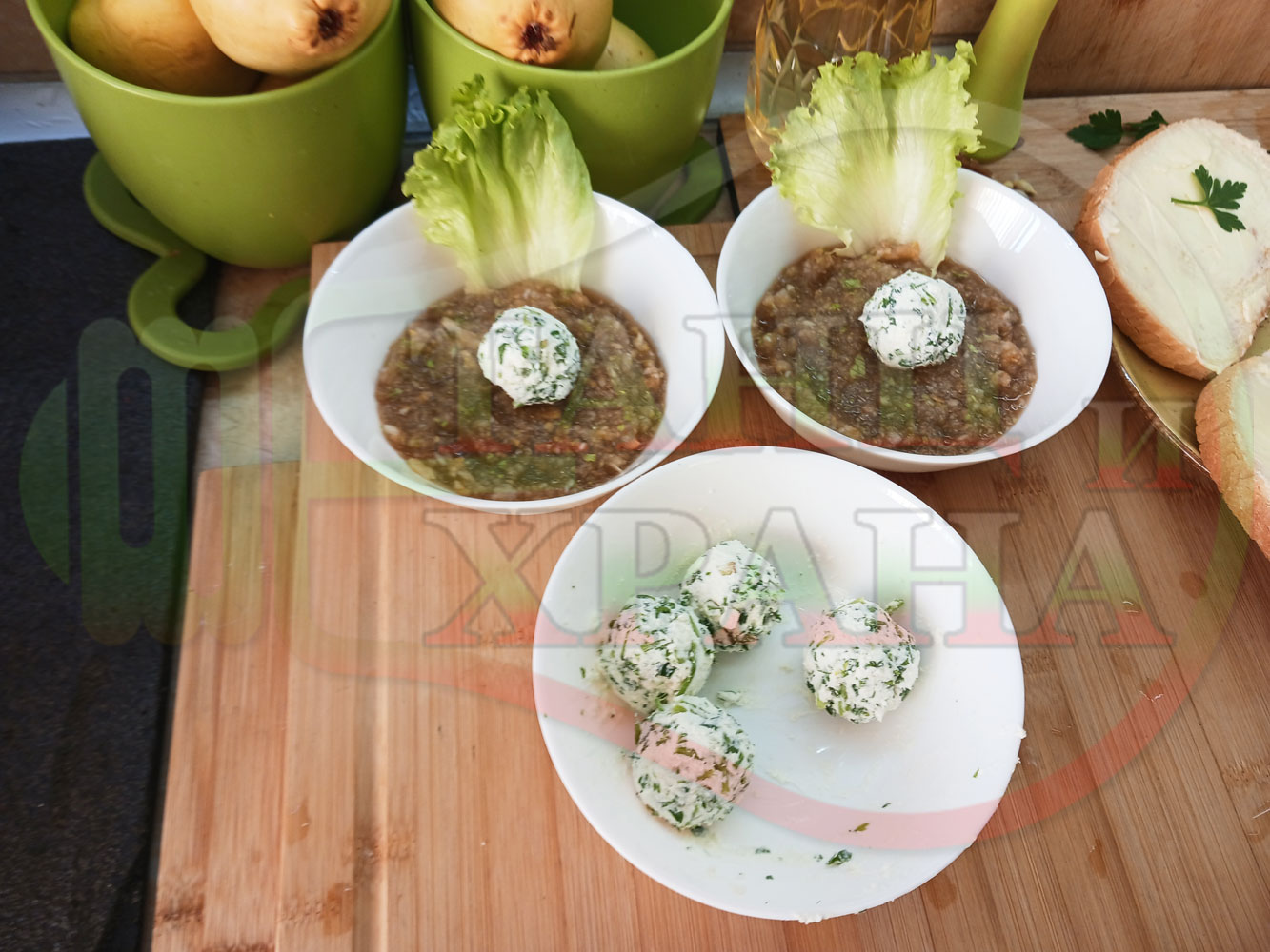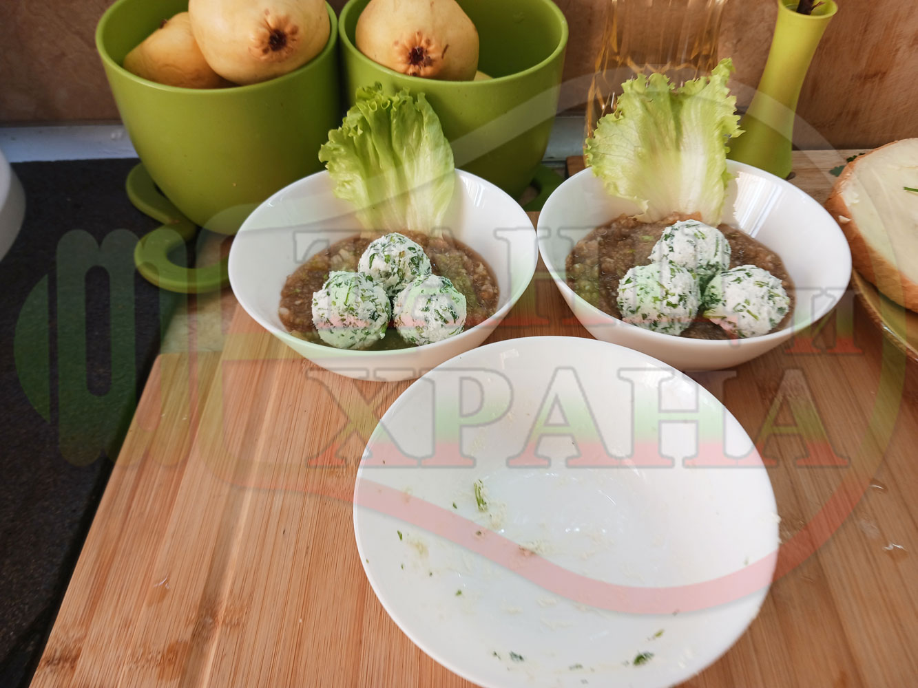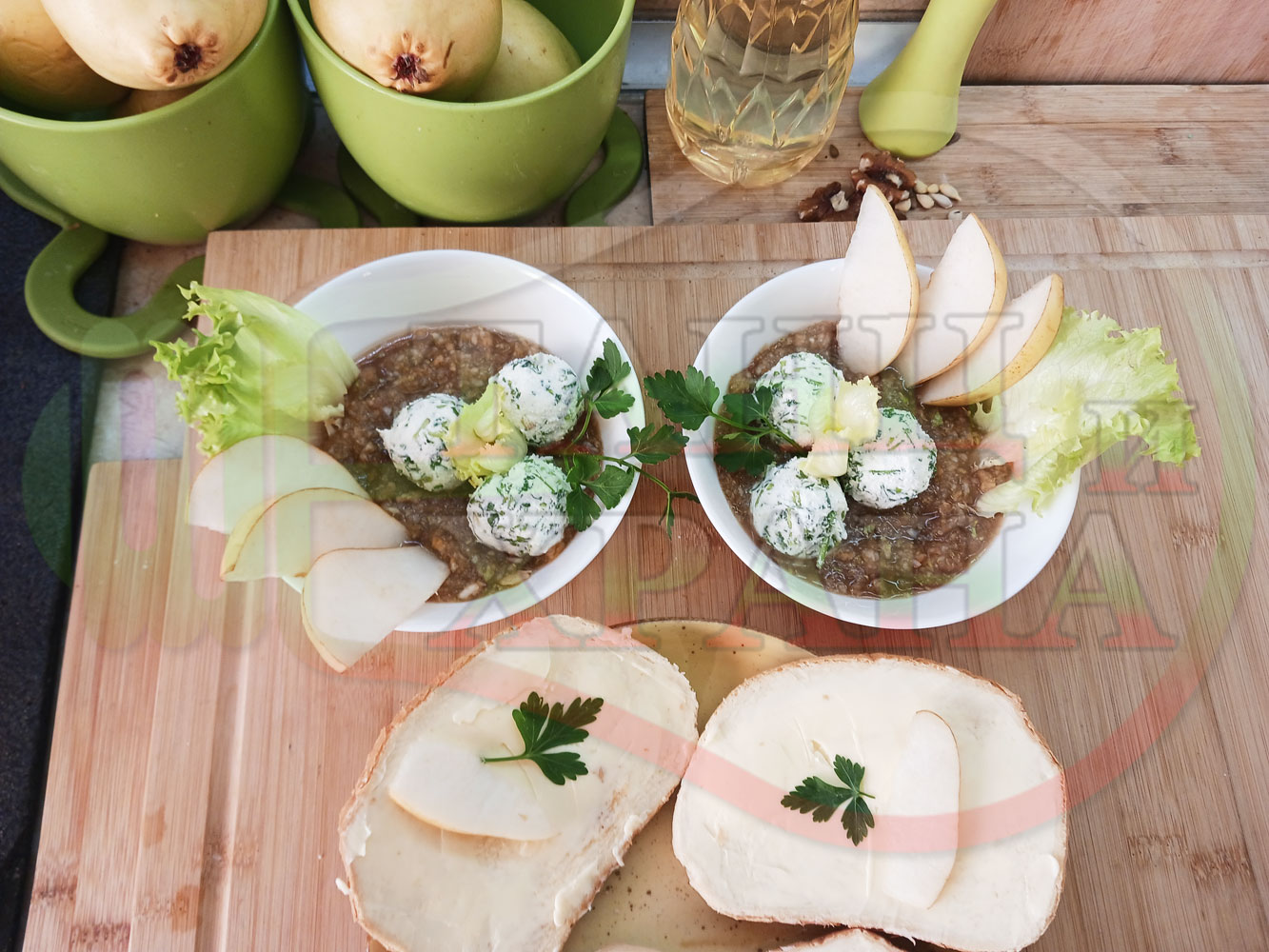 Българска плодова сурова супа "Крушова марулена с БГсирене" приготвена от пресни круши и свежа маруля гарнирана с топчета от сиренов крем с магданоз и краве бяло сирене (българско, саламурено) - двукомпонентна