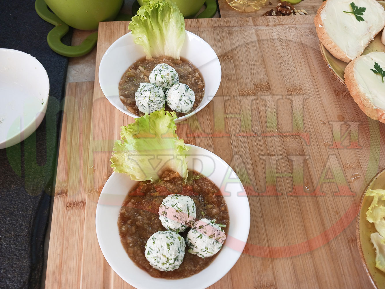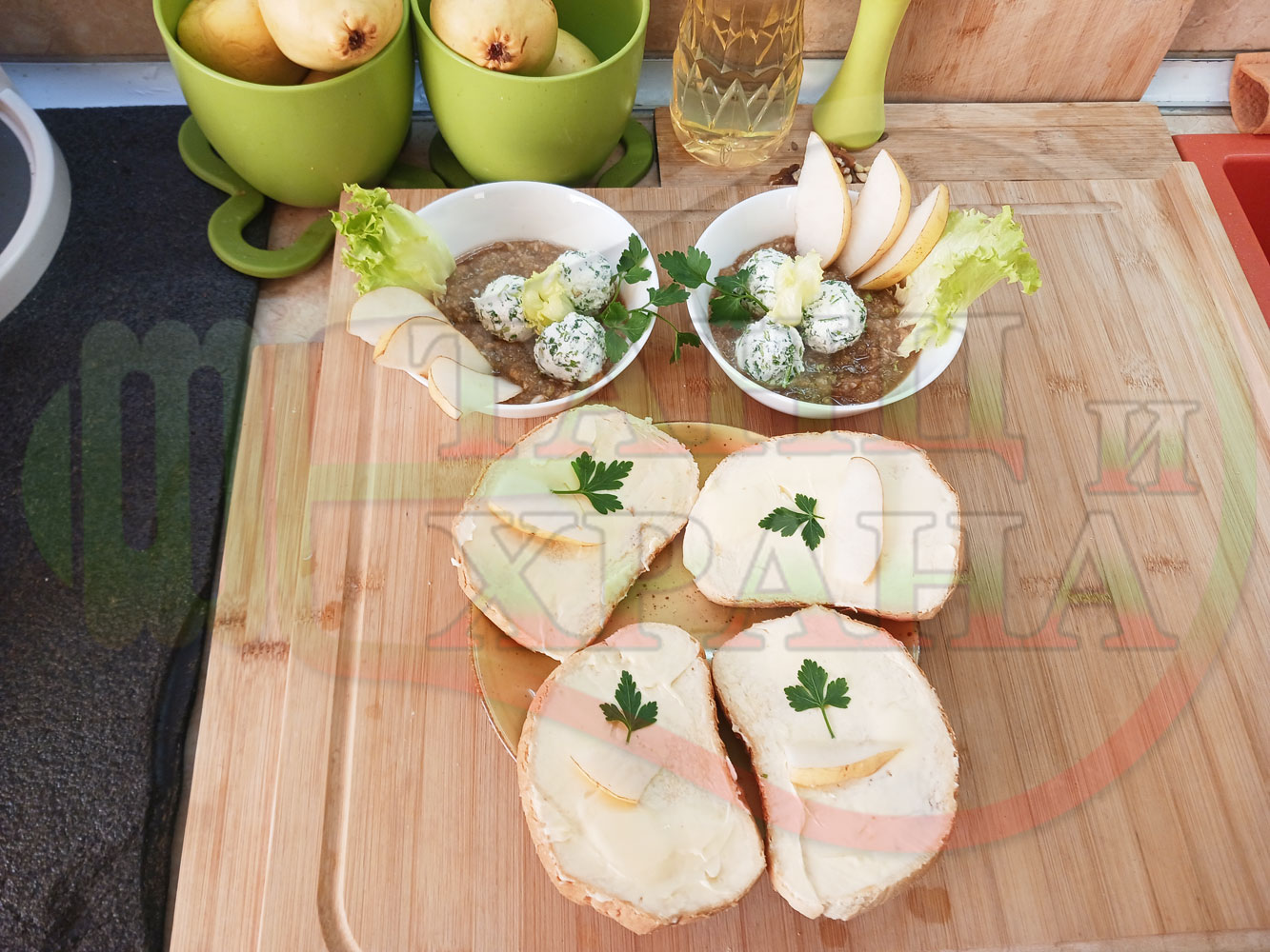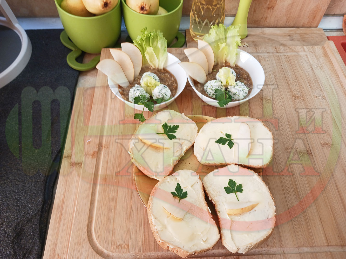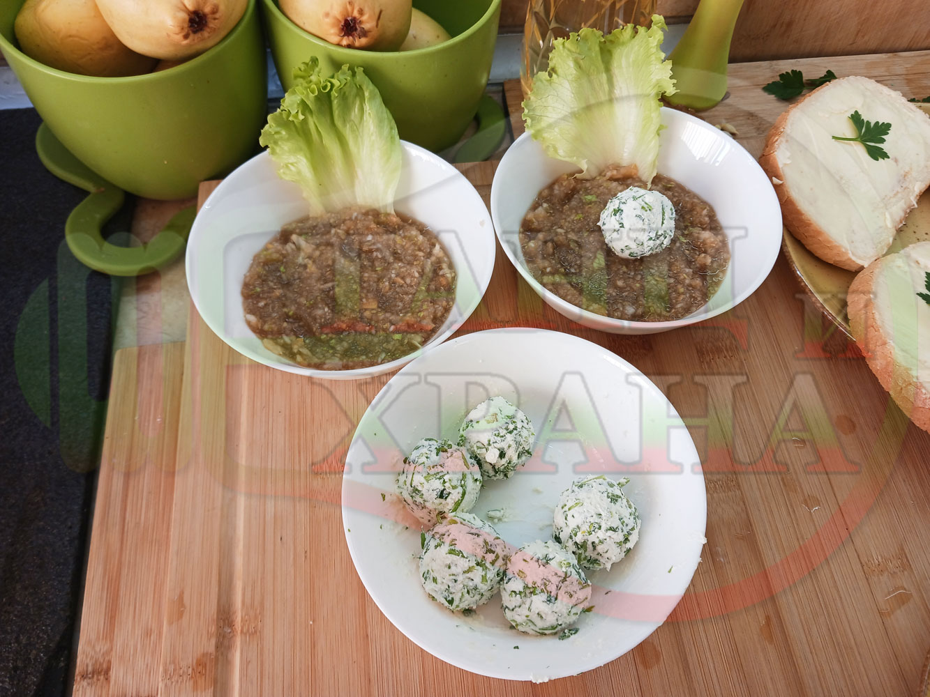 Българска плодова сурова супа "Крушова марулена с БГсирене" приготвена от пресни круши и свежа маруля гарнирана с топчета от сиренов крем с магданоз и краве бяло сирене (българско, саламурено) - двукомпонентна