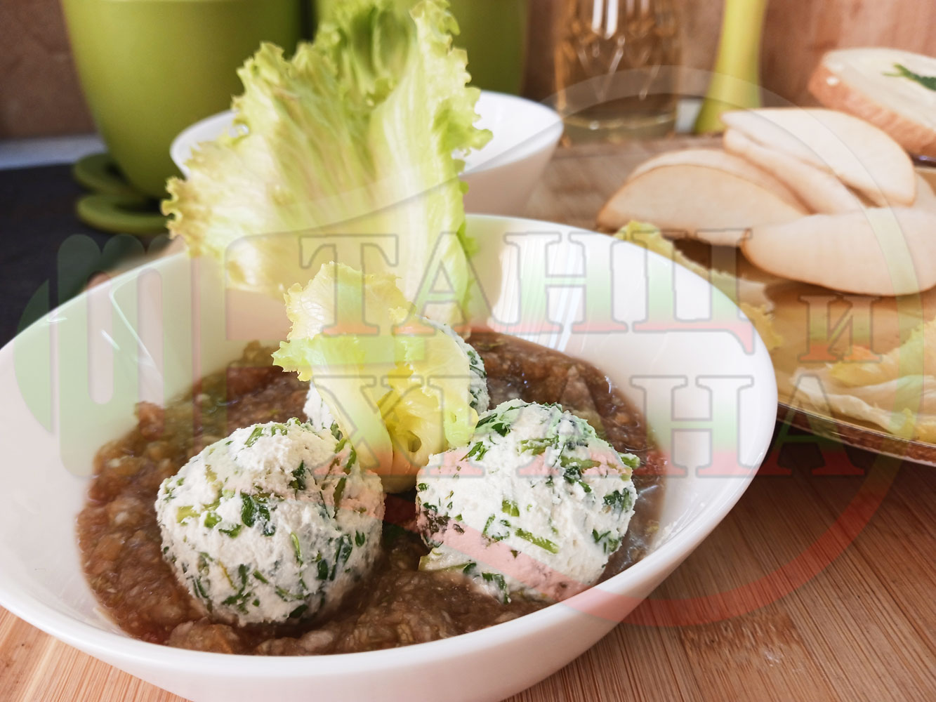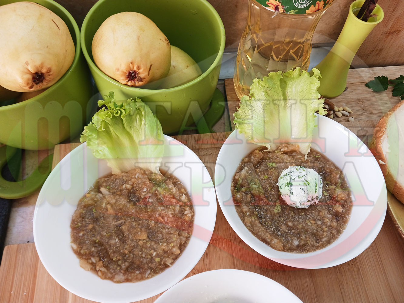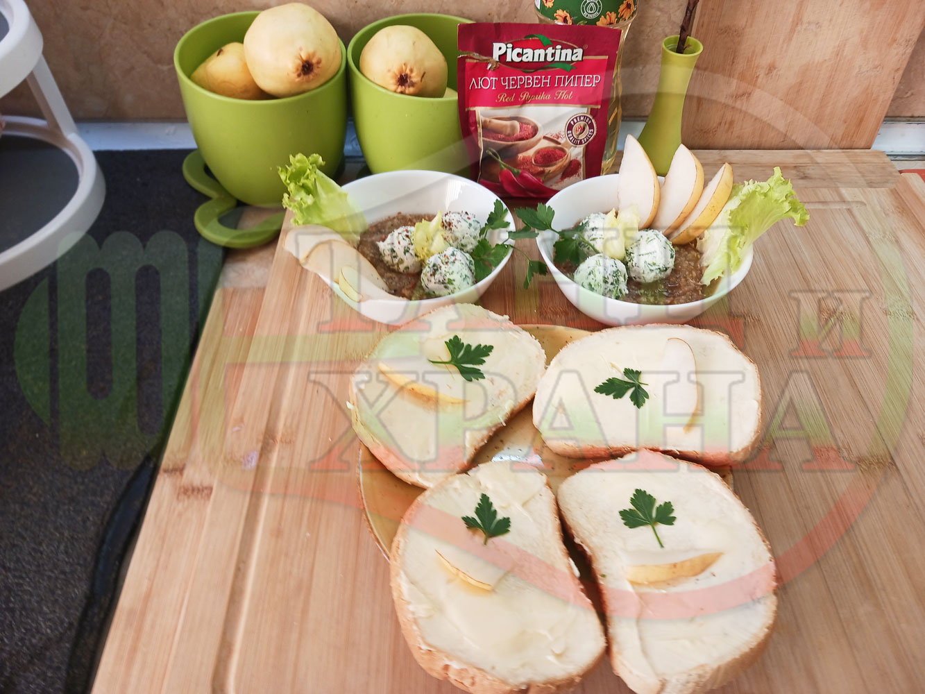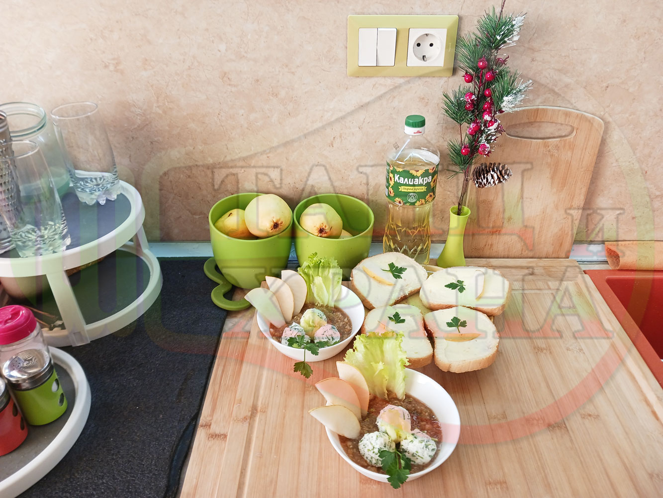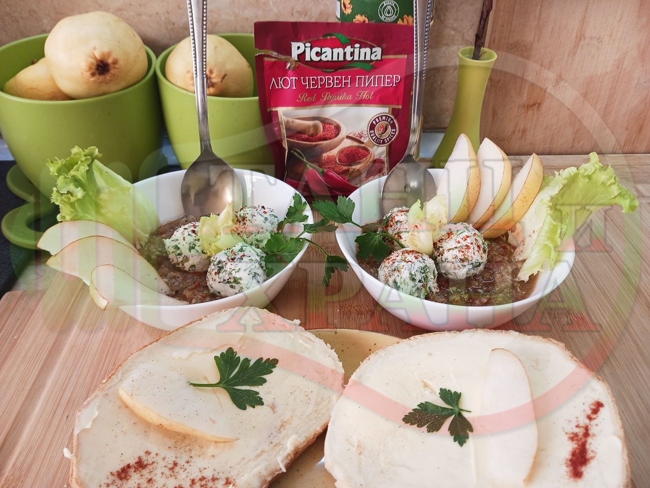 Българска плодова сурова супа "Крушова марулена с БГсирене" приготвена от пресни круши и свежа маруля гарнирана с топчета от сиренов крем с магданоз и краве бяло сирене (българско, саламурено) - двукомпонентна