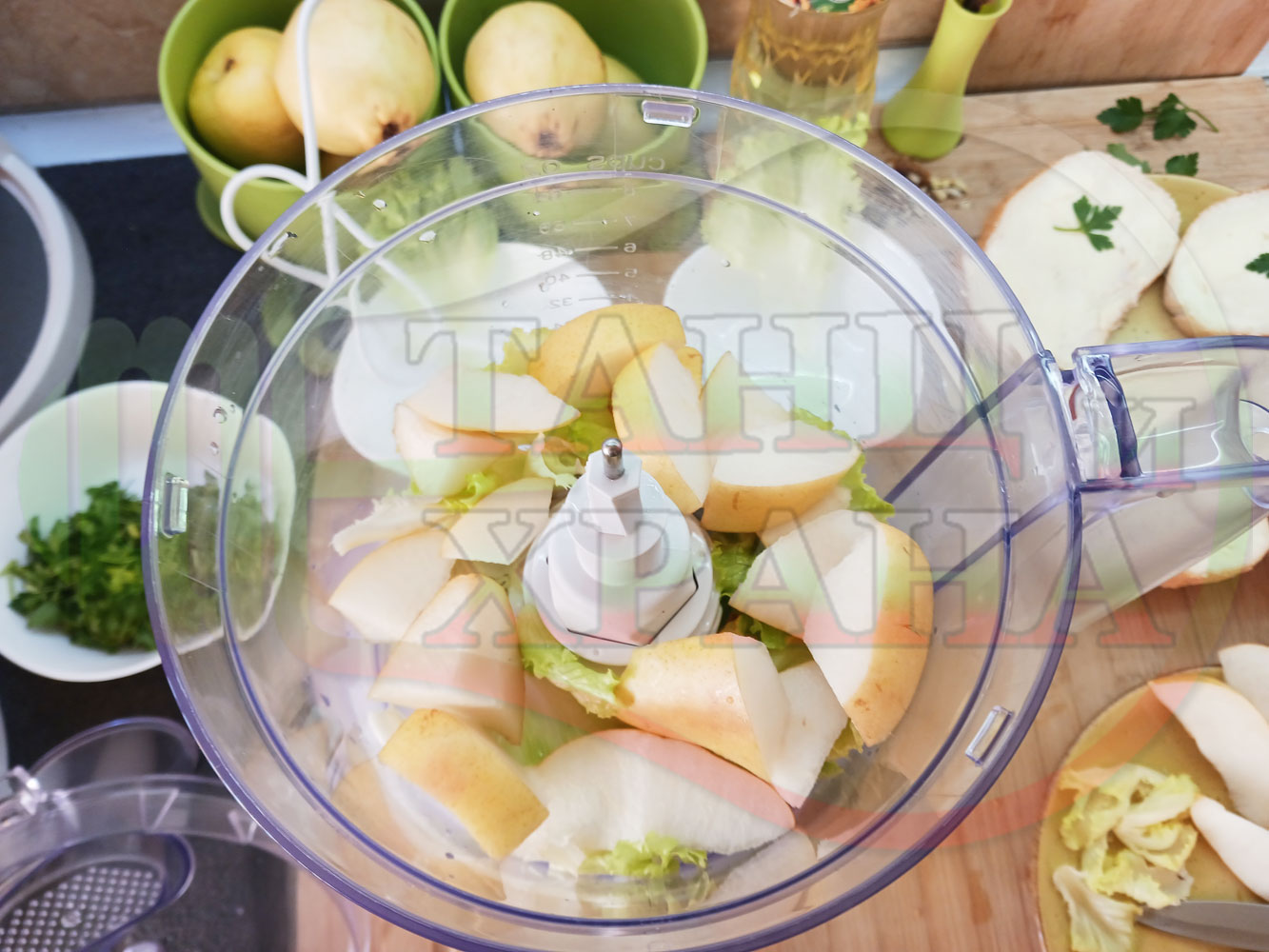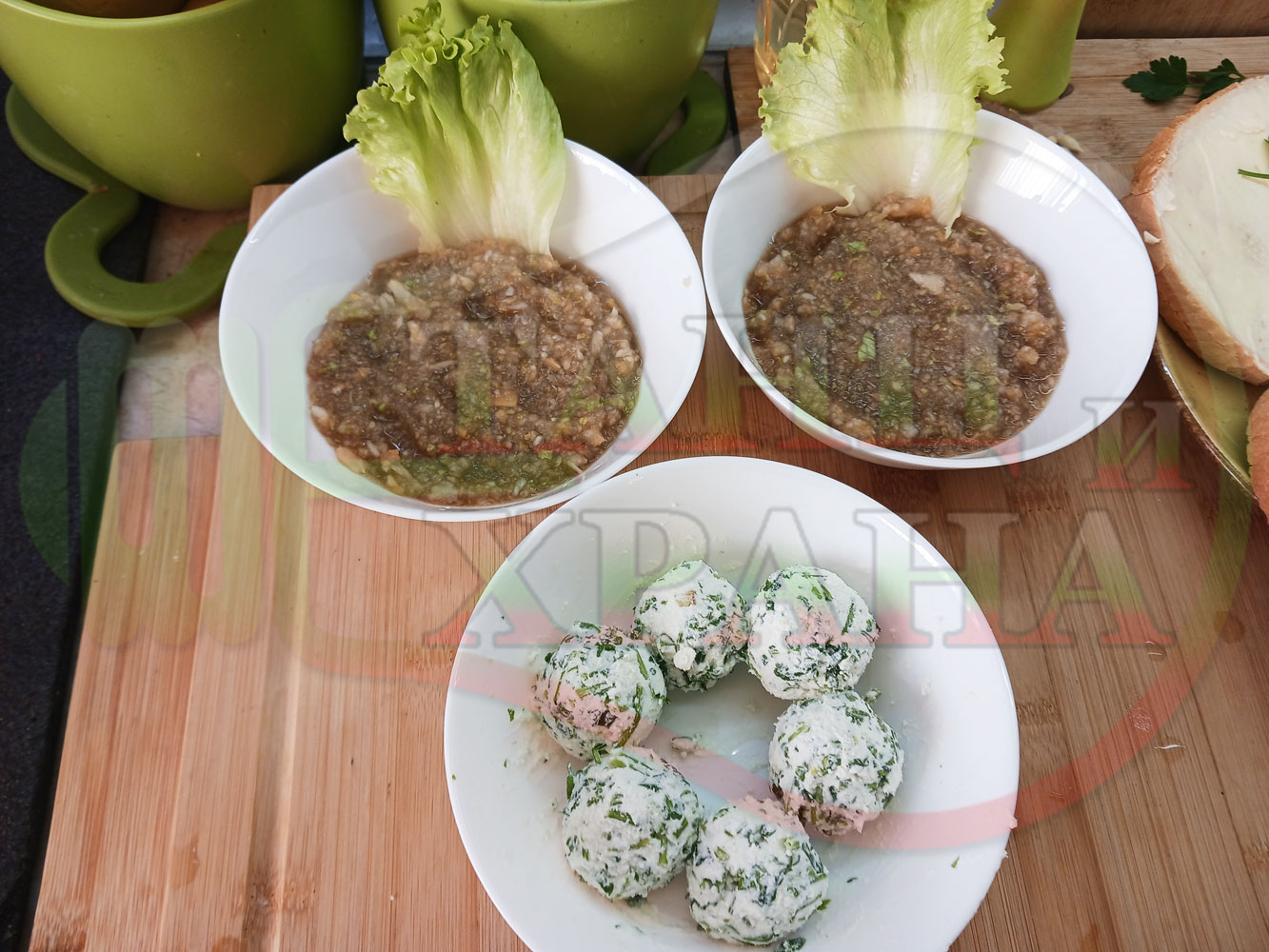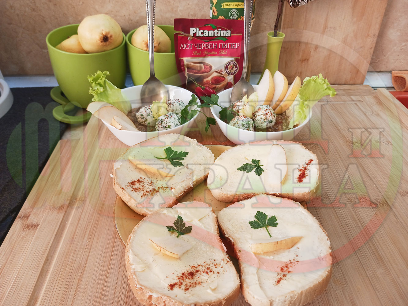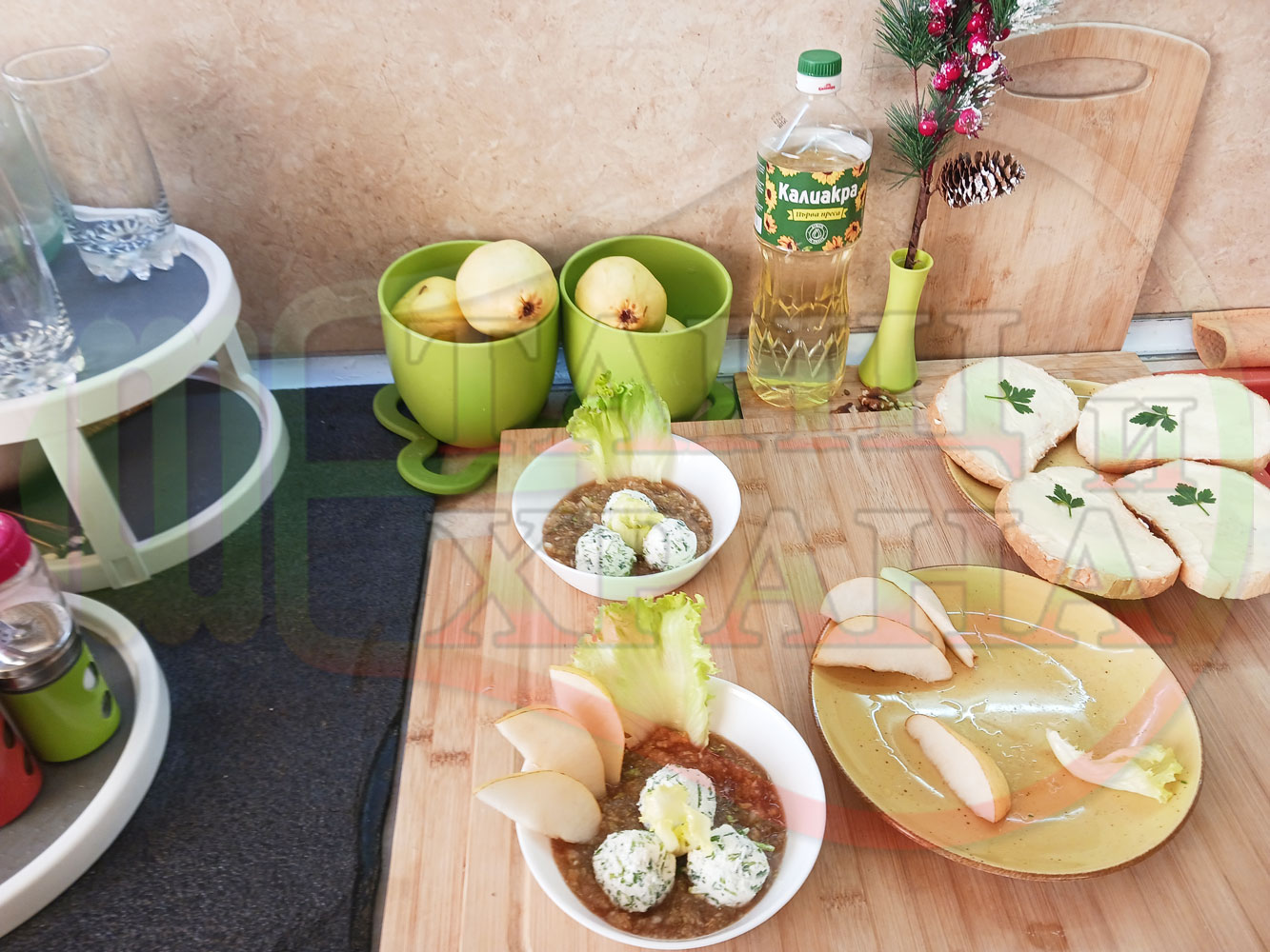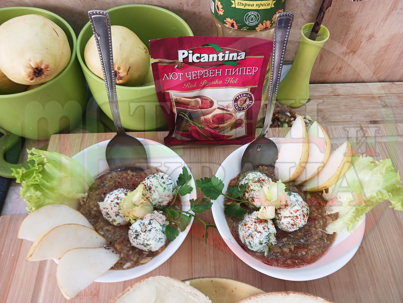 Българска плодова сурова супа "Крушова марулена с БГсирене" приготвена от пресни круши и свежа маруля гарнирана с топчета от сиренов крем с магданоз и краве бяло сирене (българско, саламурено) - двукомпонентна
