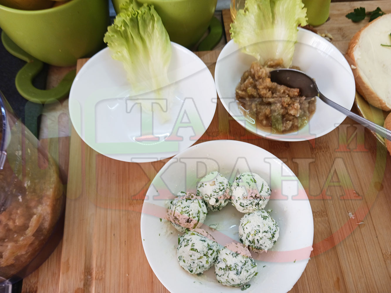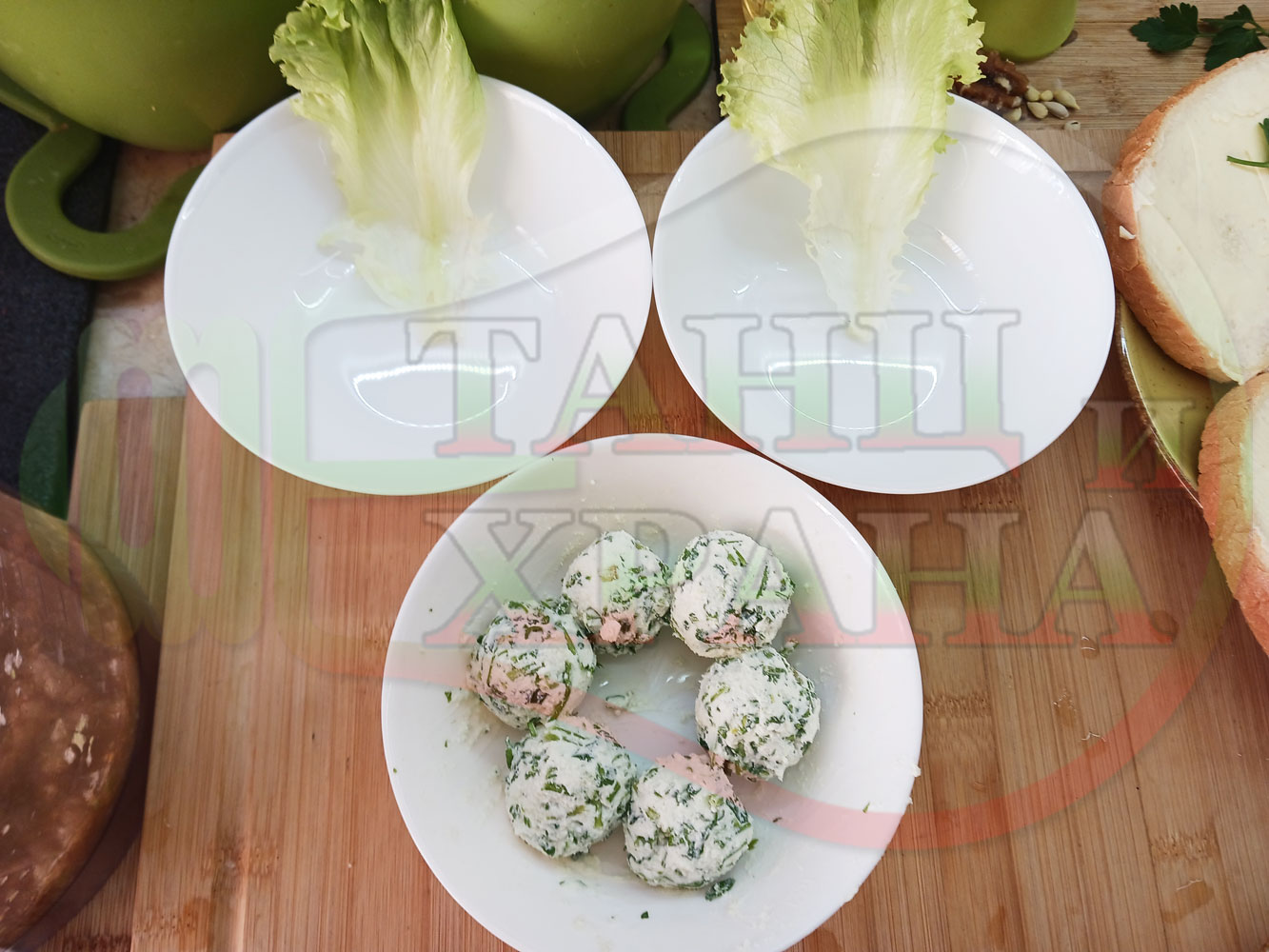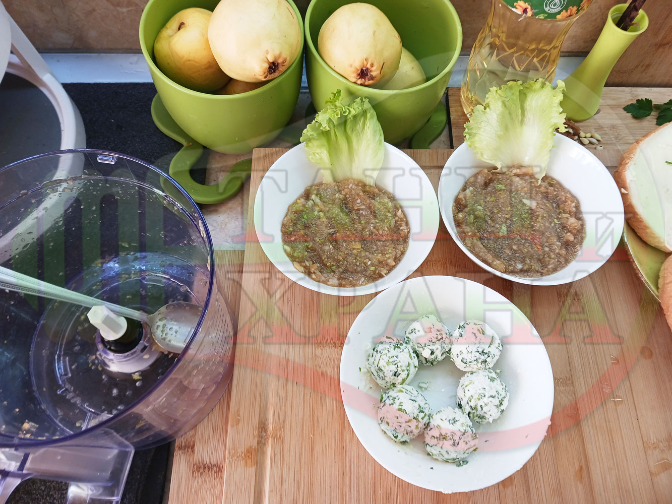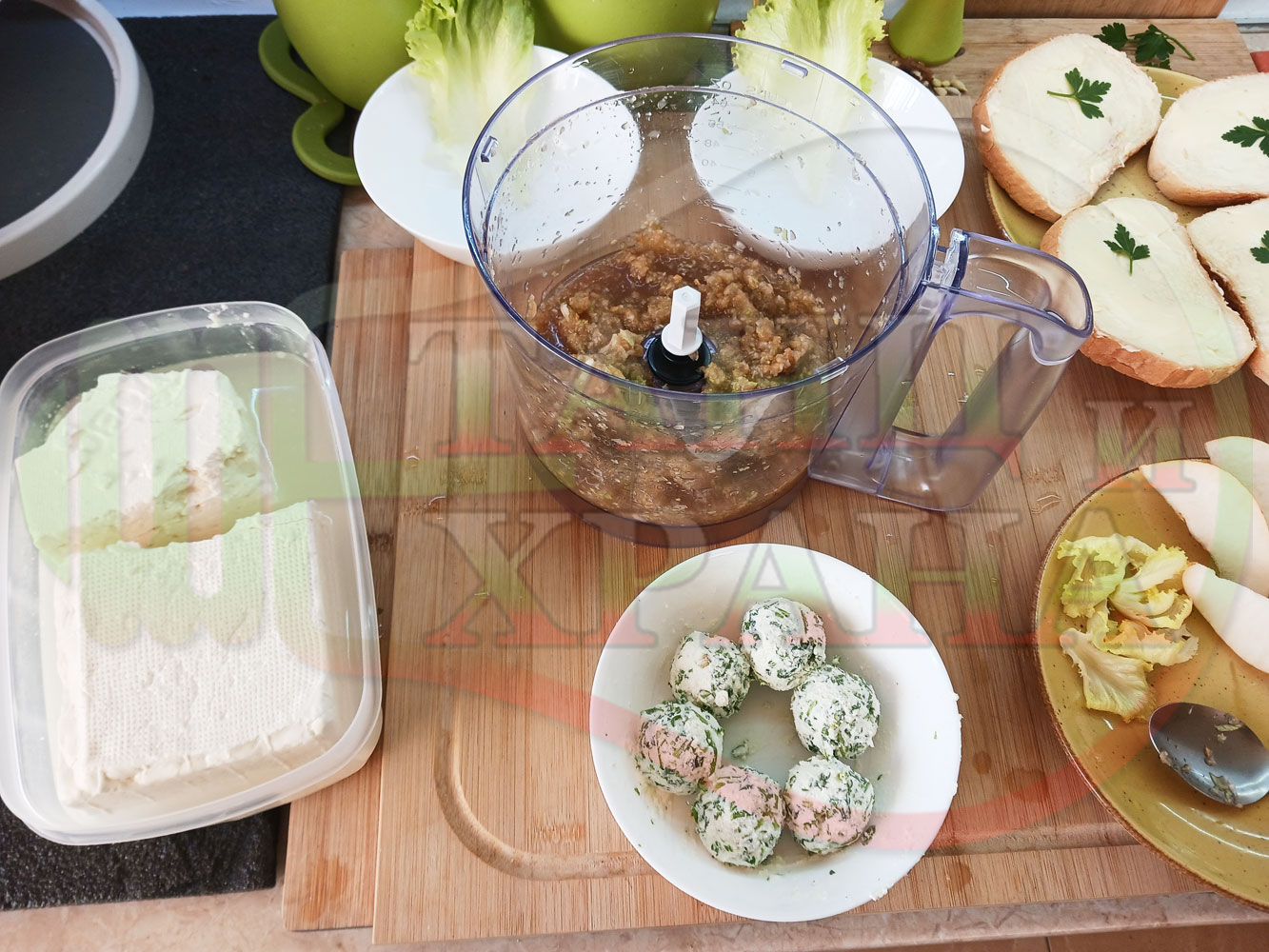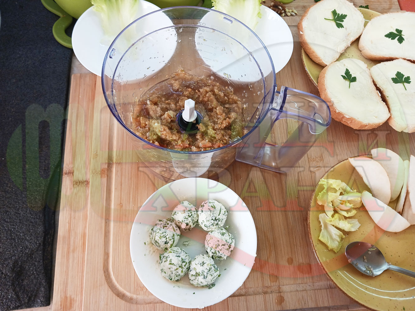 Българска плодова сурова супа "Крушова марулена с БГсирене" приготвена от пресни круши и свежа маруля гарнирана с топчета от сиренов крем с магданоз и краве бяло сирене (българско, саламурено) - двукомпонентна