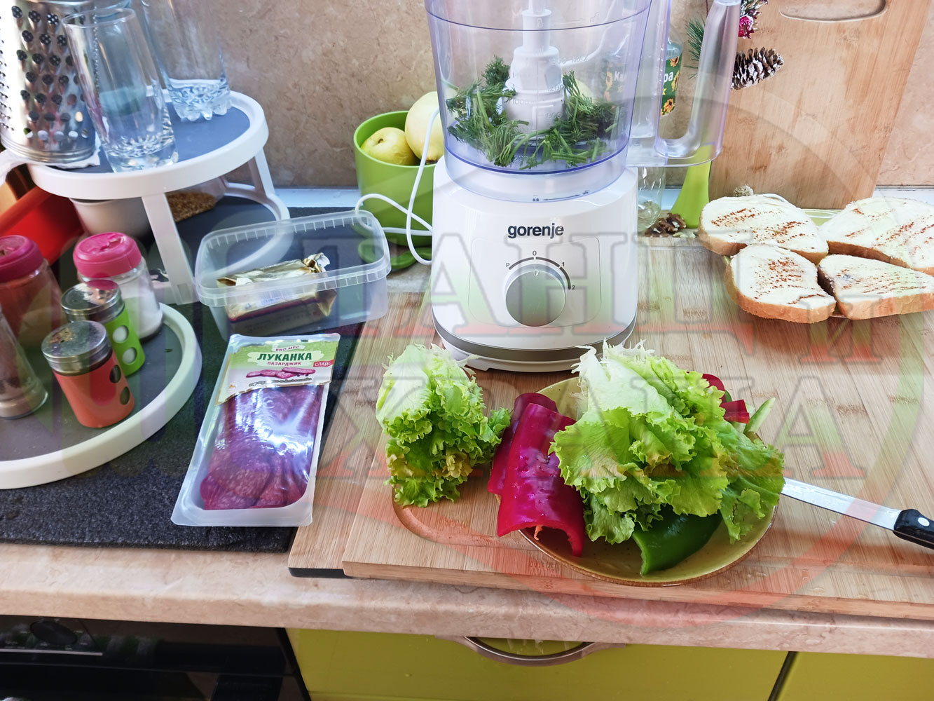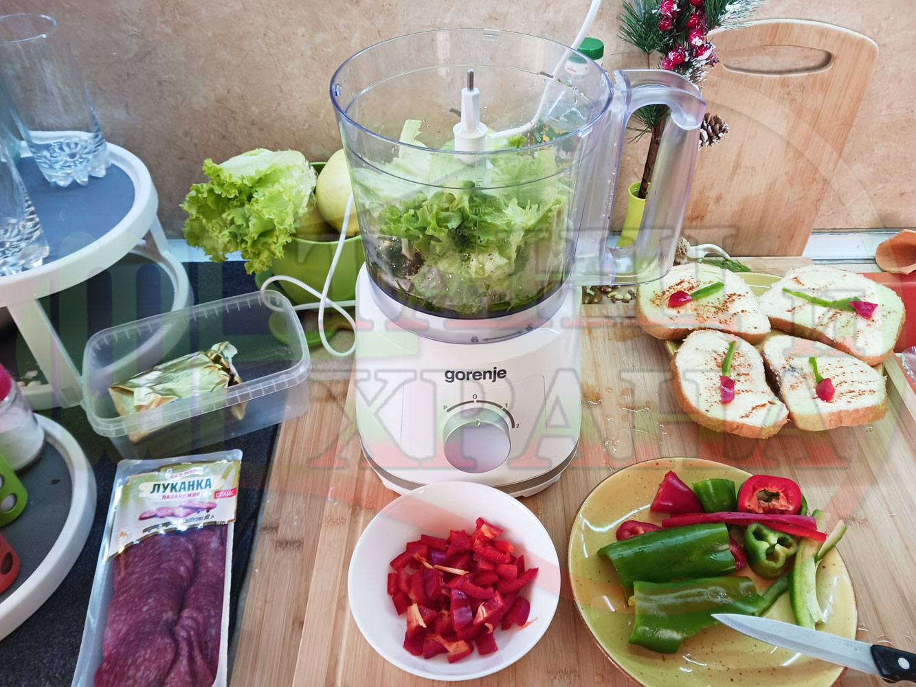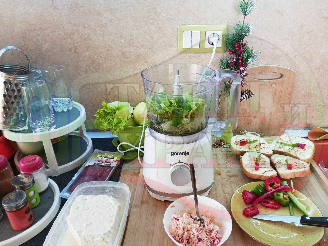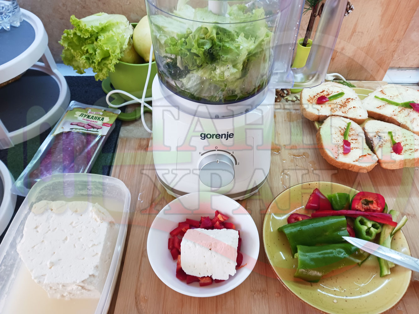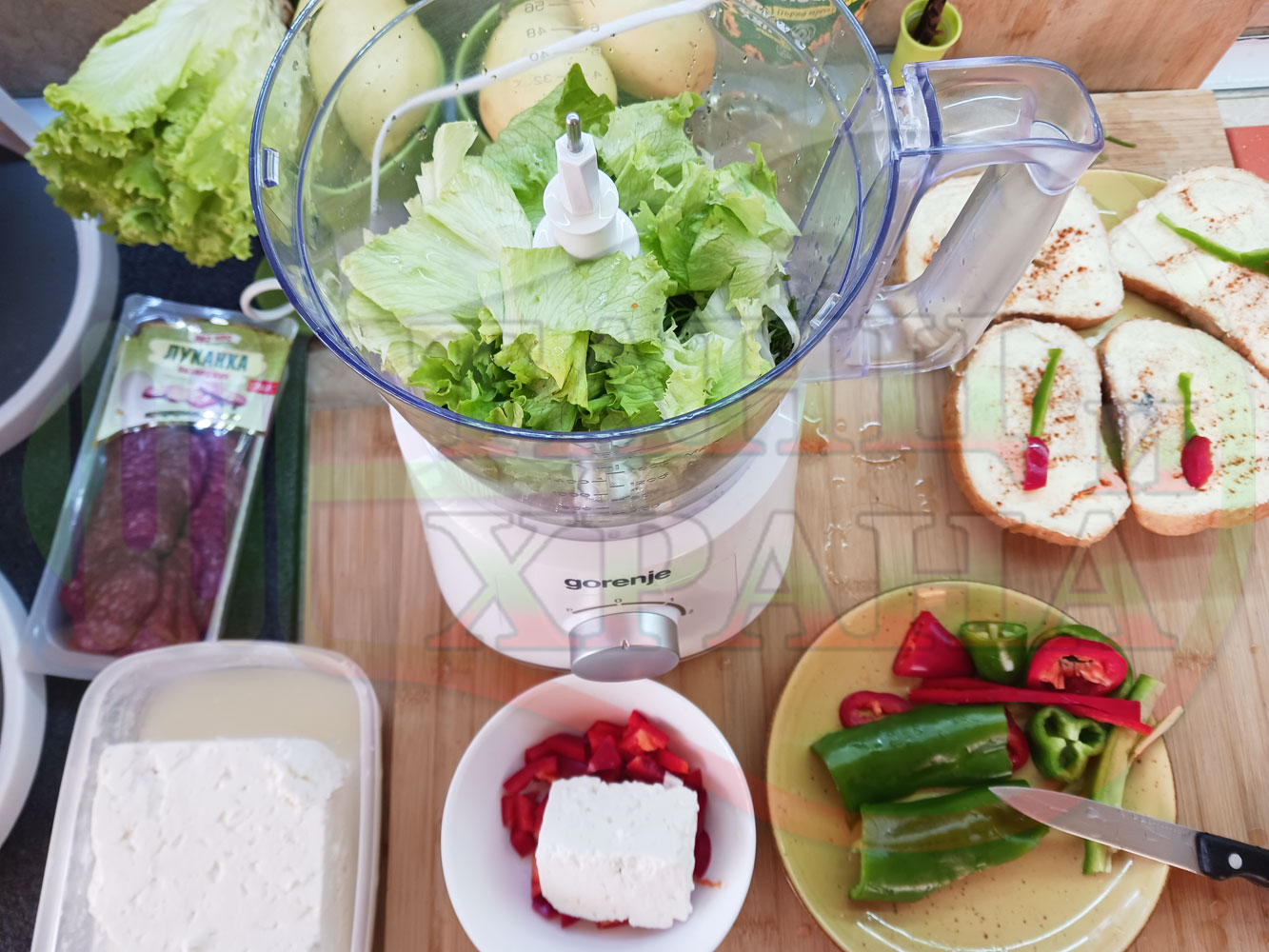 ПРОДУКТИ: Приблизителни количества за българска сурова студена супа "Марулена зеленопиперкова чайножасминова с БГсирене" приготвена от маруля, копър, зелени чушки и зелен чай със жасмин гарнирана с луканка и с топчета от сиренов крем с червени чушки и краве бяло сирене - двукомпонентна