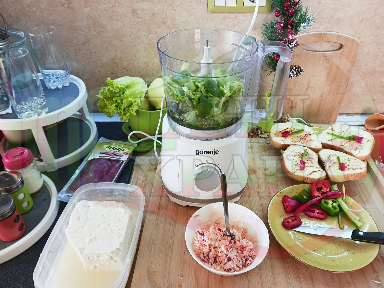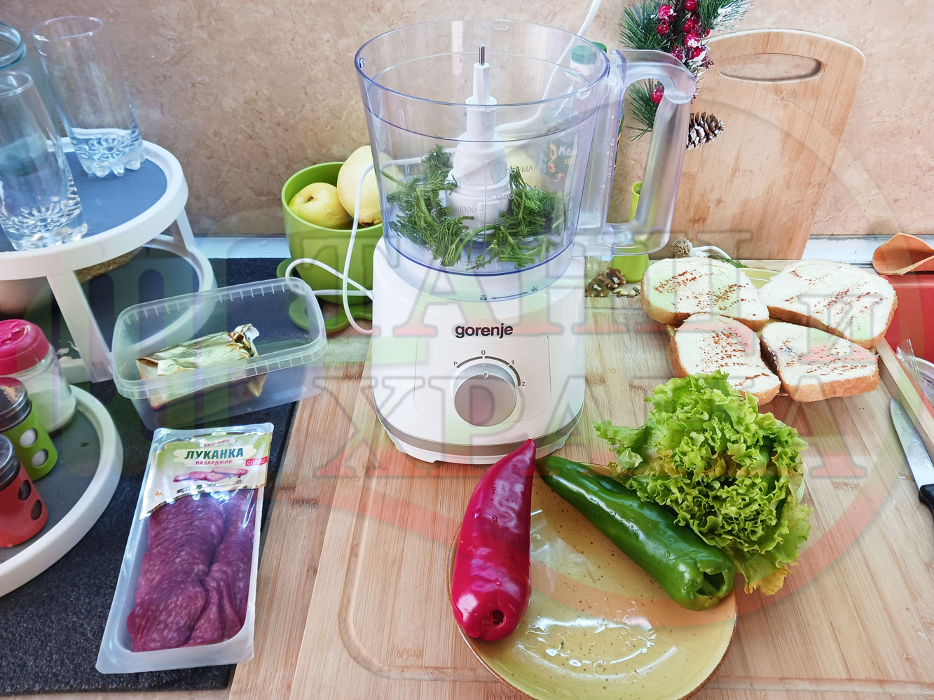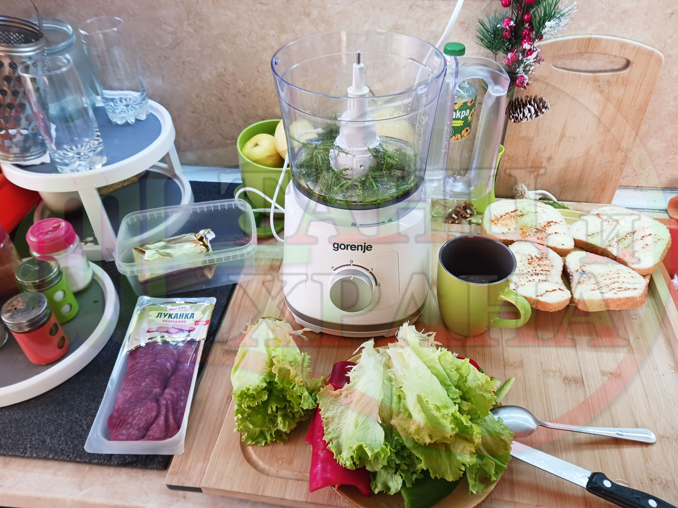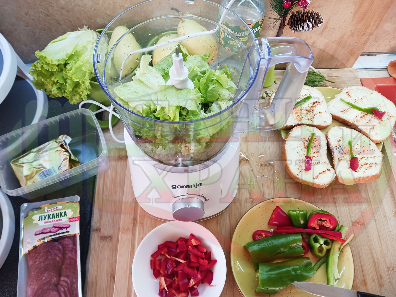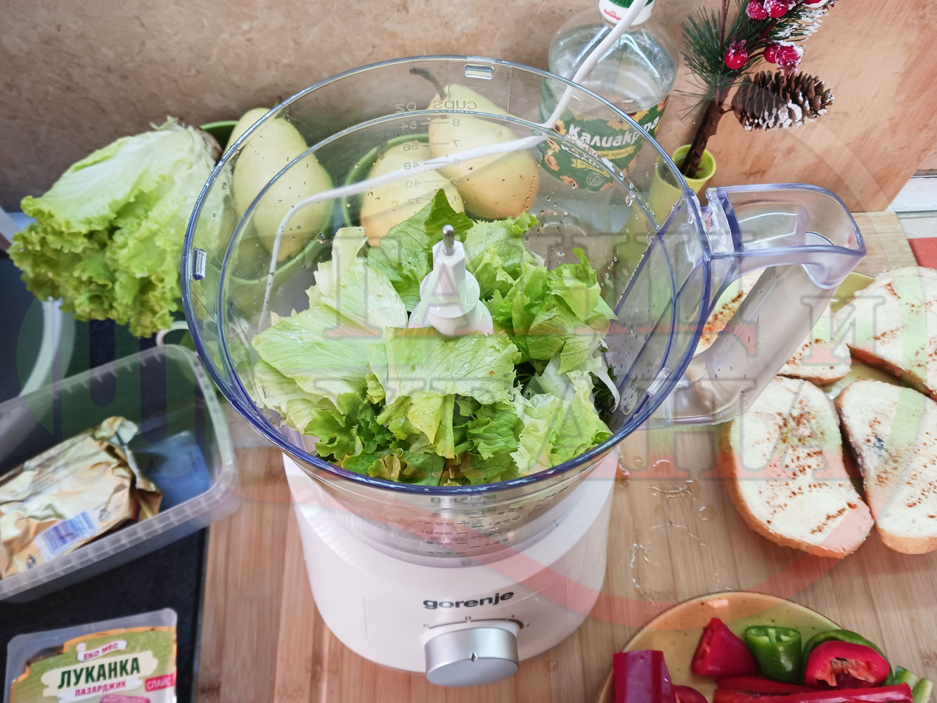 ПРОДУКТИ: Приблизителни количества за българска сурова студена супа "Марулена зеленопиперкова чайножасминова с БГсирене" приготвена от маруля, копър, зелени чушки и зелен чай със жасмин гарнирана с луканка и с топчета от сиренов крем с червени чушки и краве бяло сирене - двукомпонентна