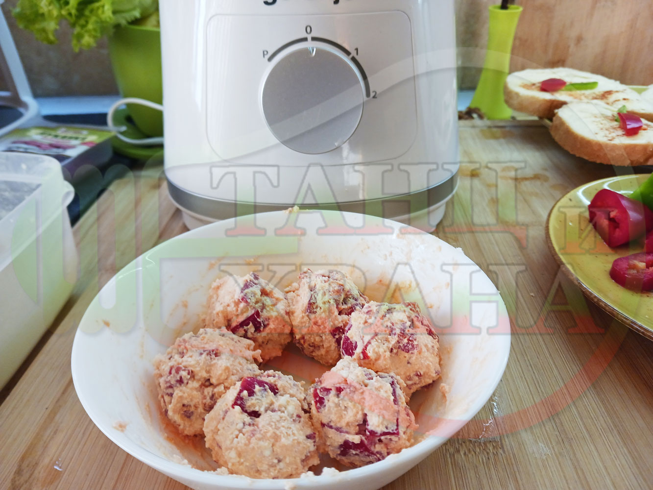 Добавете българско краве бяло сирене в купата към нарязаната на малки парченца червена чушка. Разбъркайте и намачкайте с вилица сиренето и чушката до образуване на средно гъст сиреново червеночушков, хомогенизиран крем (сиренов крем). Оформете 6 топчета от сиреновия крем за гарниране на супите.