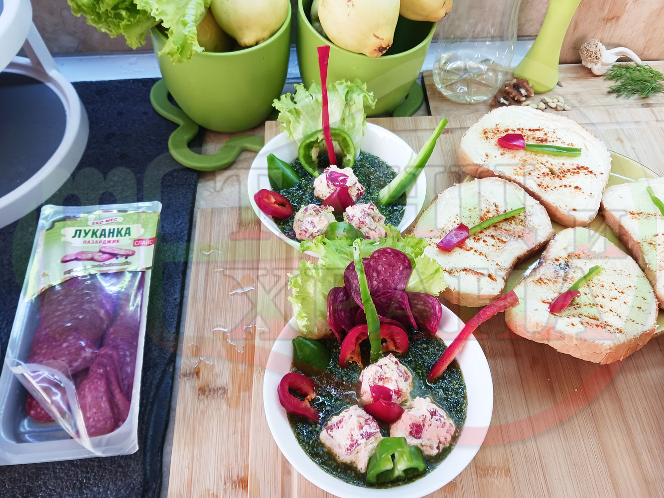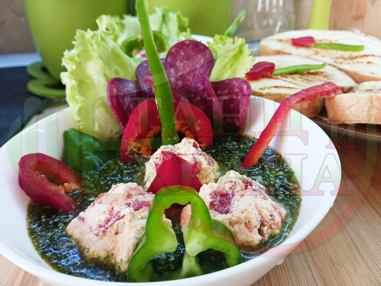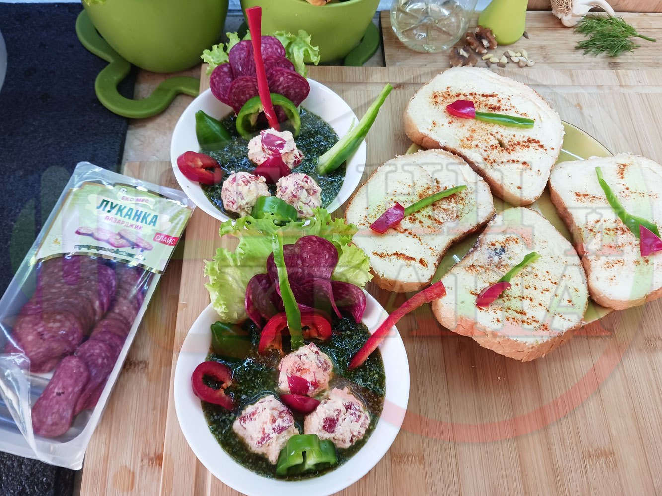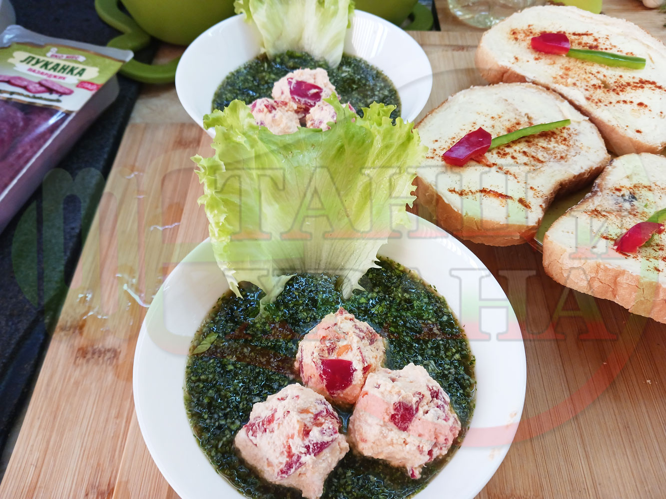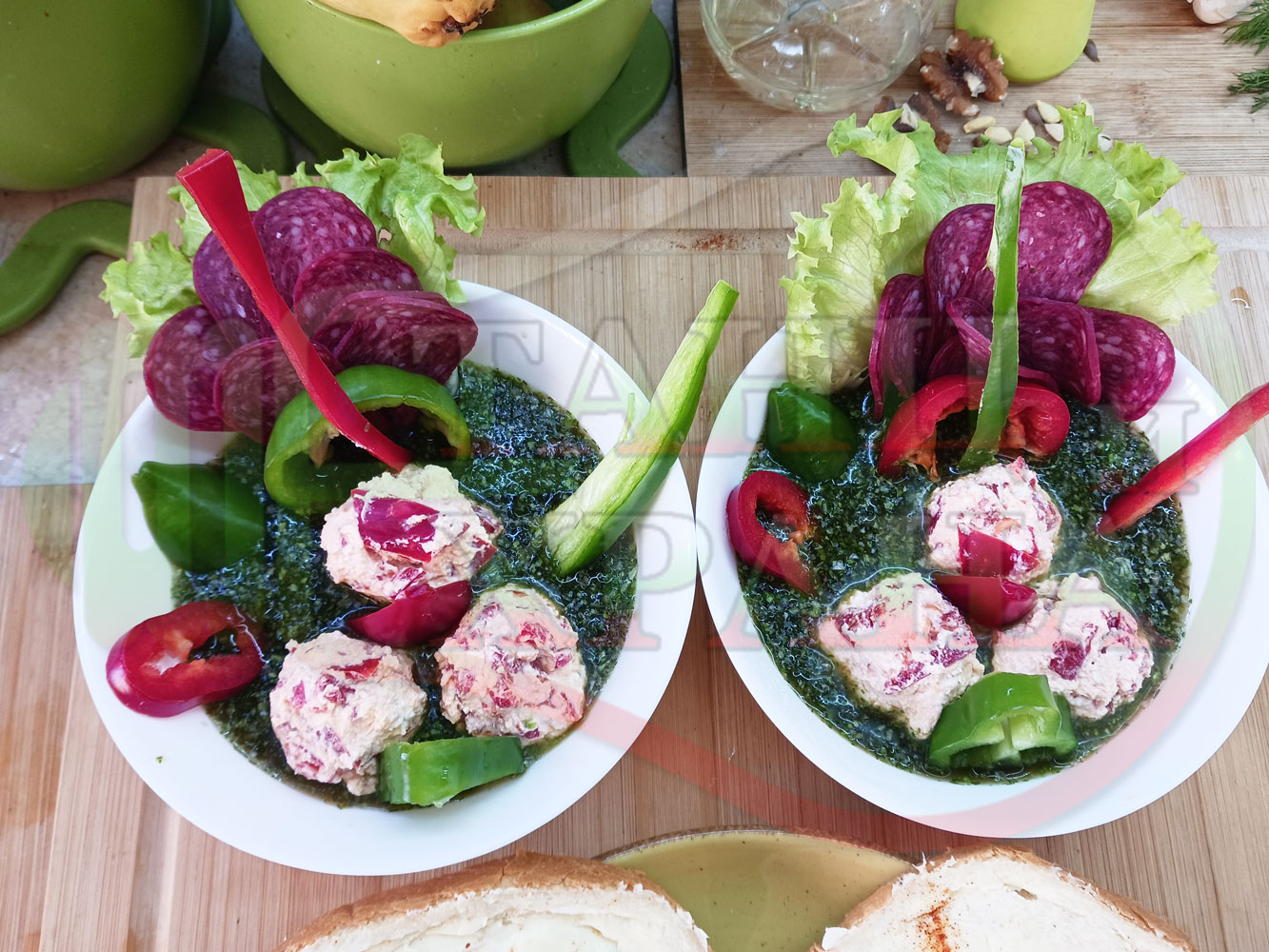 Българска сурова студена супа "Марулена зеленопиперкова чайножасминова с БГсирене" приготвена от маруля, копър, зелени чушки и зелен чай със жасмин гарнирана с луканка и с топчета от сиренов крем с червени чушки и краве бяло сирене - двукомпонентна