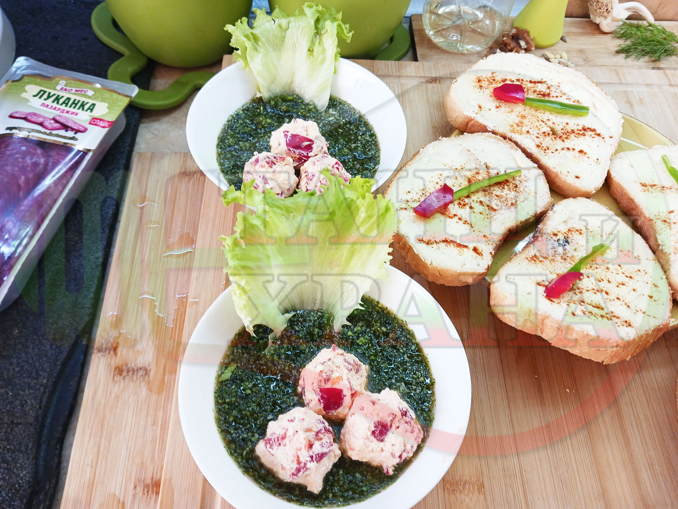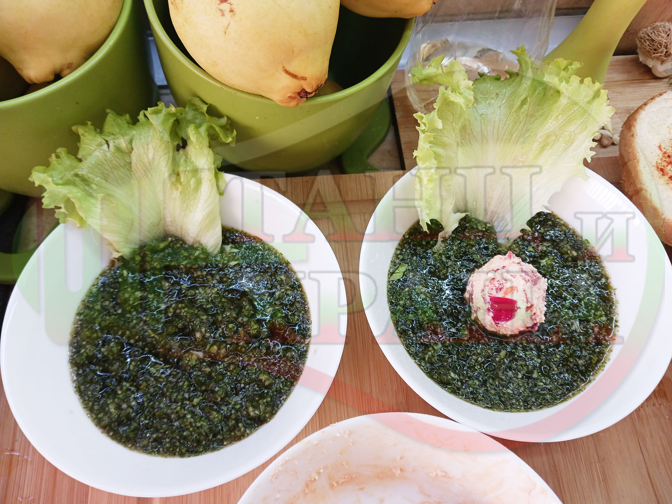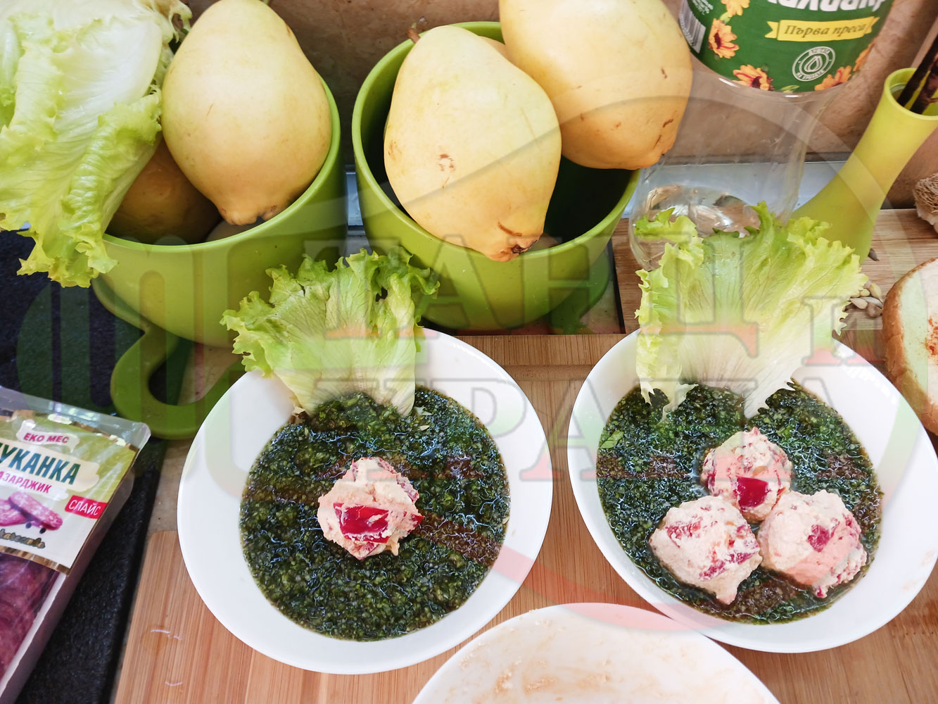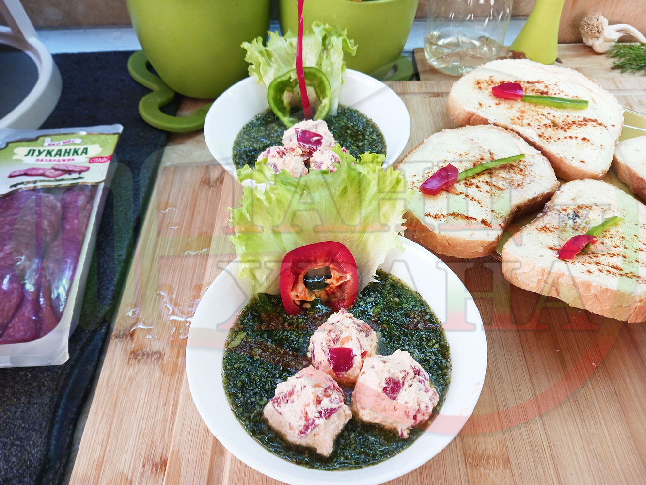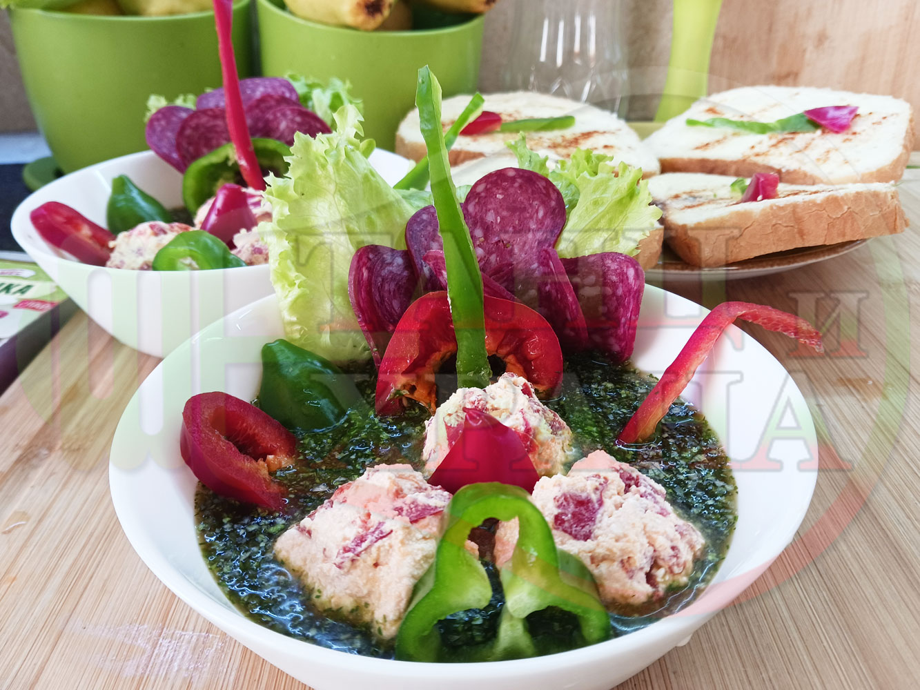 Българска сурова студена супа "Марулена зеленопиперкова чайножасминова с БГсирене" приготвена от маруля, копър, зелени чушки и зелен чай със жасмин гарнирана с луканка и с топчета от сиренов крем с червени чушки и краве бяло сирене - двукомпонентна