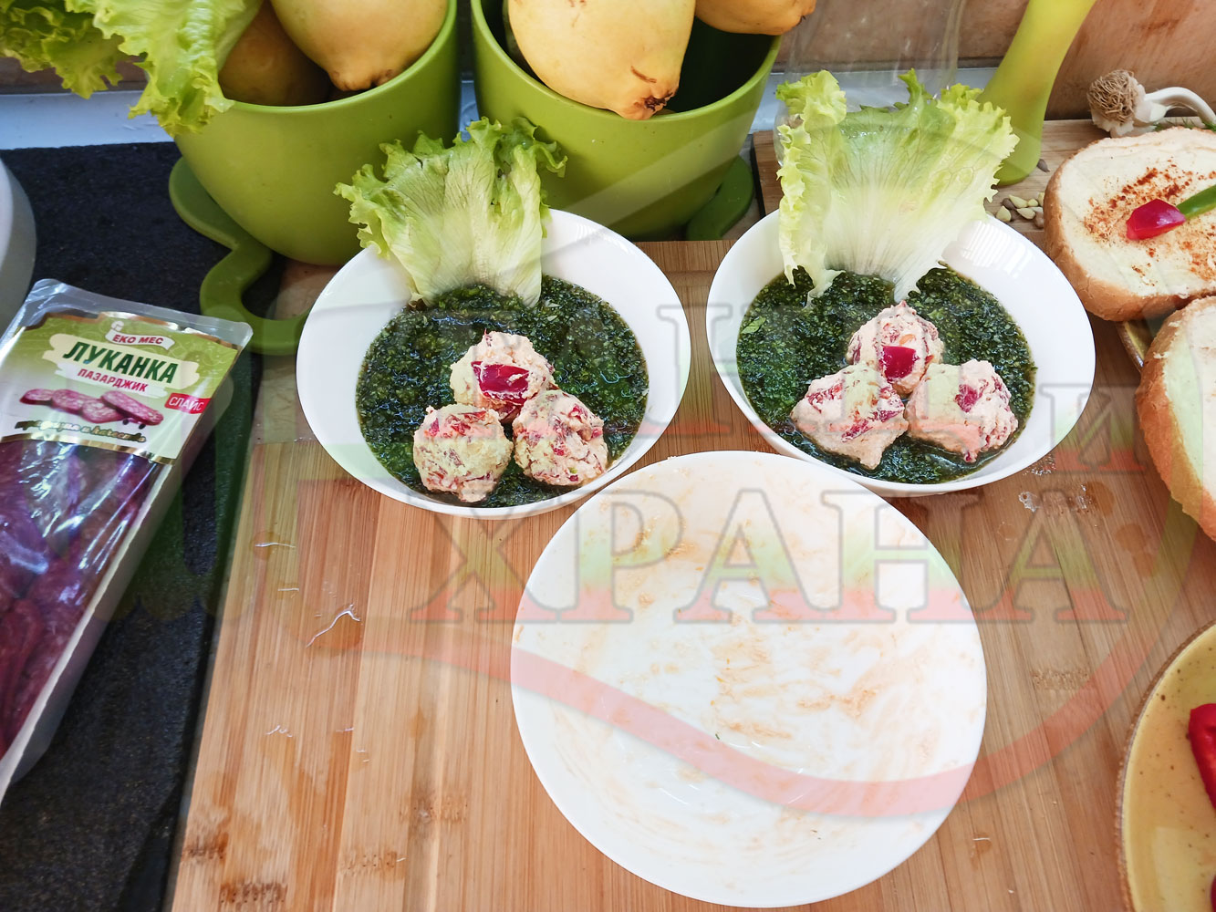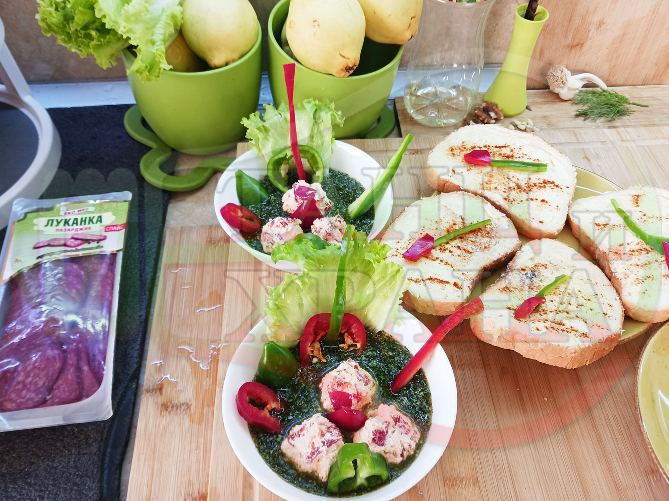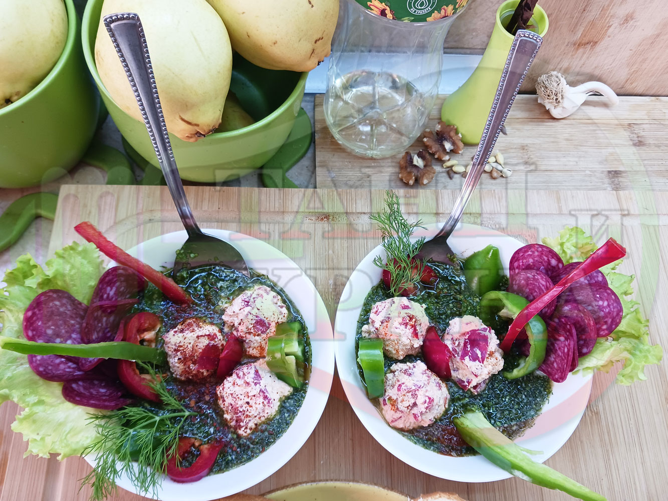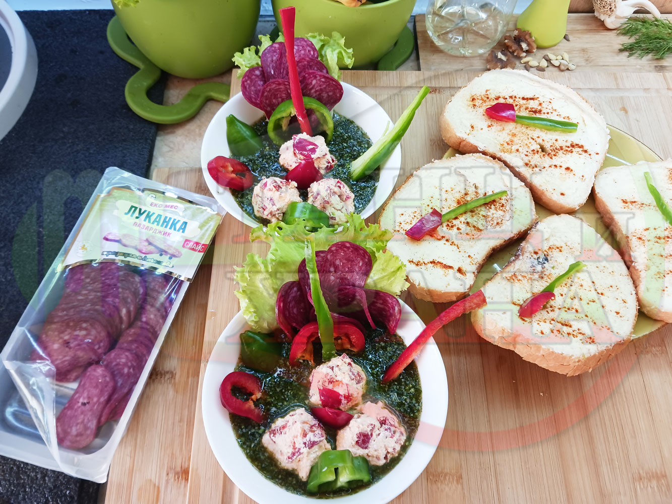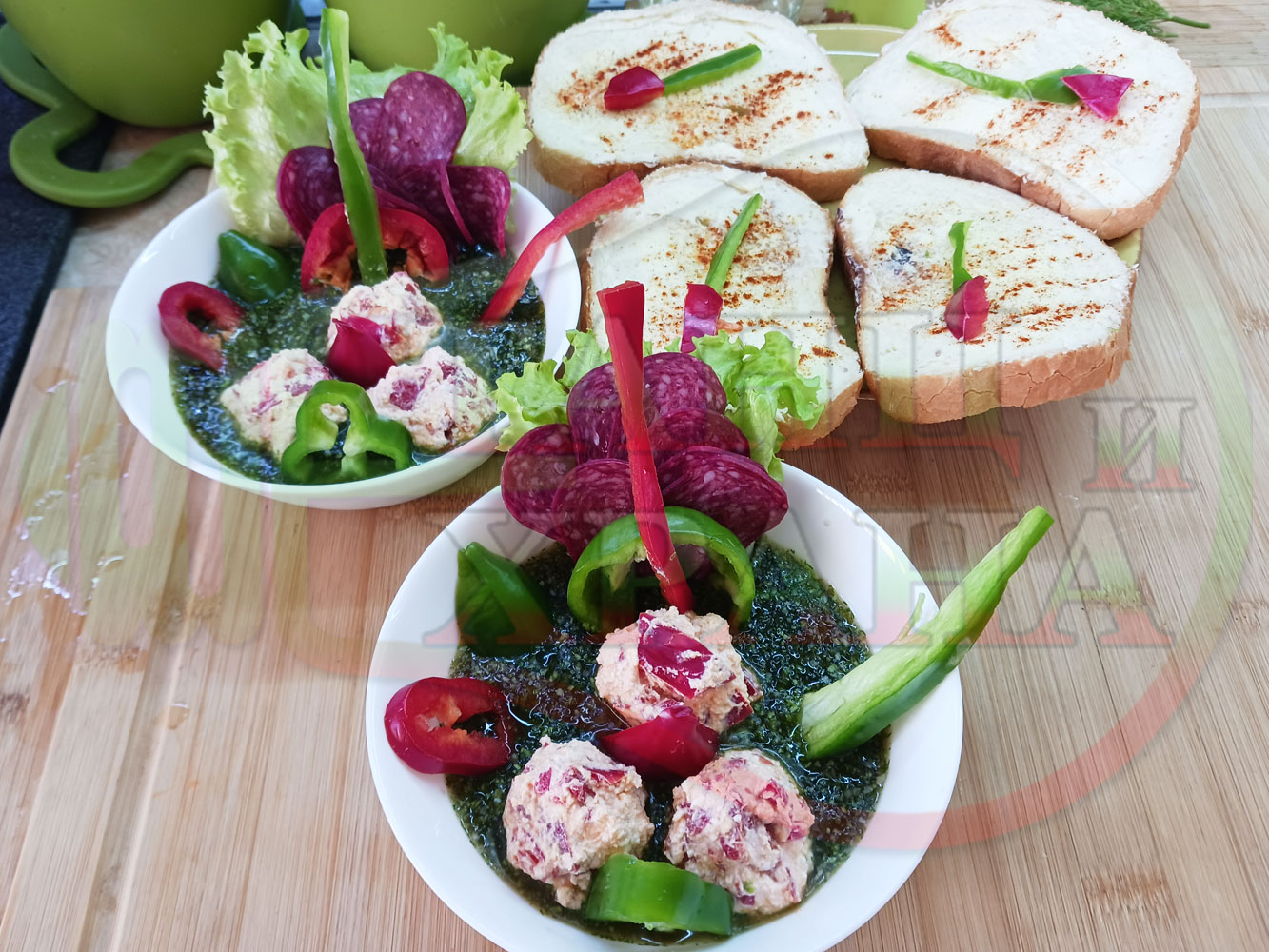 Българска сурова студена супа "Марулена зеленопиперкова чайножасминова с БГсирене" приготвена от маруля, копър, зелени чушки и зелен чай със жасмин гарнирана с луканка и с топчета от сиренов крем с червени чушки и краве бяло сирене - двукомпонентна