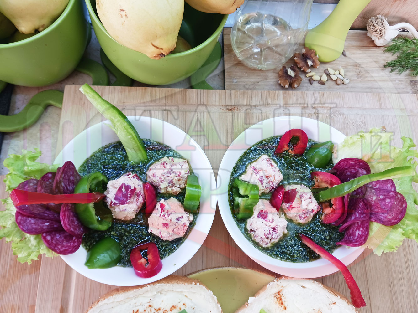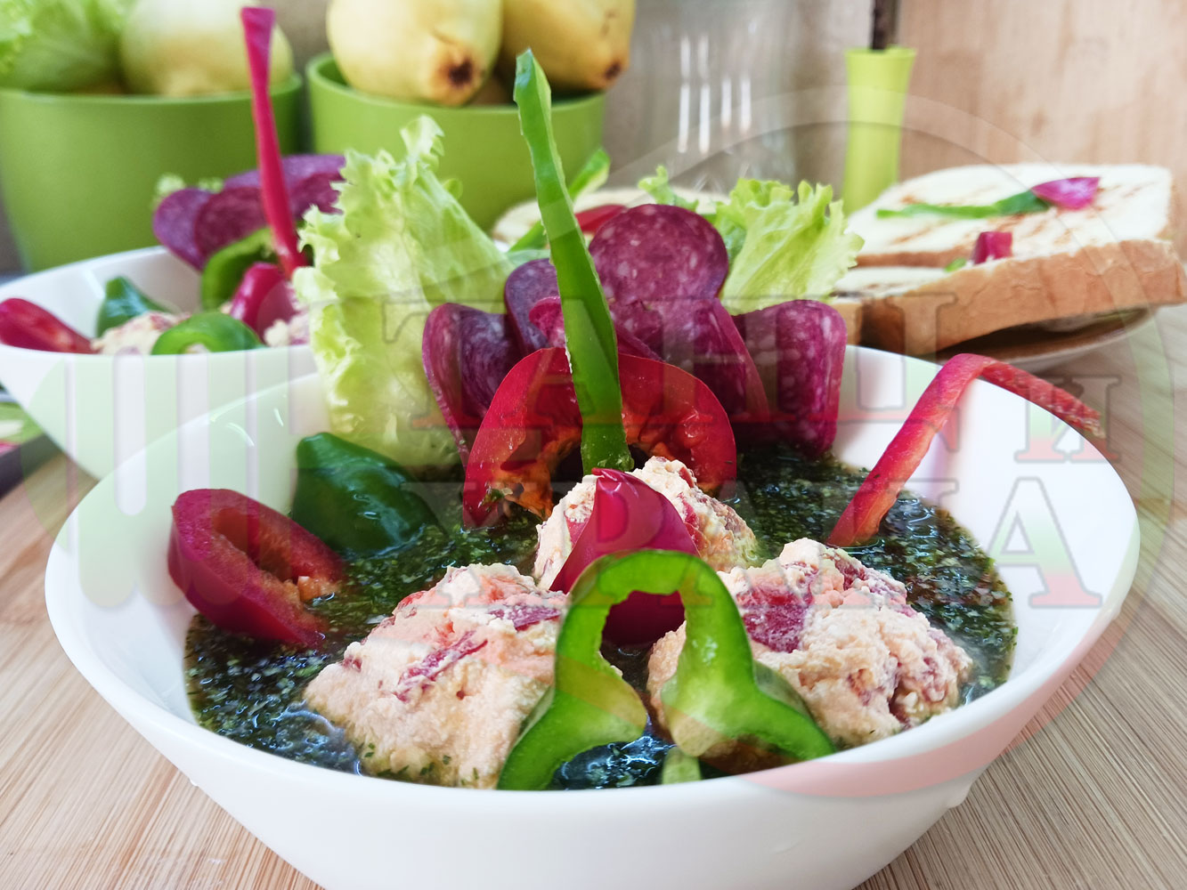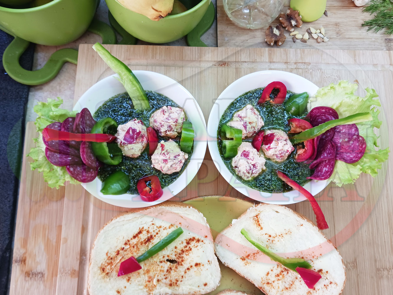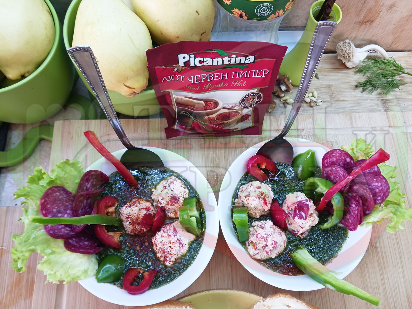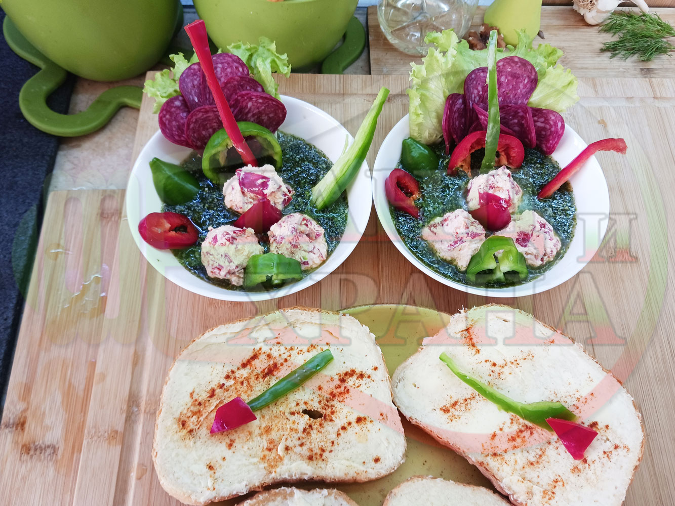 Българска сурова студена супа "Марулена зеленопиперкова чайножасминова с БГсирене" приготвена от маруля, копър, зелени чушки и зелен чай със жасмин гарнирана с луканка и с топчета от сиренов крем с червени чушки и краве бяло сирене - двукомпонентна