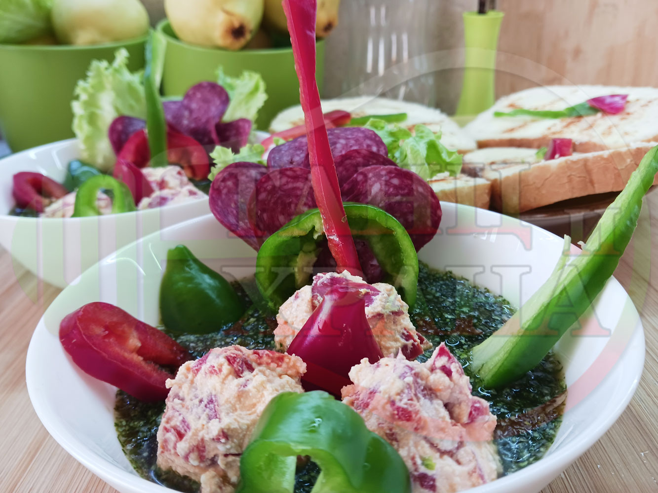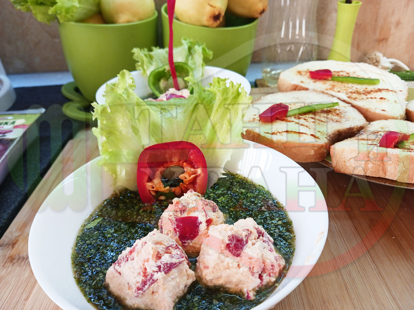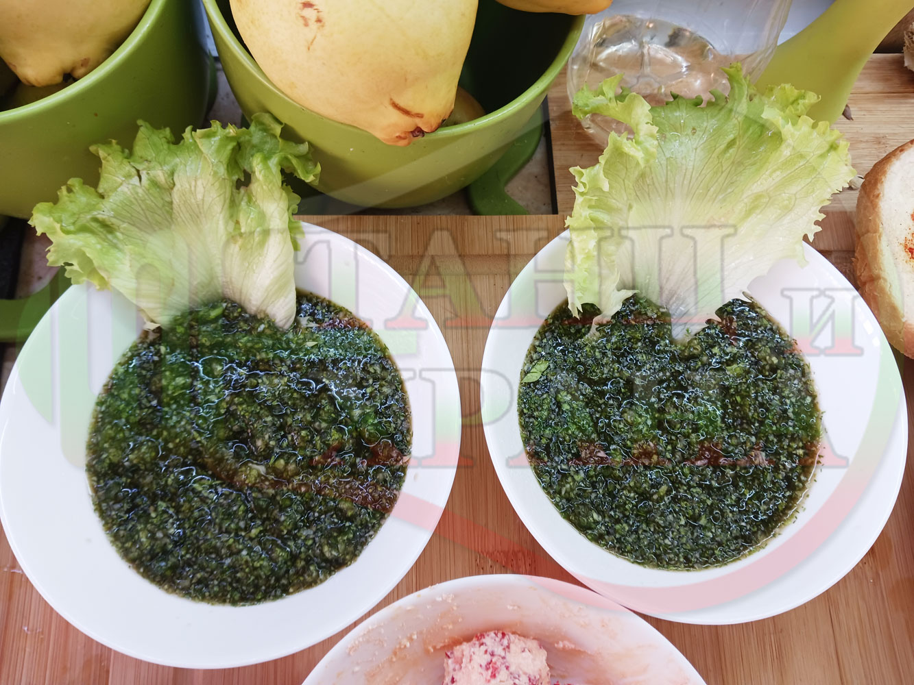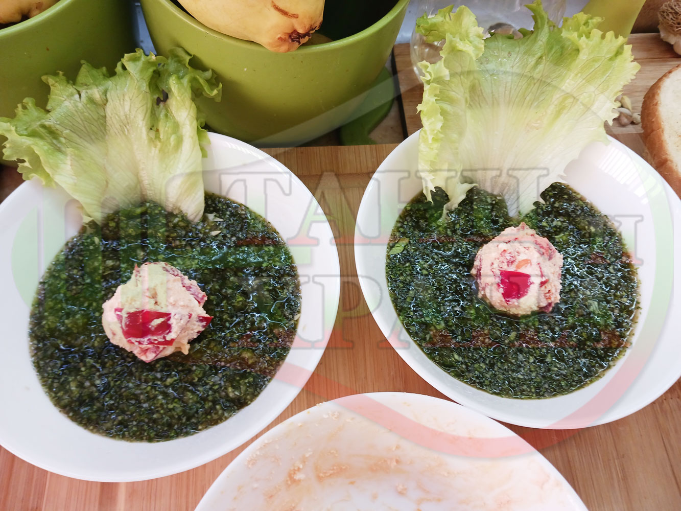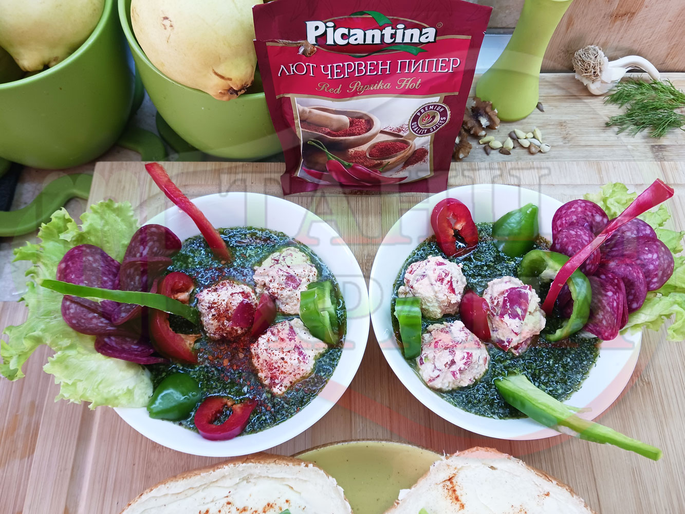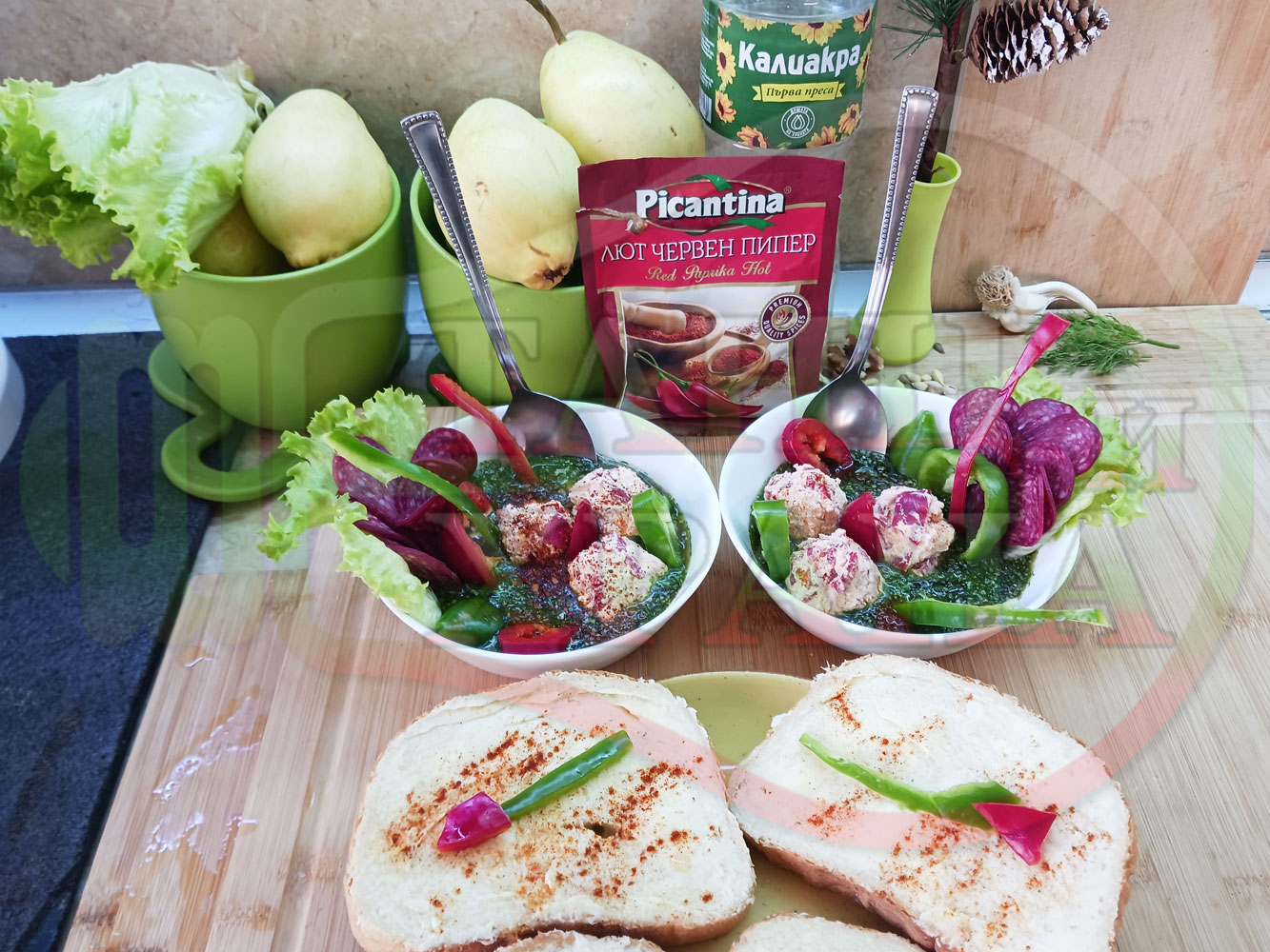 Българска сурова студена супа "Марулена зеленопиперкова чайножасминова с БГсирене" приготвена от маруля, копър, зелени чушки и зелен чай със жасмин гарнирана с луканка и с топчета от сиренов крем с червени чушки и краве бяло сирене - двукомпонентна