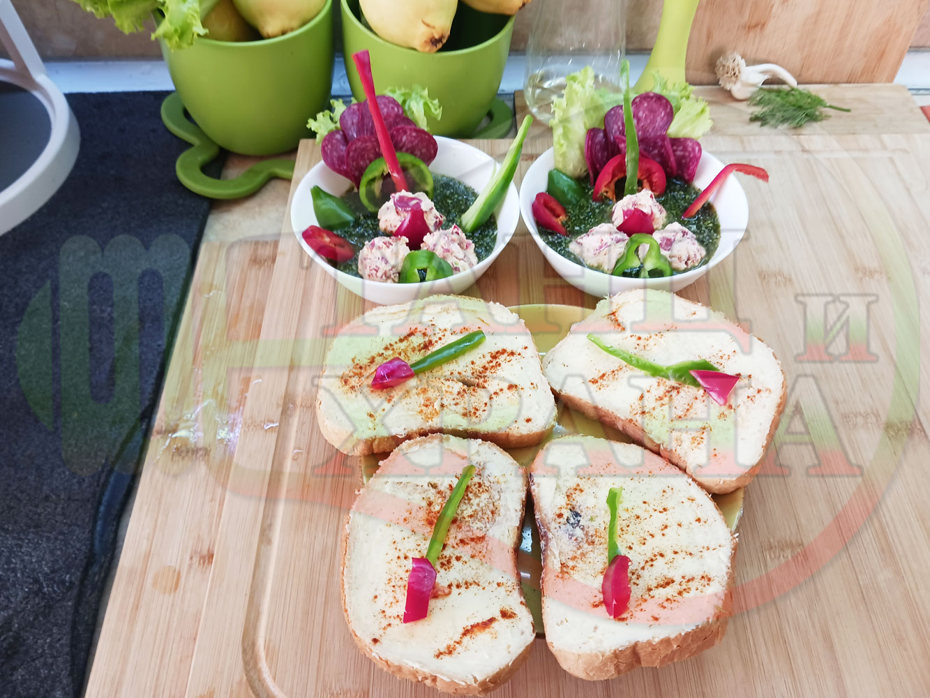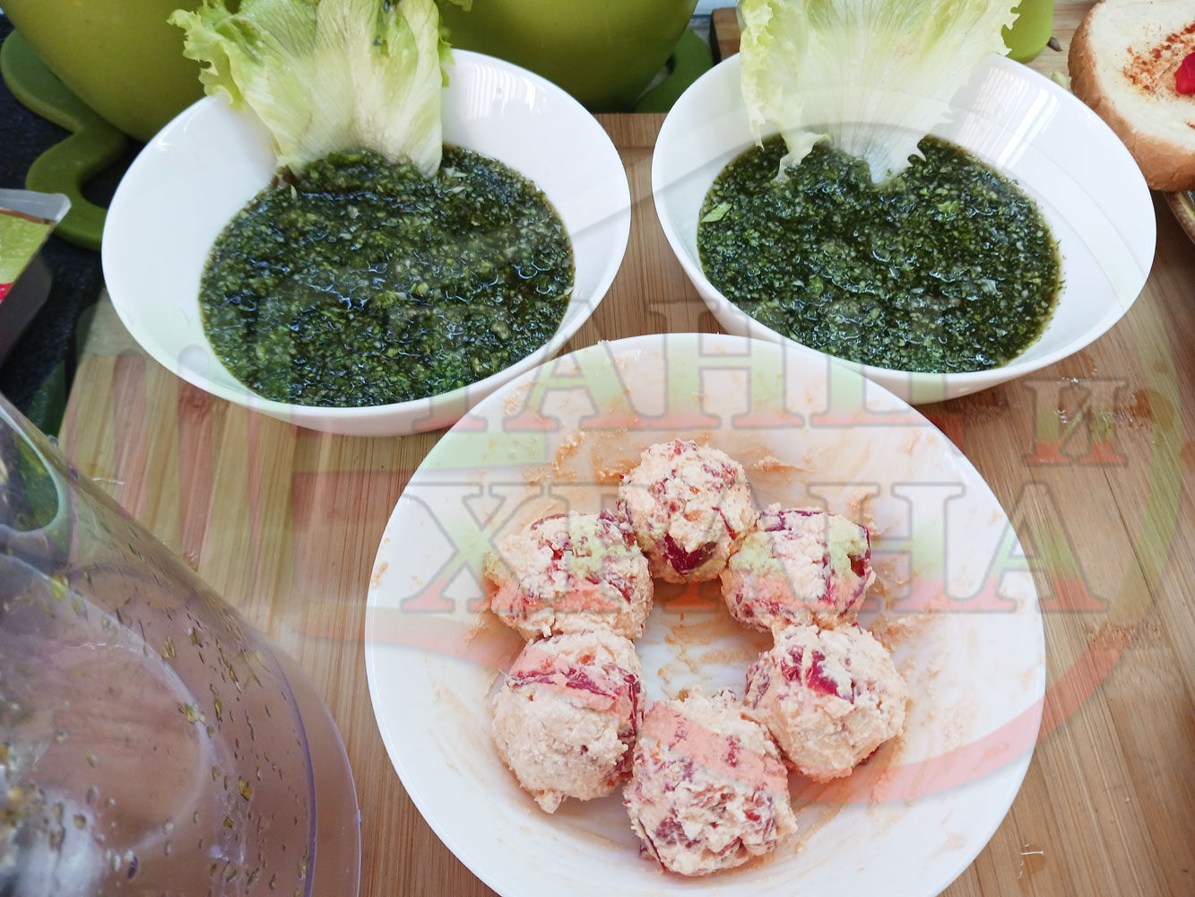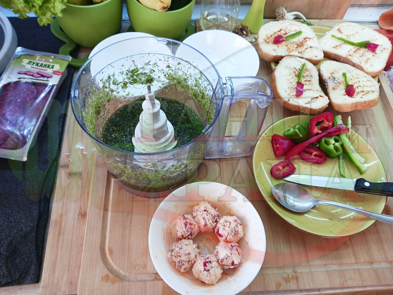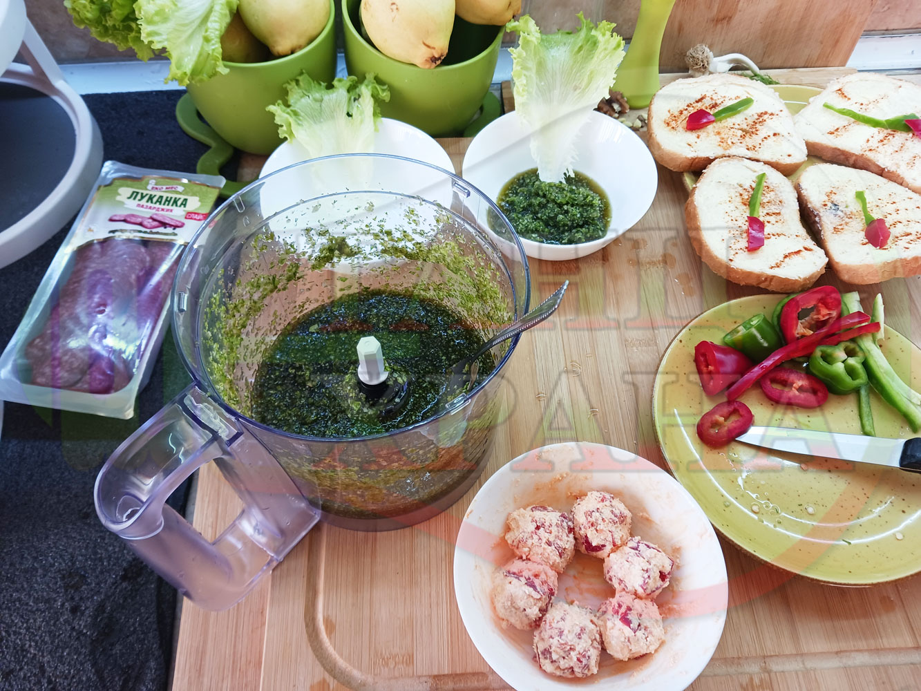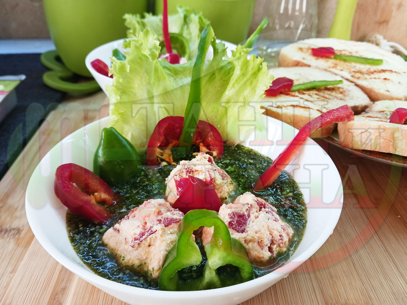 Българска сурова студена супа "Марулена зеленопиперкова чайножасминова с БГсирене" приготвена от маруля, копър, зелени чушки и зелен чай със жасмин гарнирана с луканка и с топчета от сиренов крем с червени чушки и краве бяло сирене - двукомпонентна