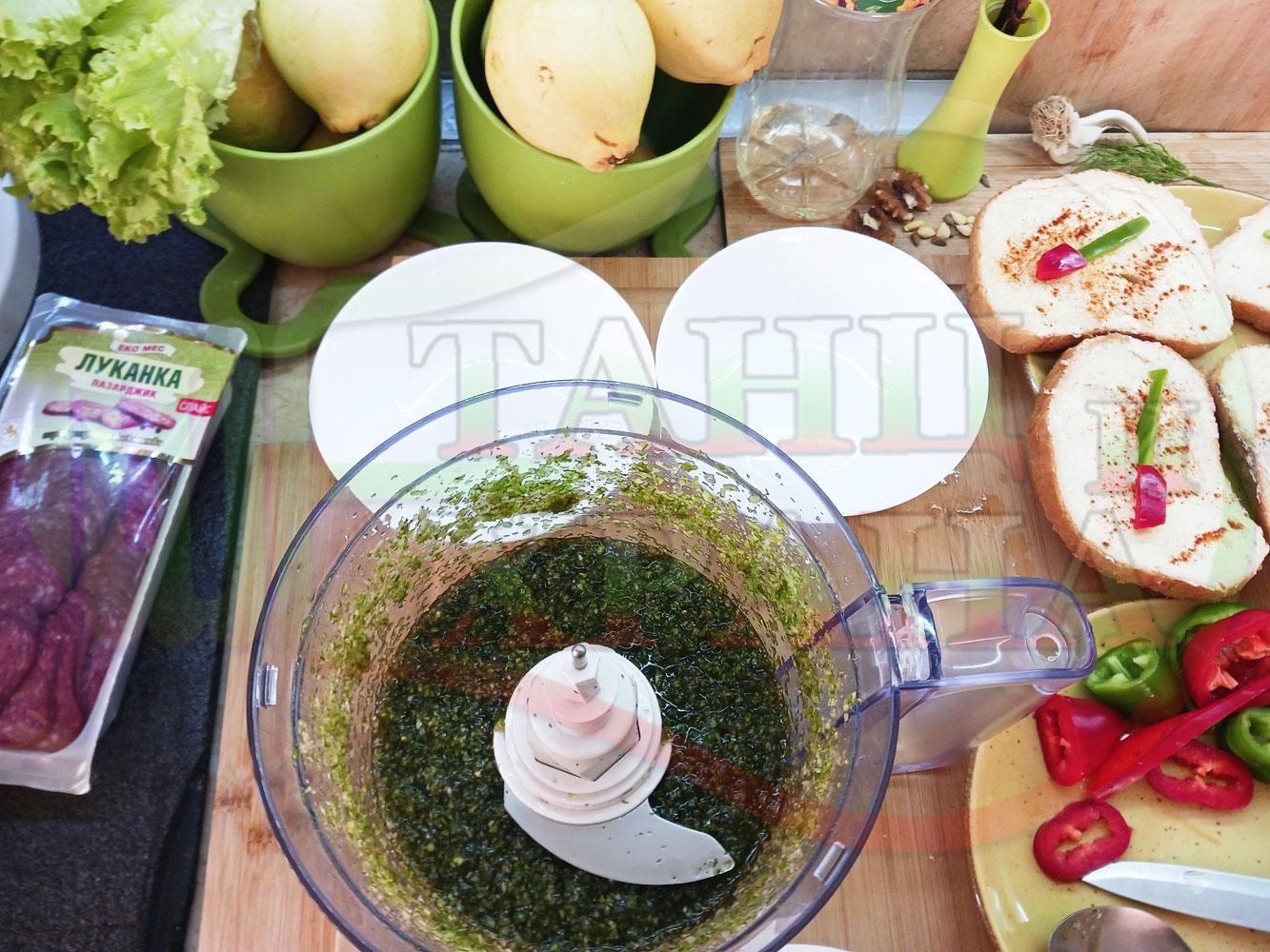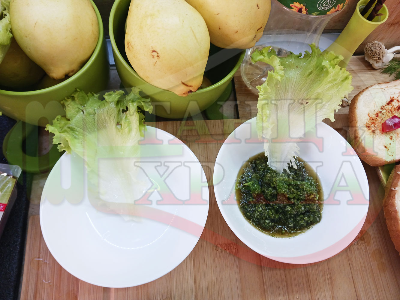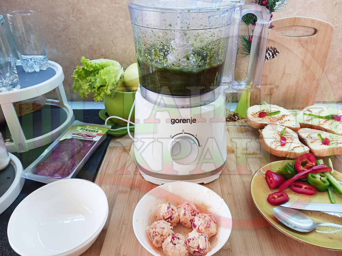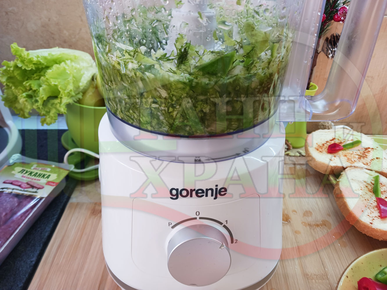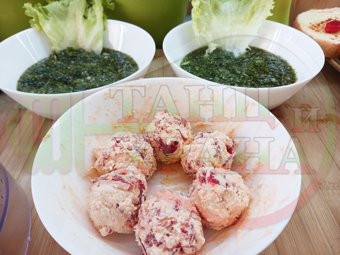 Българска сурова студена супа "Марулена зеленопиперкова чайножасминова с БГсирене" приготвена от маруля, копър, зелени чушки и зелен чай със жасмин гарнирана с луканка и с топчета от сиренов крем с червени чушки и краве бяло сирене - двукомпонентна