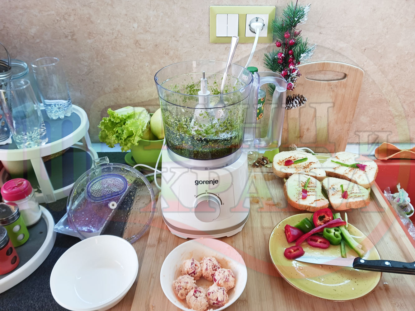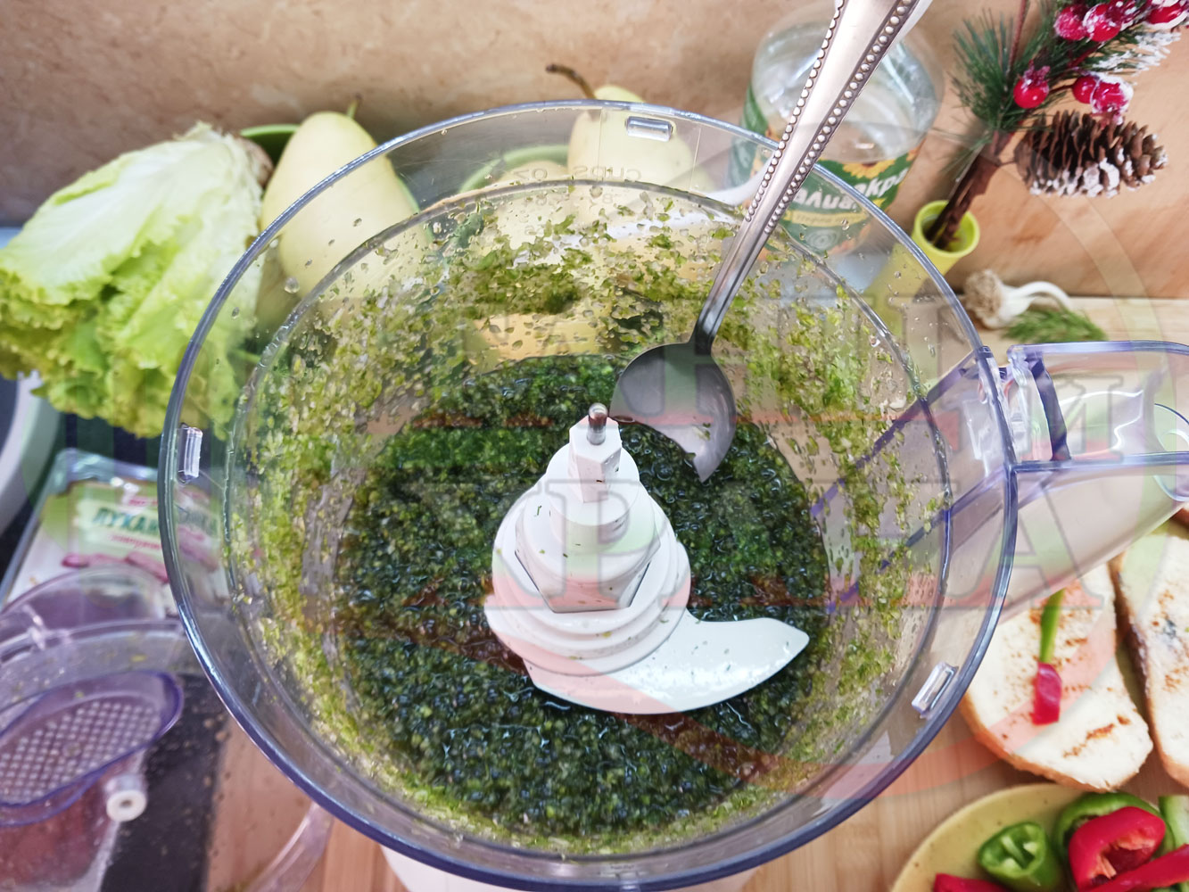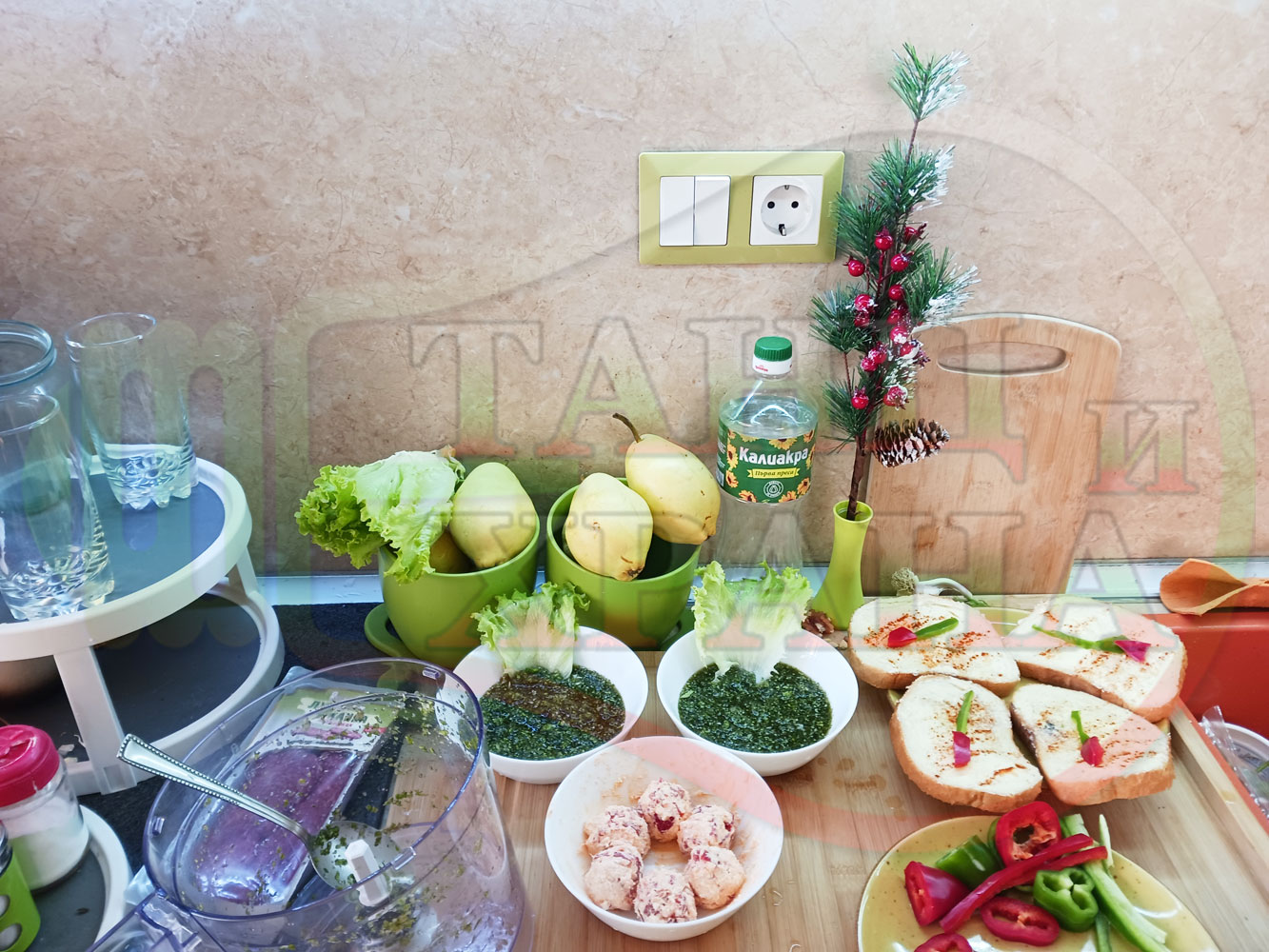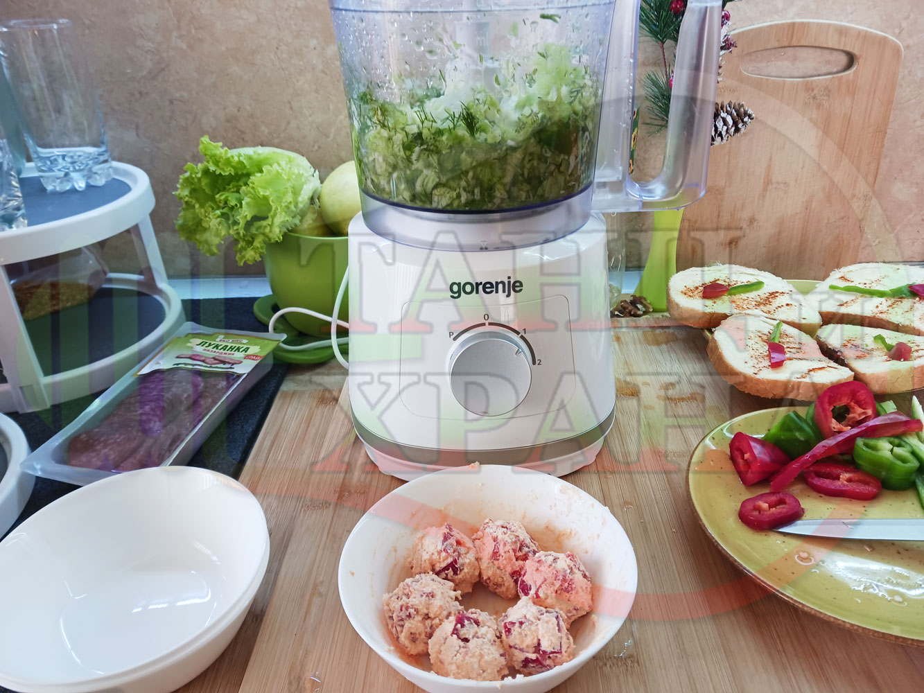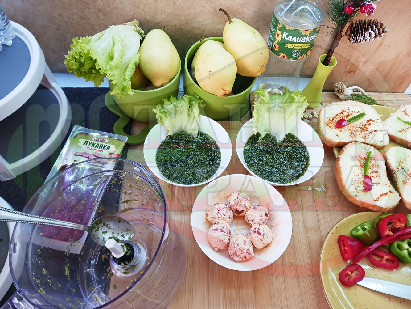 Българска сурова студена супа "Марулена зеленопиперкова чайножасминова с БГсирене" приготвена от маруля, копър, зелени чушки и зелен чай със жасмин гарнирана с луканка и с топчета от сиренов крем с червени чушки и краве бяло сирене - двукомпонентна