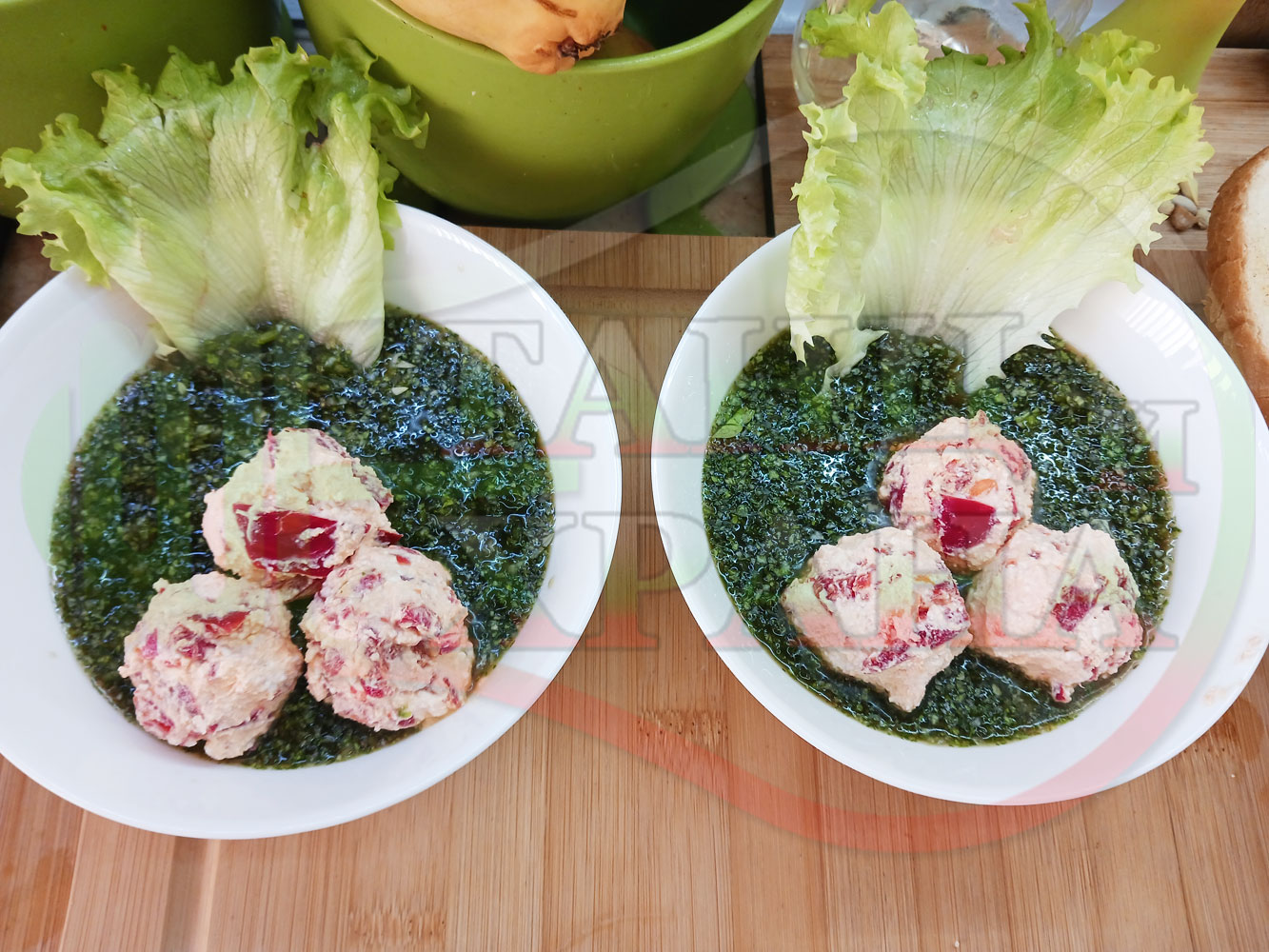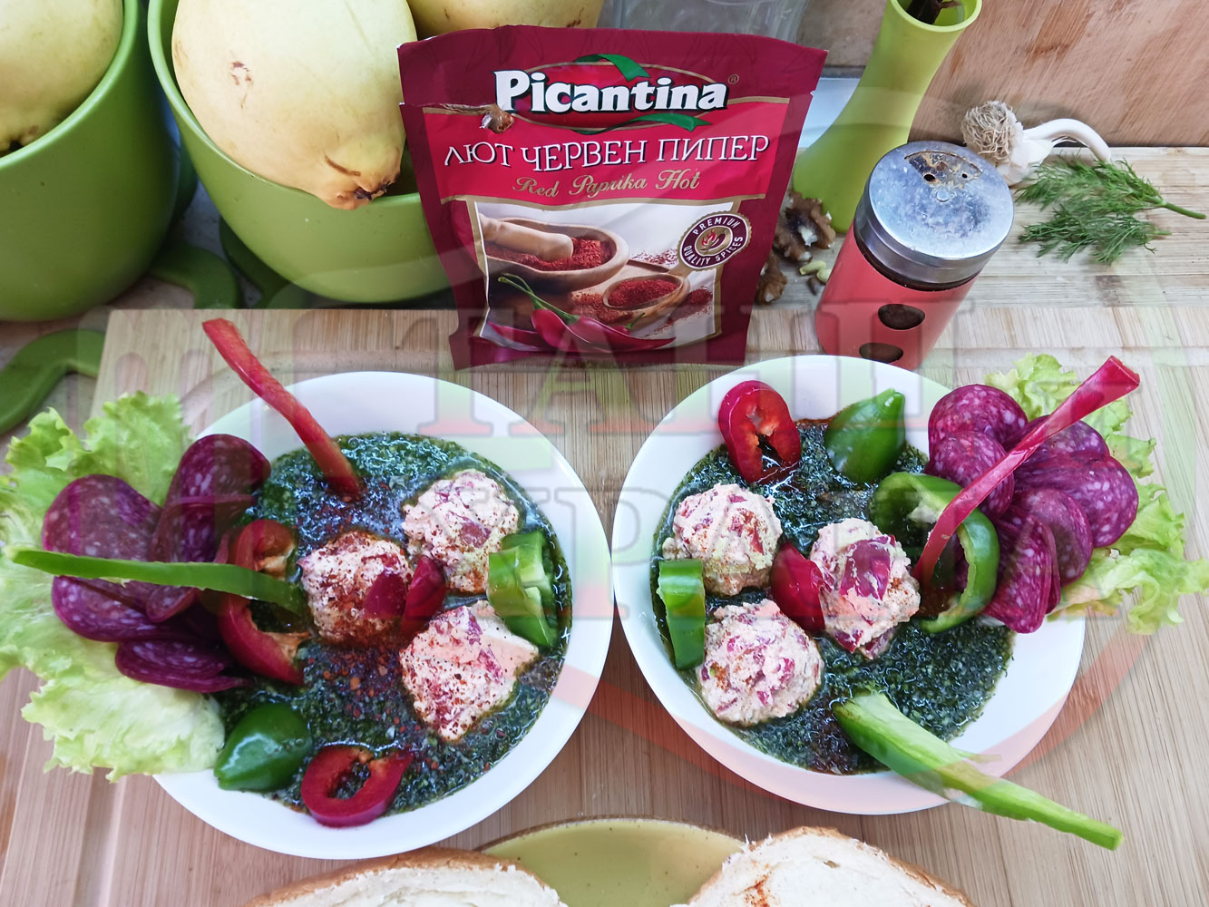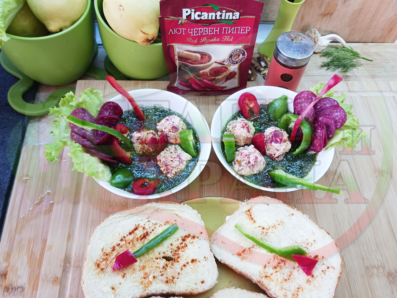 Българската марулена сурова, студена супа, която сътворих със свеж копър, зелени пресни чушки и зелен чай със жасмин се оказа доста вкусна и се спретва буквално за "нула" време с чопър. Гарнирах супата с топчета от сиреново червеночушков крем, приготвен с българско краве бяло, саламурено сирене и червени пресни чушки и се получи най-вкусната сурова супа, която сме хапвали (поредната най-вкусна сурова супа (всичките сурови супи са вкусни по свой си начин според продуктите, които са включени в тях)). Двукомпонентността на супите (в голямата си част са авторски с иновативен метод на представяне и комбиниране на продуктите (прилагам метода на двукомпонентността в почти всички видове ястия, които приготвям)), който позволява да се комбинират различни сурови и/или запечени продукти, с което осъвременявам и обогатявам традиционни български вкусове за приготвянето на супи, ястия, печива и различни гозби. Сиреновите топчета овкусяват супата с неповторимия саламурен вкус, който носят в идеална хармония с марулената супа и зеленчуците и отново се получи голяма вкусно, вкусна, вкусотия (вкуснотия), която е изключително полезна, обединяваща танините, минералите и микроелементите от зеления чай с богатството от полезни съставки на свежата маруля, копъра, зелените и червени пресни чушки допълнена с млечните протеини от българското краве бяло сирене.