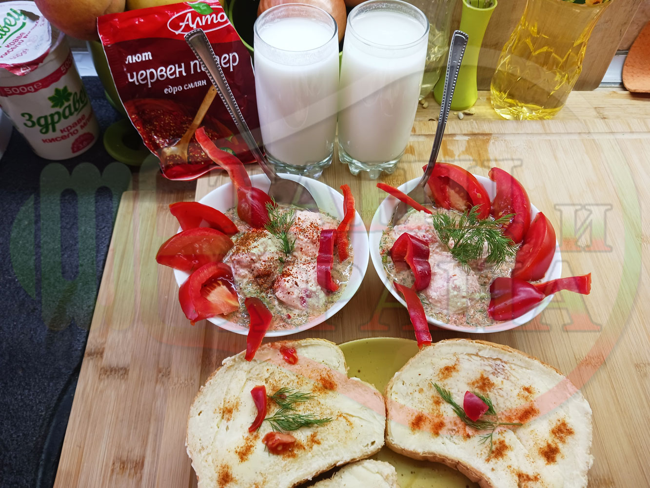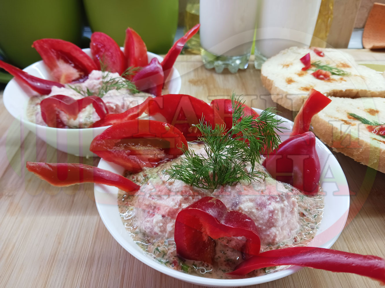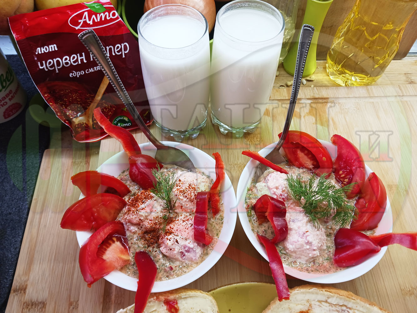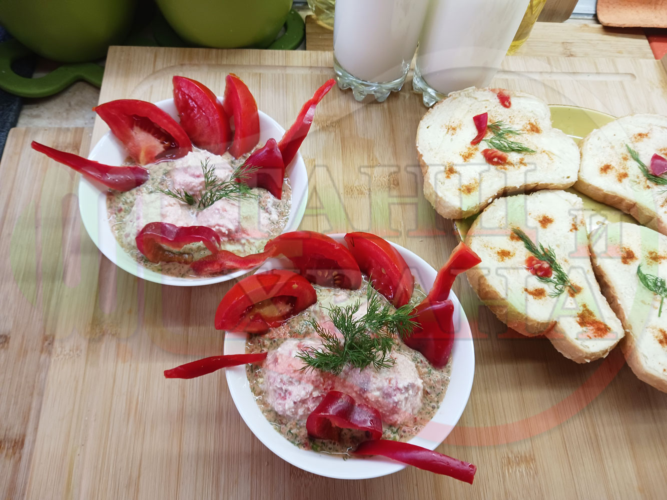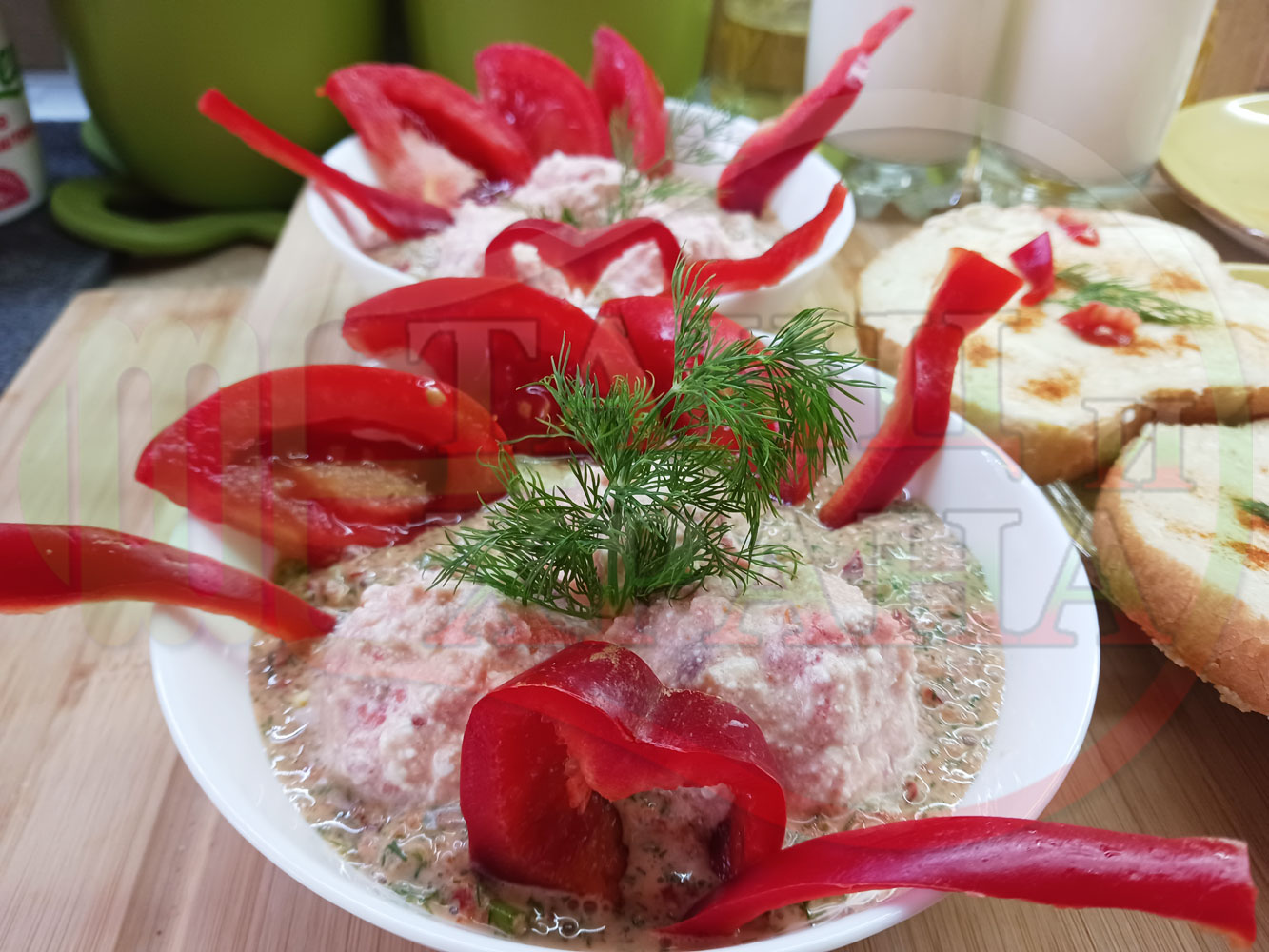 Българската червеночушкова сурова, млечна супа, която сътворих се оказа доста вкусна и се спретва буквално за "нула" време с чопър. Гарнирах супата с топчета от сиреново доматен крем приготвени с българско краве бяло саламурено сирене, стар чесън и пресни домати и се получи най-вкусната сурова супа, която сме хапвали (поредната най-вкусна сурова супа (всичките сурови супи са вкусни по свой си начин според продуктите, които са включени в тях)). Двукомпонентността на супите (в голямата си част са авторски с иновативен метод на представяне и комбиниране на продуктите (прилагам метода на двукомпонентността в почти всички видове ястия, които приготвям)), позволява да се комбинират различни сурови и/или запечени продукти, с което осъвременявам и обогатявам традиционни български вкусове за приготвянето на супи, ястия, печива и различни гозби. Сиреновите топчета овкусяват супата с неповторимия вкус, който носят в идеална хармония с червеночушковокопъровата супа с кисело мляко от България и за пореден път се получи голяма вкусно, вкусна, вкусотия (вкуснотия), която е изключително полезна, обединяваща млечните протеини, минерали и микроелементи с богатството от полезни съставки на чушките, чесъна и свежия копър. ![]()