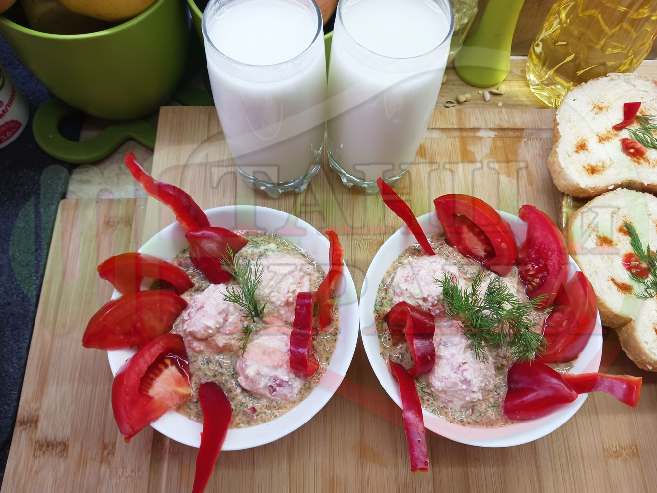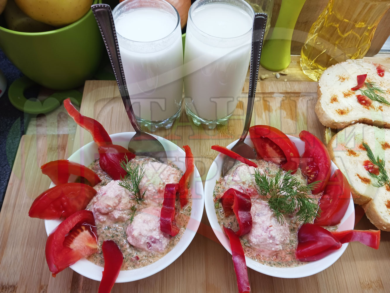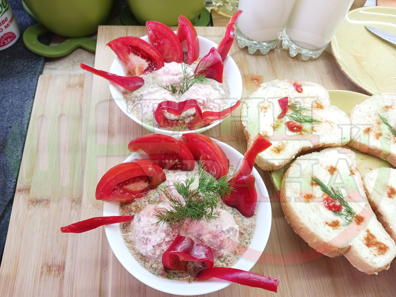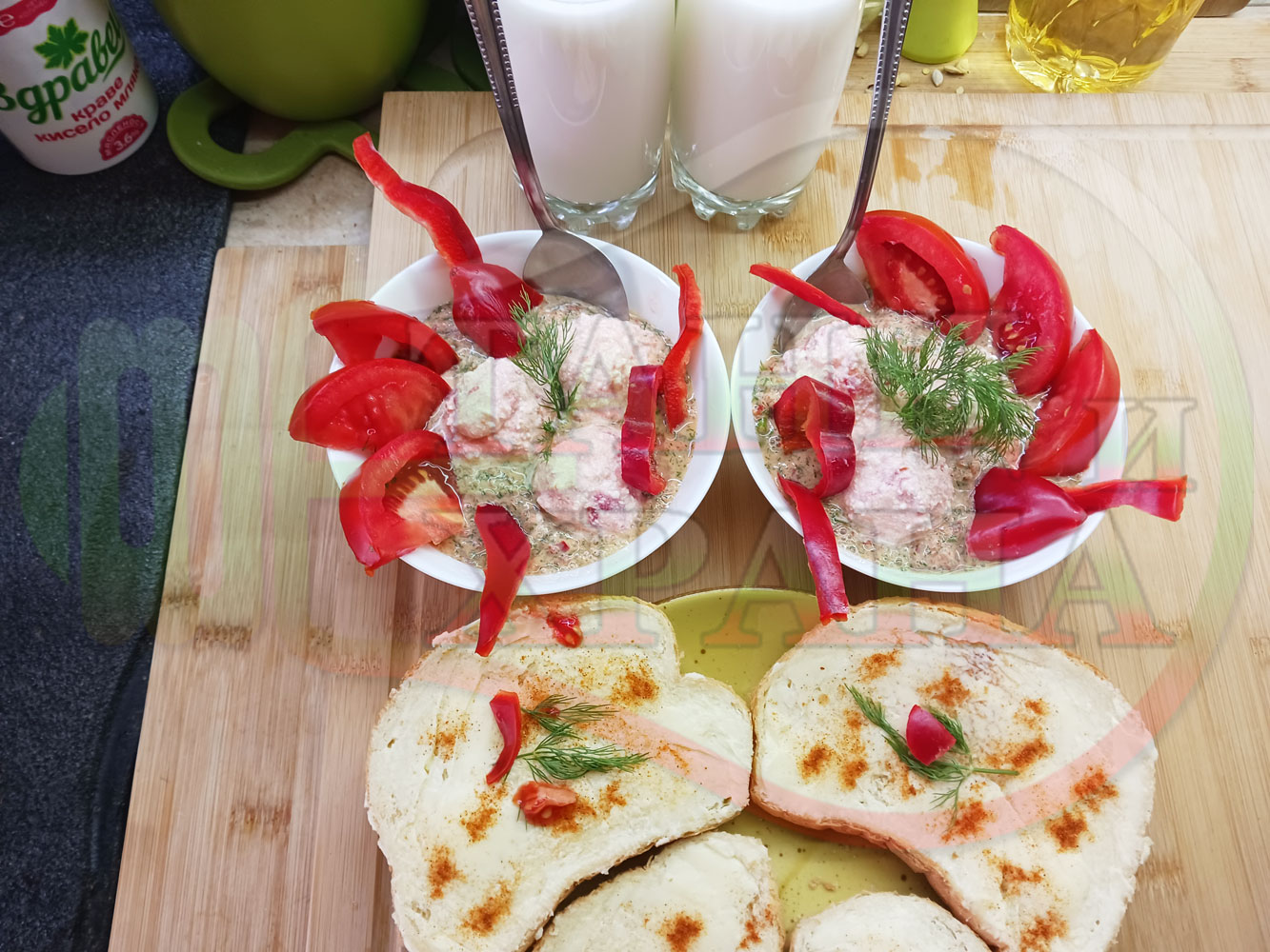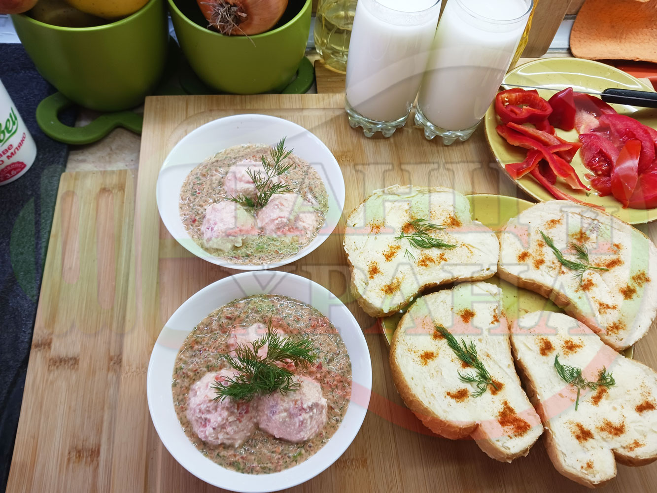 Българската червеночушкова сурова, млечна супа, която сътворих се оказа доста вкусна и се спретва буквално за "нула" време с чопър. Гарнирах супата с топчета от сиреново доматен крем приготвени с българско краве бяло саламурено сирене, стар чесън и пресни домати и се получи най-вкусната сурова супа, която сме хапвали (поредната най-вкусна сурова супа (всичките сурови супи са вкусни по свой си начин според продуктите, които са включени в тях)). Двукомпонентността на супите (в голямата си част са авторски с иновативен метод на представяне и комбиниране на продуктите (прилагам метода на двукомпонентността в почти всички видове ястия, които приготвям)), позволява да се комбинират различни сурови и/или запечени продукти, с което осъвременявам и обогатявам традиционни български вкусове за приготвянето на супи, ястия, печива и различни гозби. Сиреновите топчета овкусяват супата с неповторимия вкус, който носят в идеална хармония с червеночушковокопъровата супа с кисело мляко от България и за пореден път се получи голяма вкусно, вкусна, вкусотия (вкуснотия), която е изключително полезна, обединяваща млечните протеини, минерали и микроелементи с богатството от полезни съставки на чушките, чесъна и свежия копър. ![]()