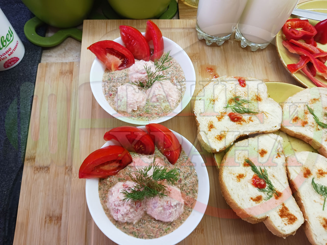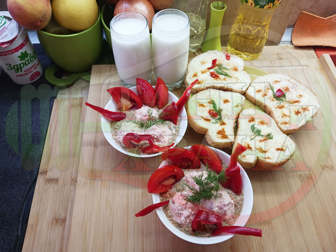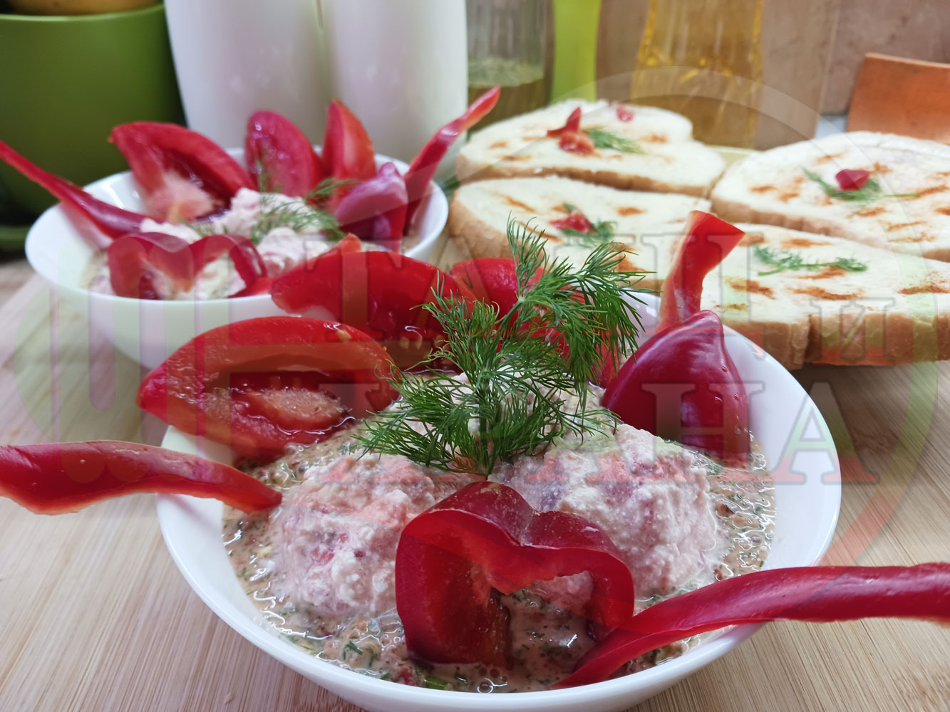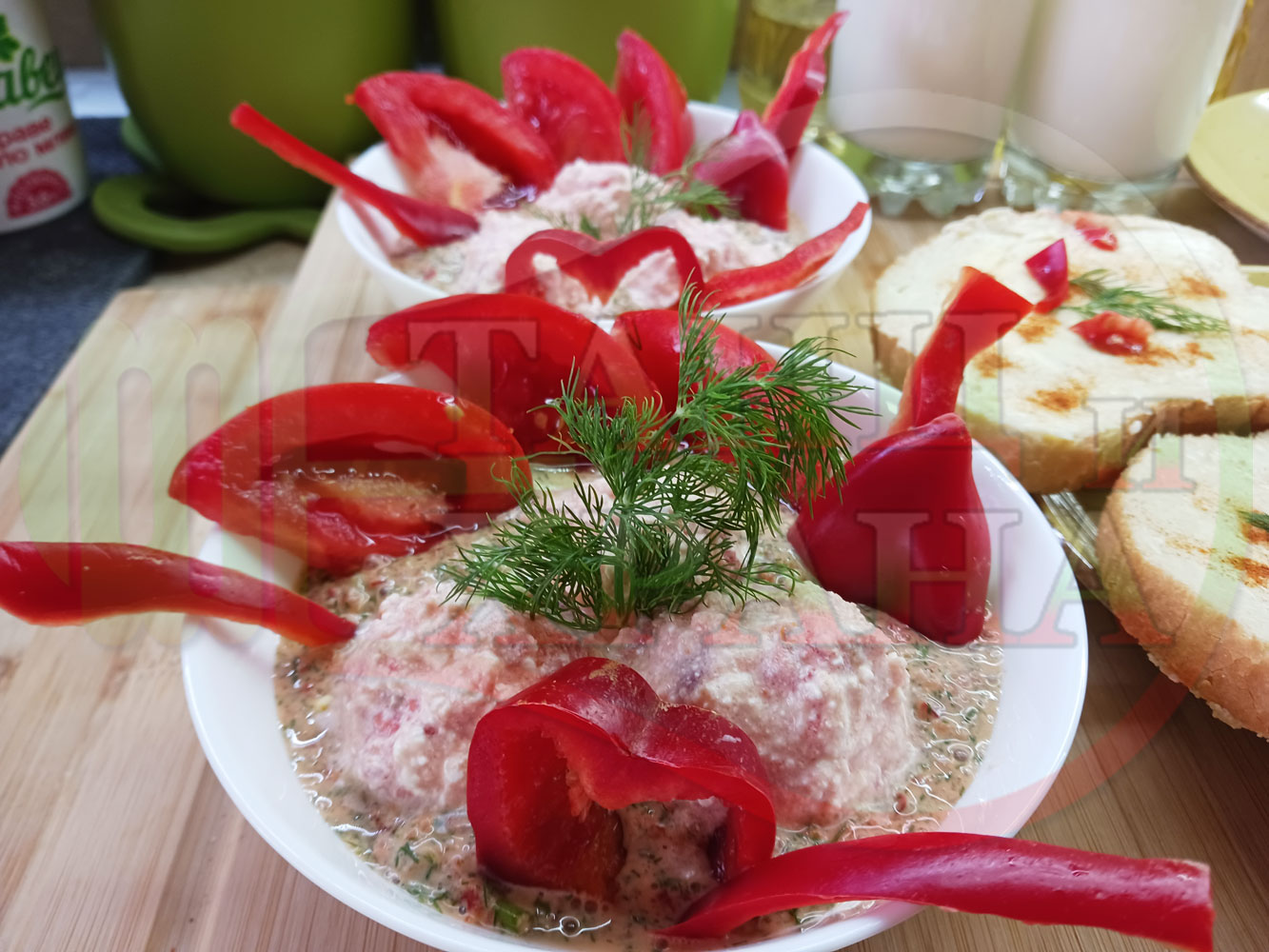 Българска сурова супа "Червеночушковокопърова киселомлечна с БГсирене" приготвена от червени пресни чушки, копър и кисело мляко от България гарнирана с топчета от сиреново доматен крем с домати, чесън и краве бяло сирене - двукомпонентна