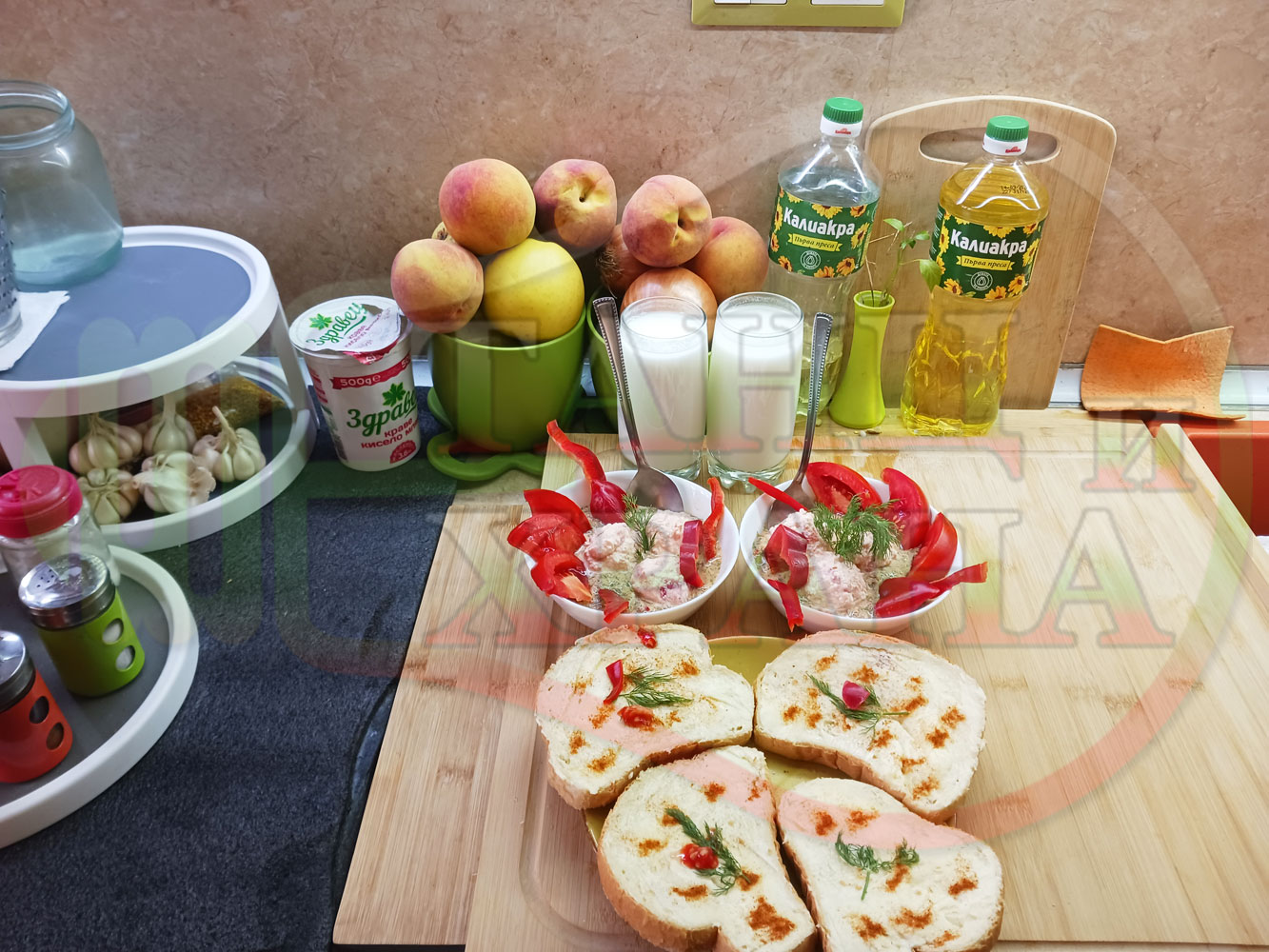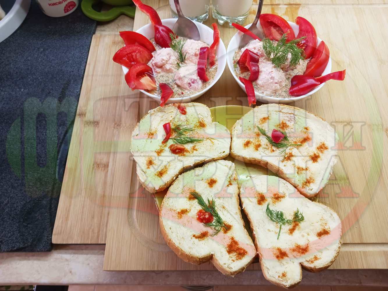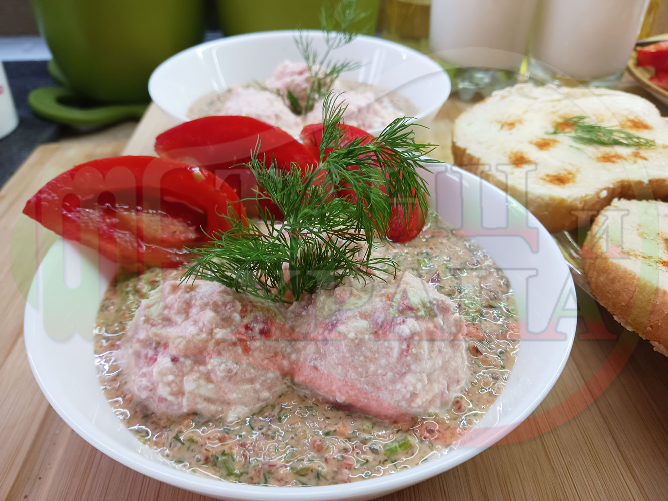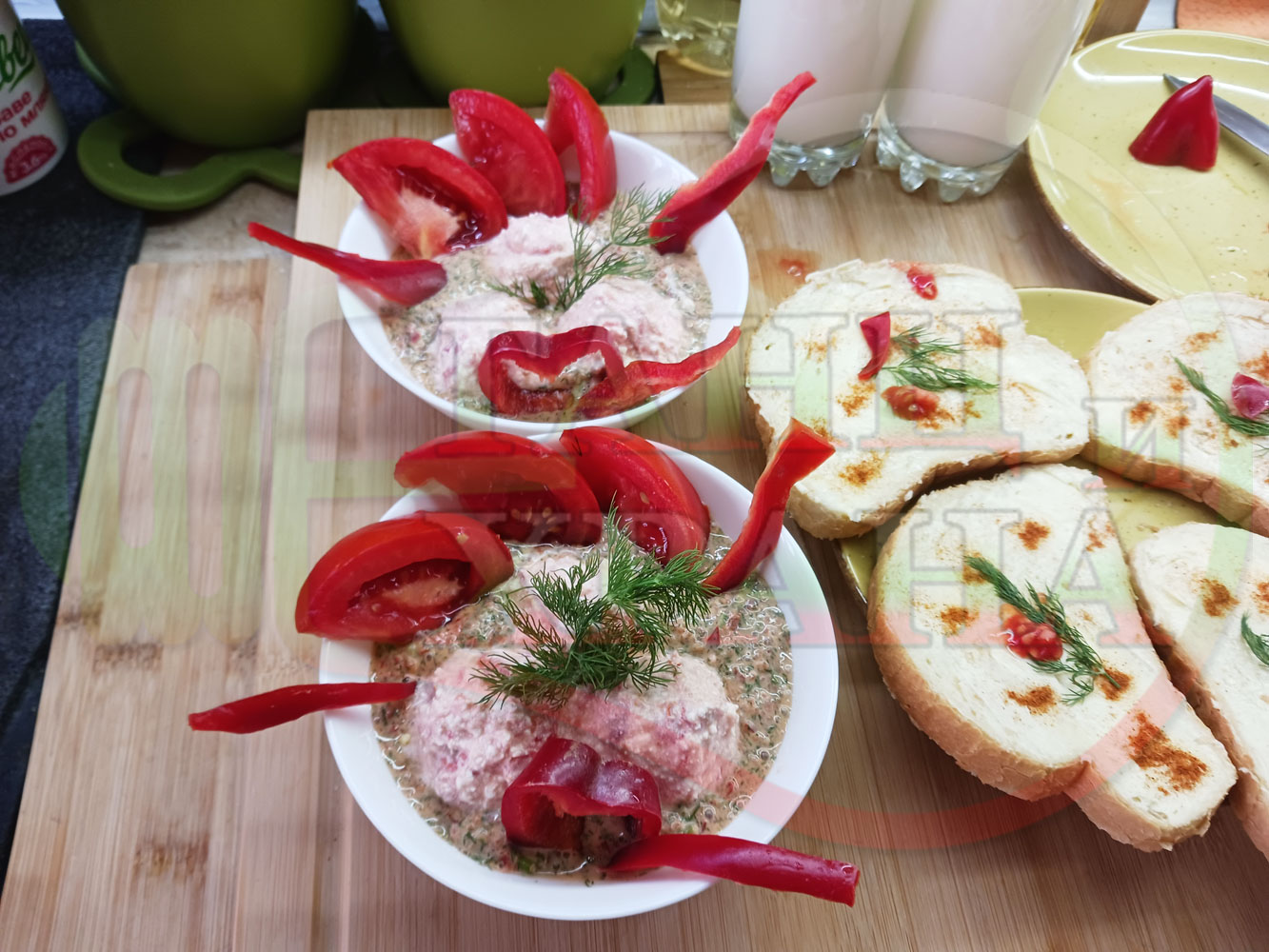 Българска сурова супа "Червеночушковокопърова киселомлечна с БГсирене" приготвена от червени пресни чушки, копър и кисело мляко от България гарнирана с топчета от сиреново доматен крем с домати, чесън и краве бяло сирене - двукомпонентна