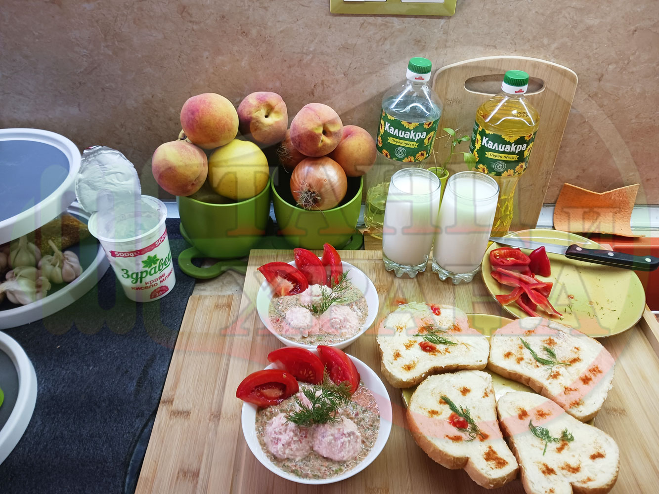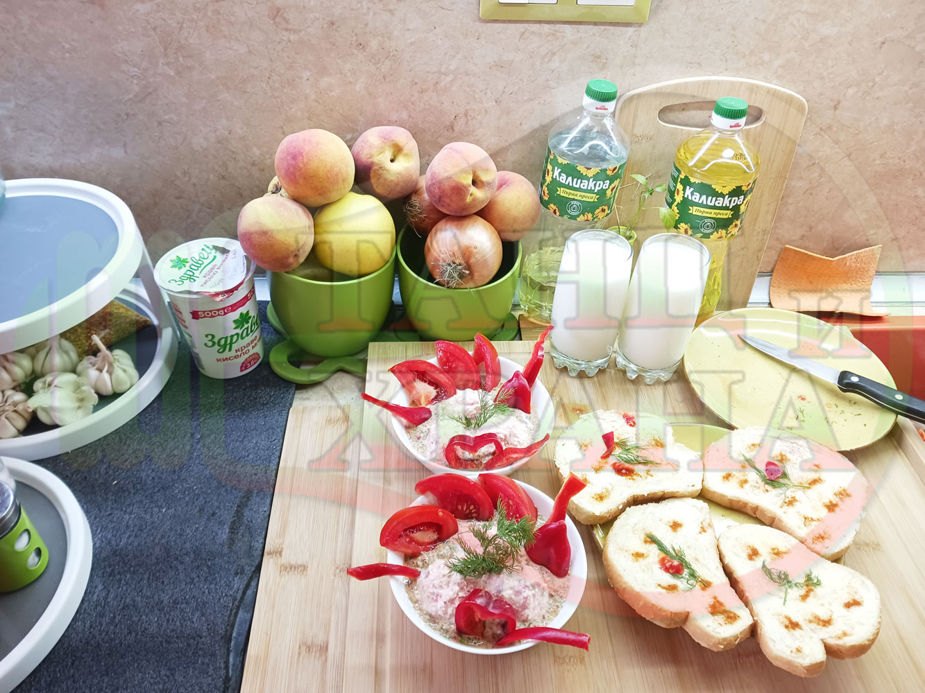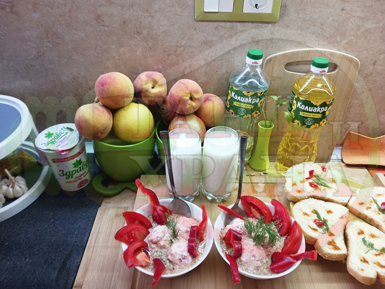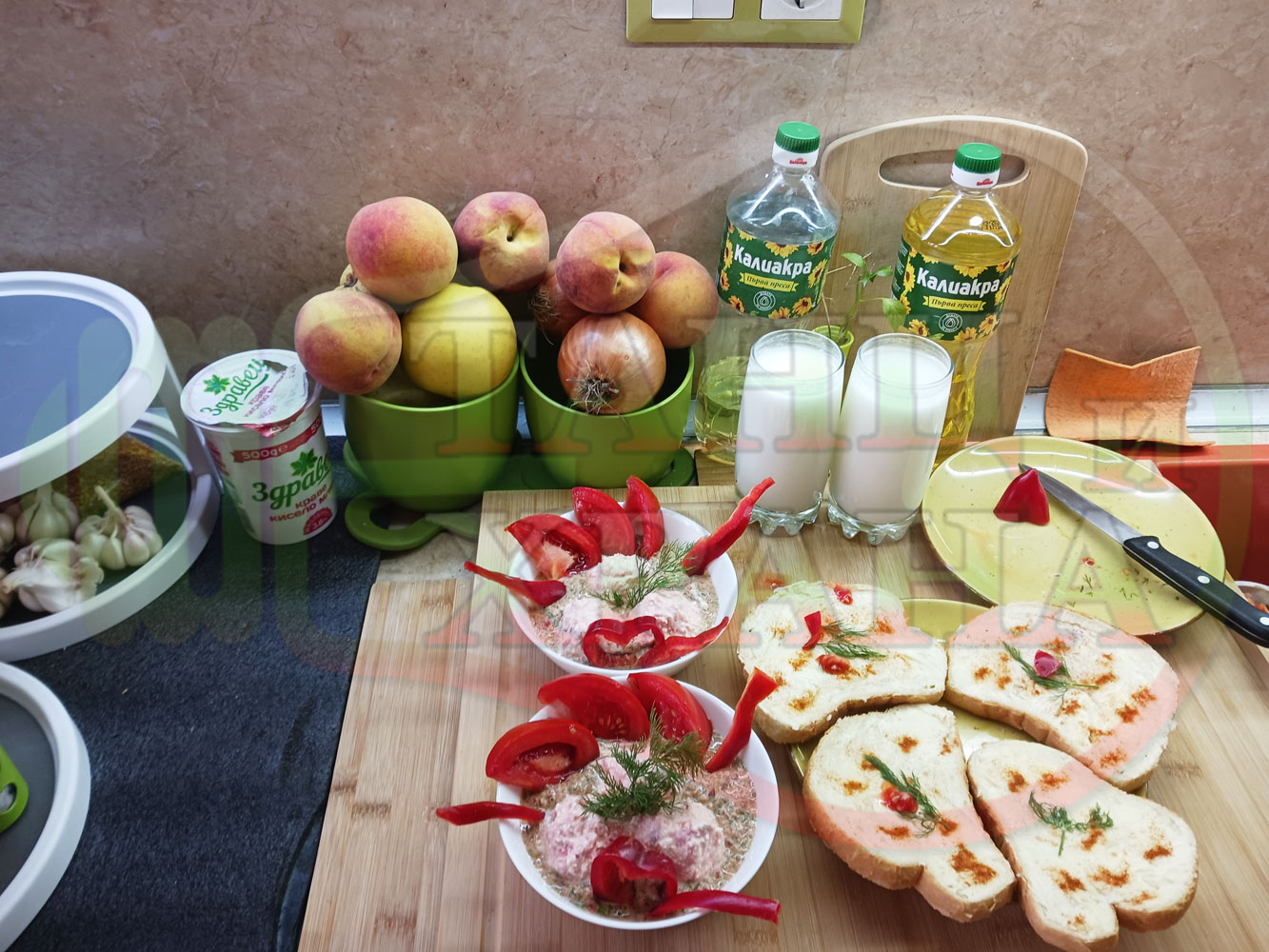 ПРОДУКТИ: Приблизителни количества за българска сурова супа "Червеночушковокопърова киселомлечна с БГсирене" приготвена от червени пресни чушки, копър и кисело мляко от България гарнирана с топчета от сиреново доматен крем с домати, чесън и краве бяло сирене - двукомпонентна