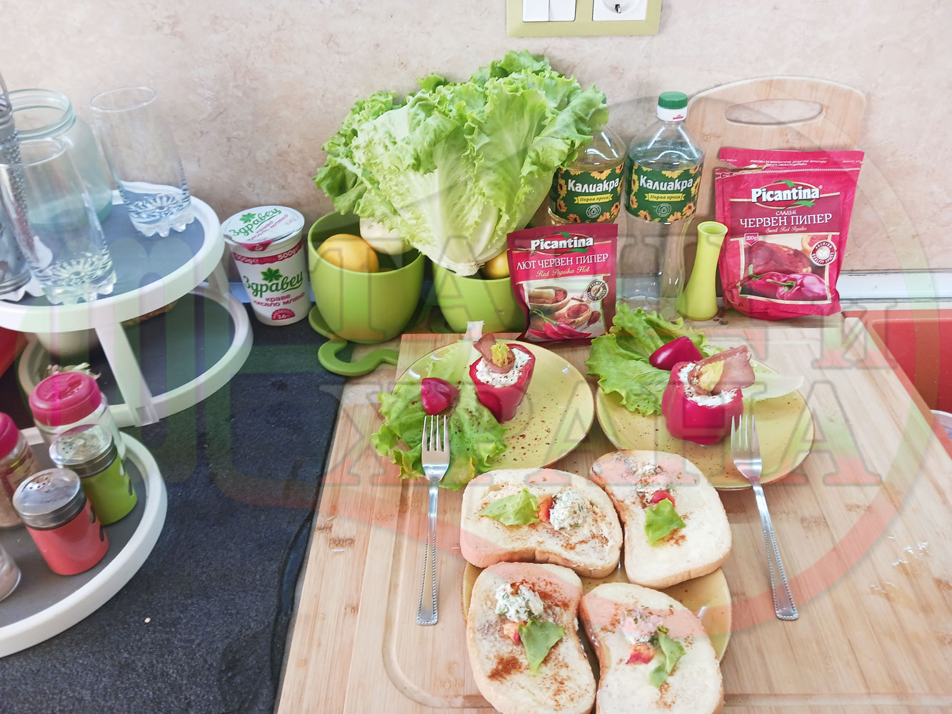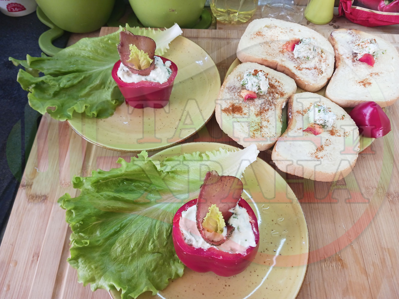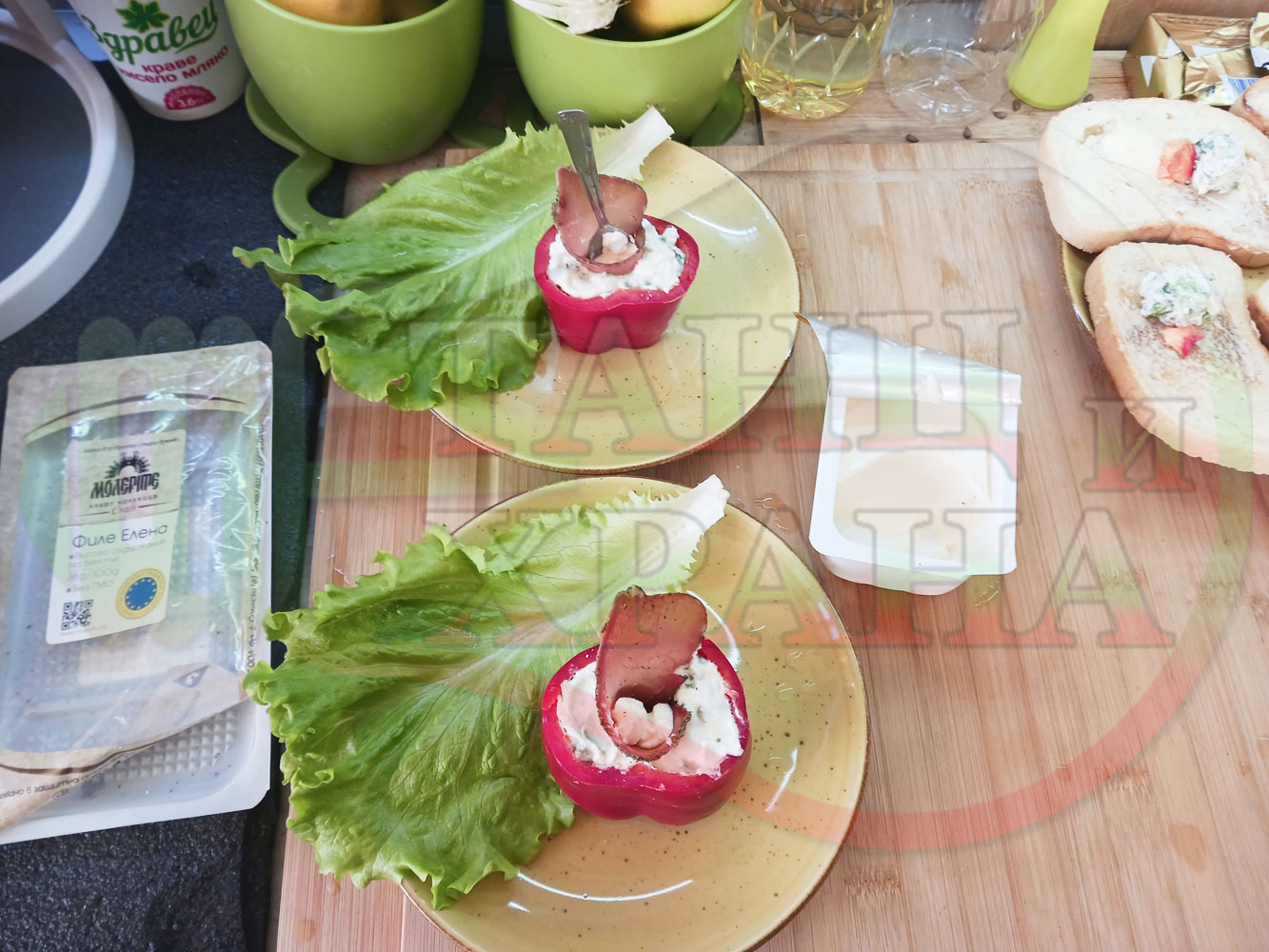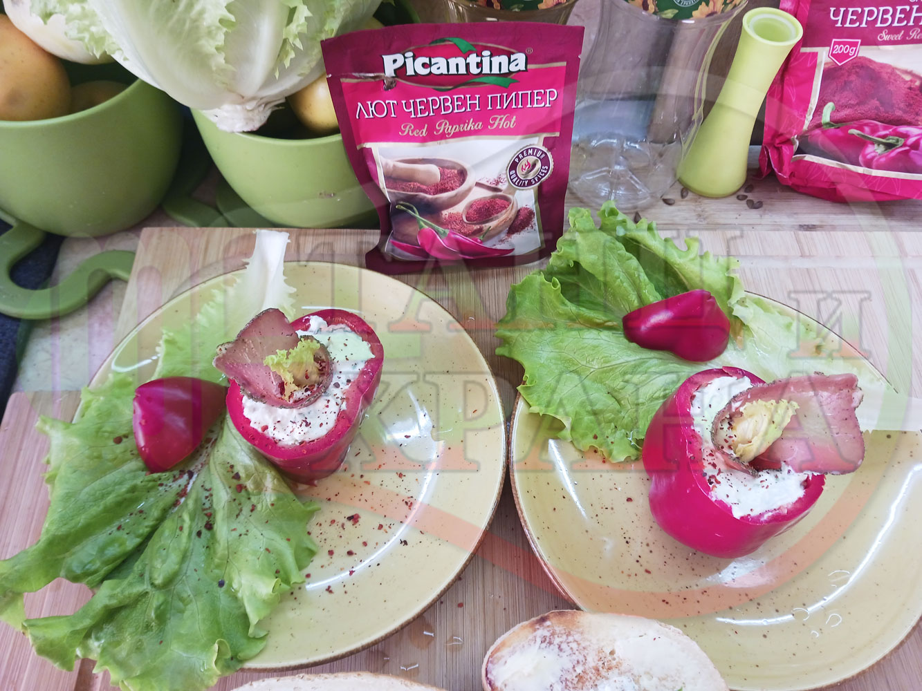 Зеленчукова салата със сурови пълнени чушки"Маруленочервеночушкова майонезена с БГсирене" приготвена от червени пресни пиперки напълнени със сиренов крем с маруля, чесън, майонеза и краве бяло сирене гарнирани с филе "Елена" - двукомпонентна
