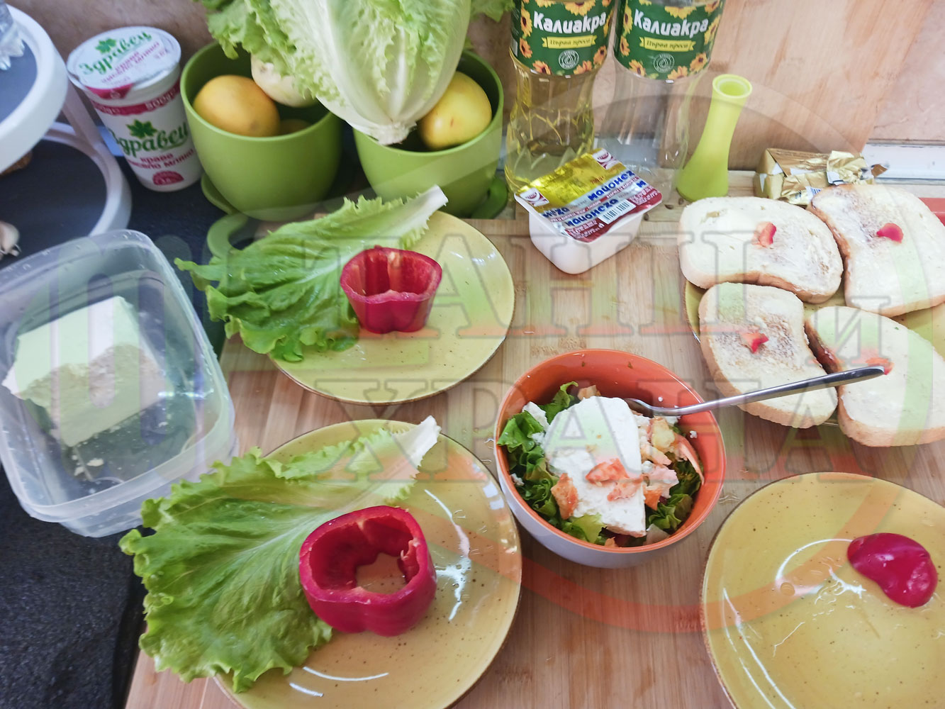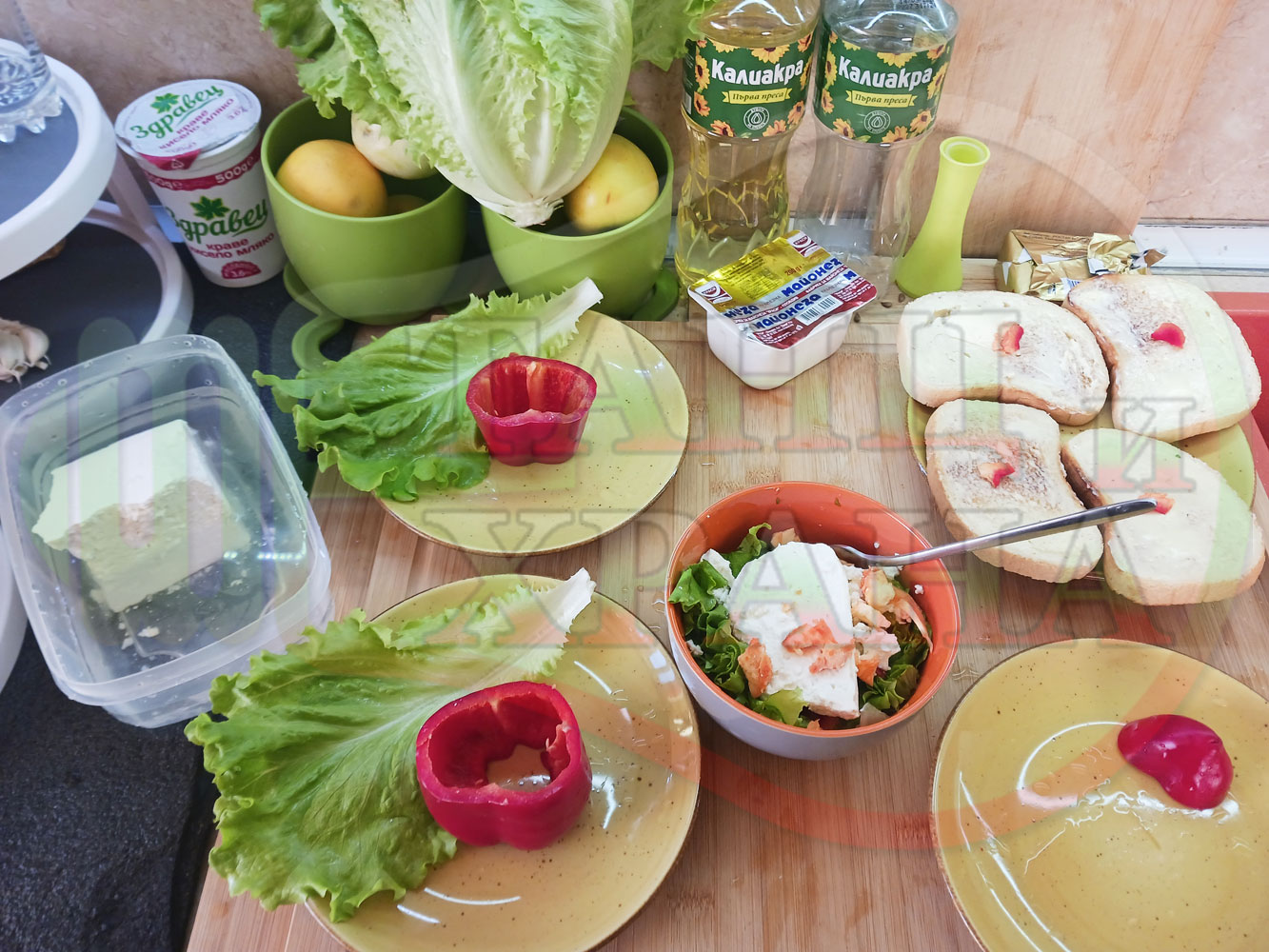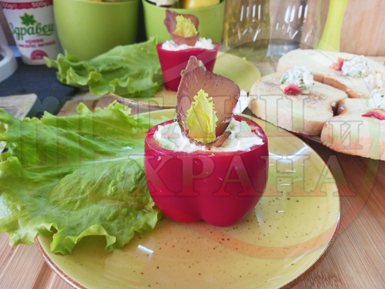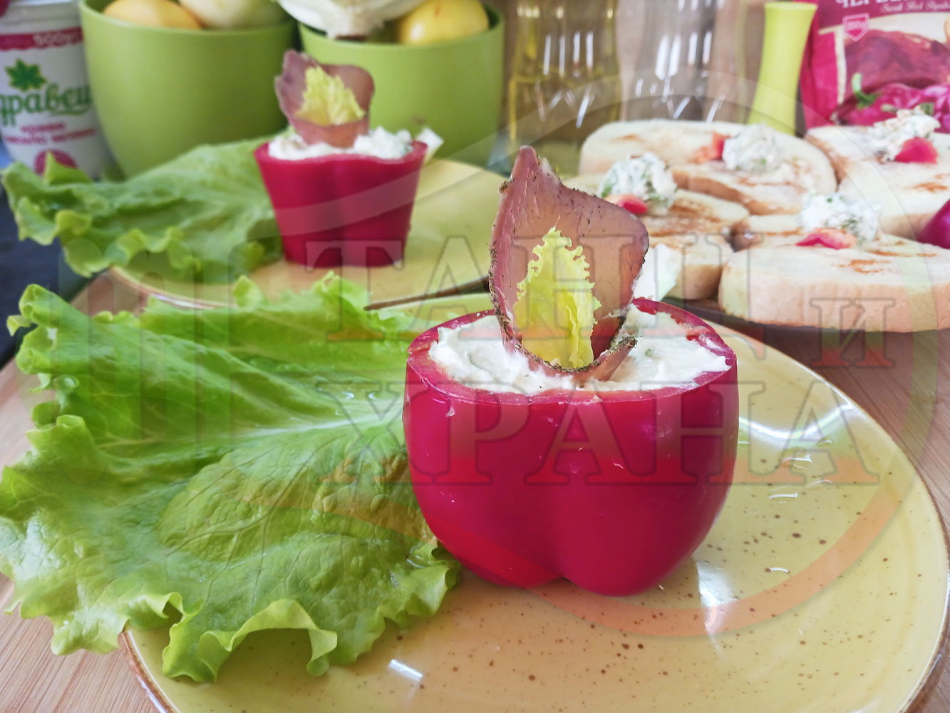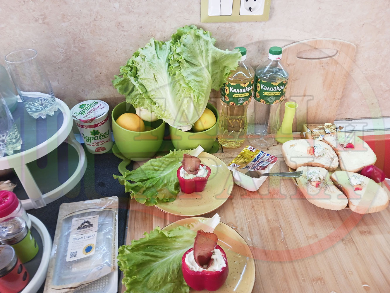 Зеленчукова салата със сурови пълнени чушки"Маруленочервеночушкова майонезена с БГсирене" приготвена от червени пресни пиперки напълнени със сиренов крем с маруля, чесън, майонеза и краве бяло сирене гарнирани с филе "Елена" - двукомпонентна