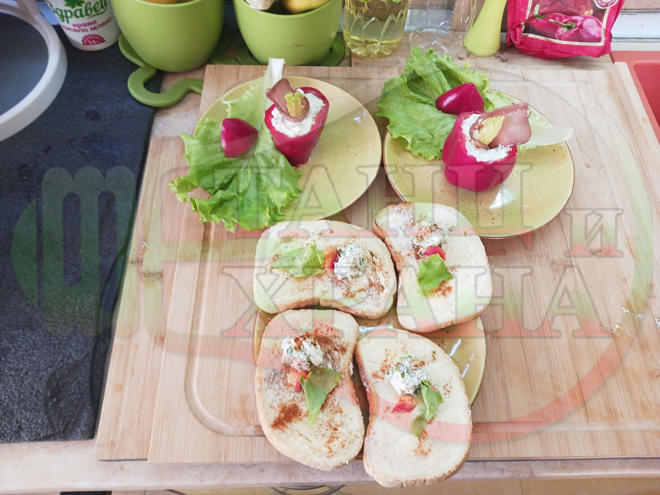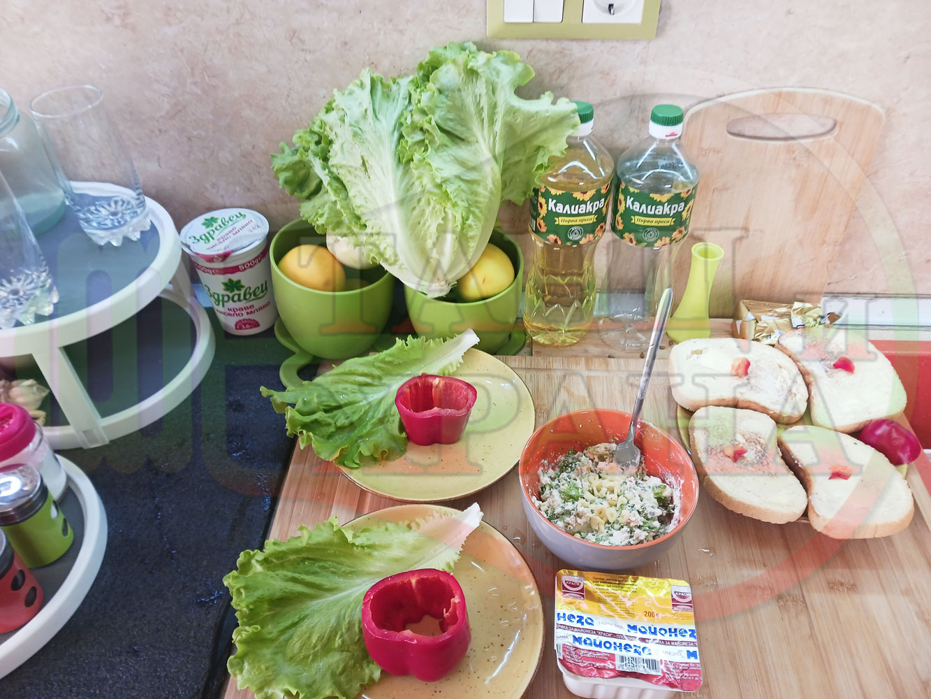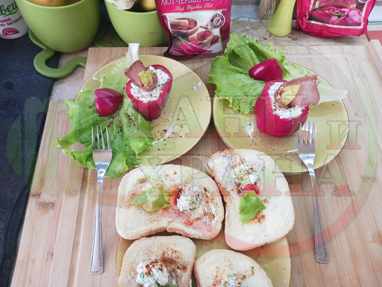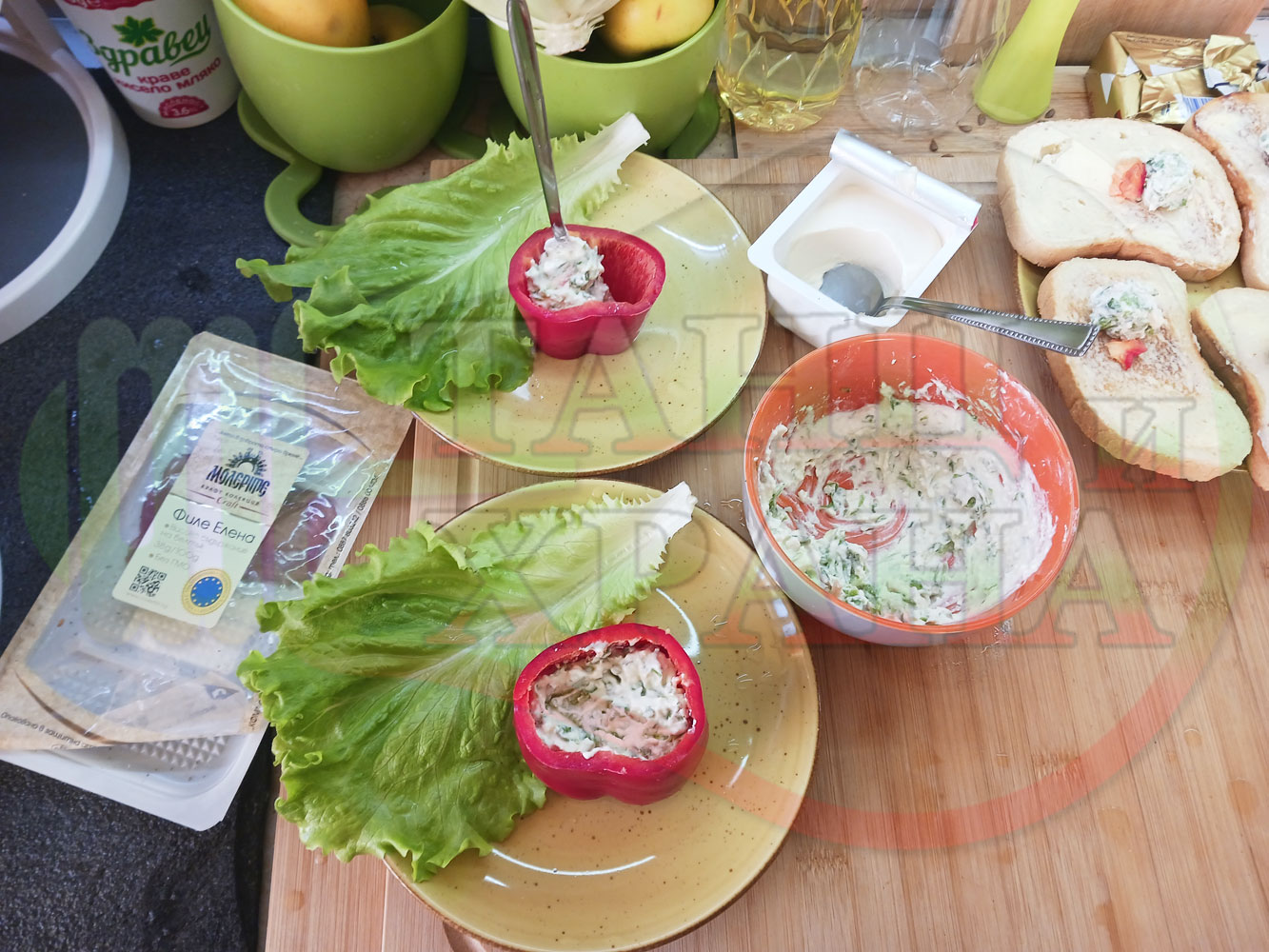 Спретнах за пореден път невероятна вкусно, вкусна, вкусотия (вкуснотия), приготвена от сурови, червени, пресни чушки, напълнени със сиреново марулен майонезен крем от свежа маруля, българско краве бяло, саламурено сирене, стар чесън и майонеза. Гарнирах чушките с любимото ни филе "Елена" навито на фунийки, напълнено с чаена лъжичка от майонезата и украсено с малки, свежи и крехки майонезени листенца.
