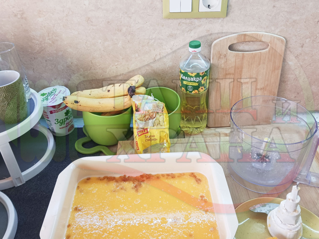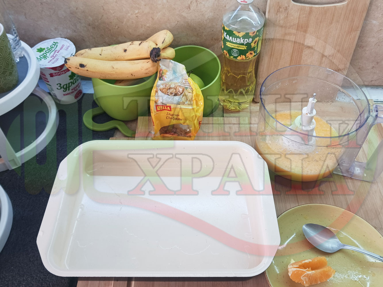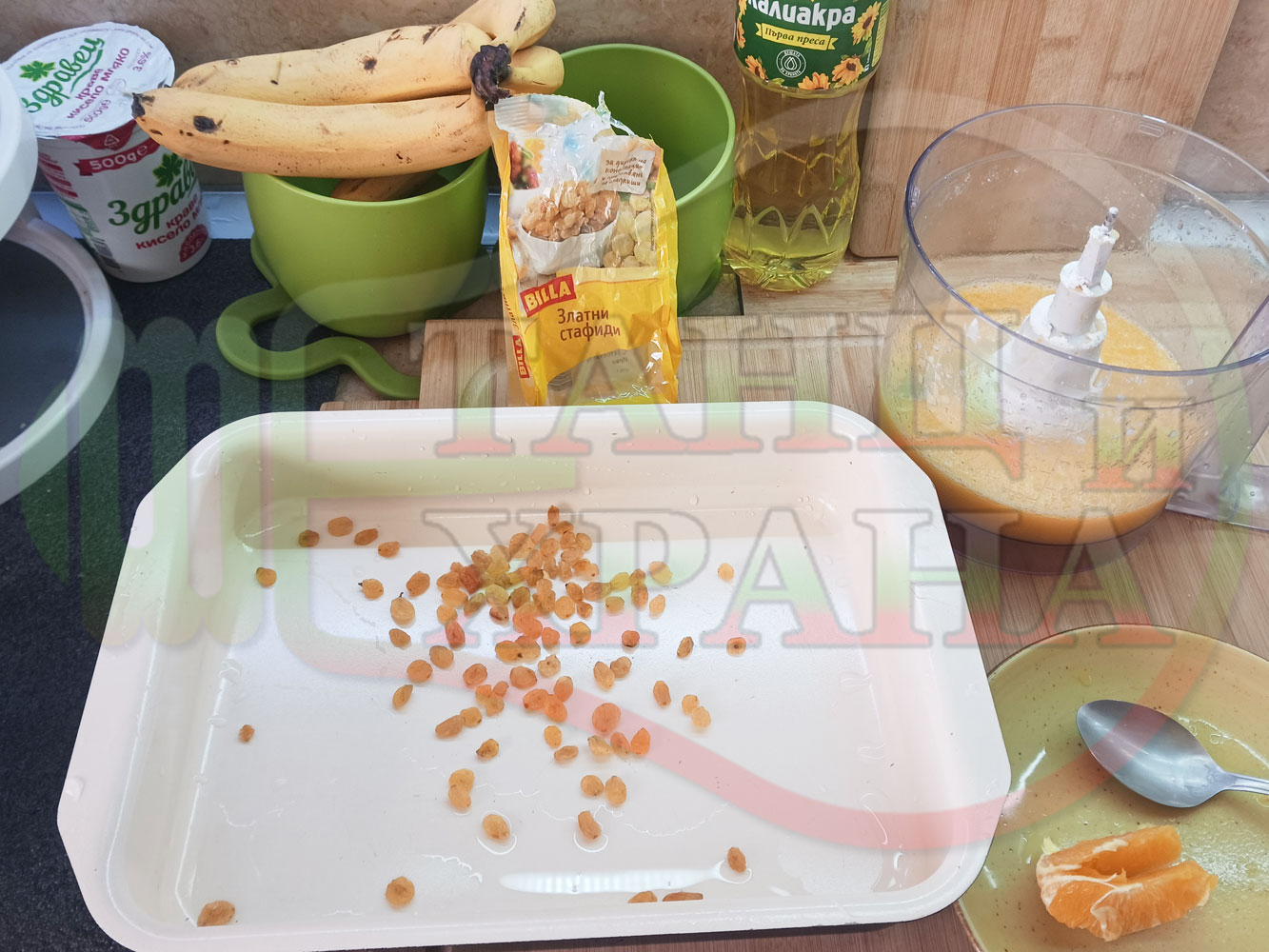 ПРОДУКТИ: Приблизителни количества за български портокалов постен кремообразен кекс "Портокаловостафиден" приготвен с пресни портокали, кристална и пудра захар, нишесте праскова, брашно без набухвател и златни стафиди подходящ за постещи хора